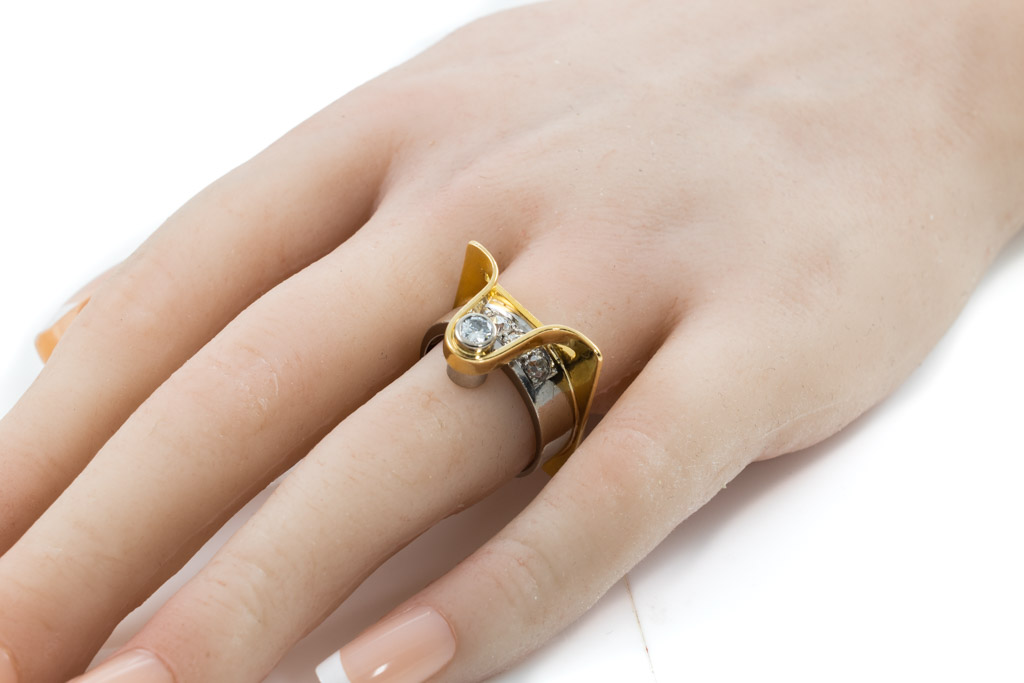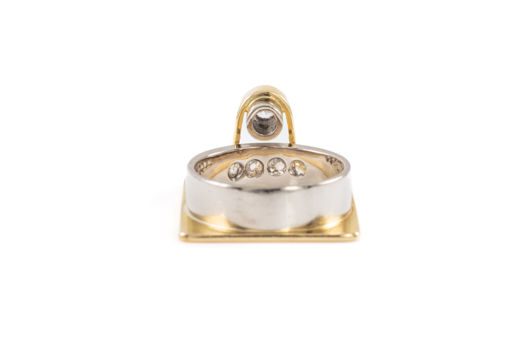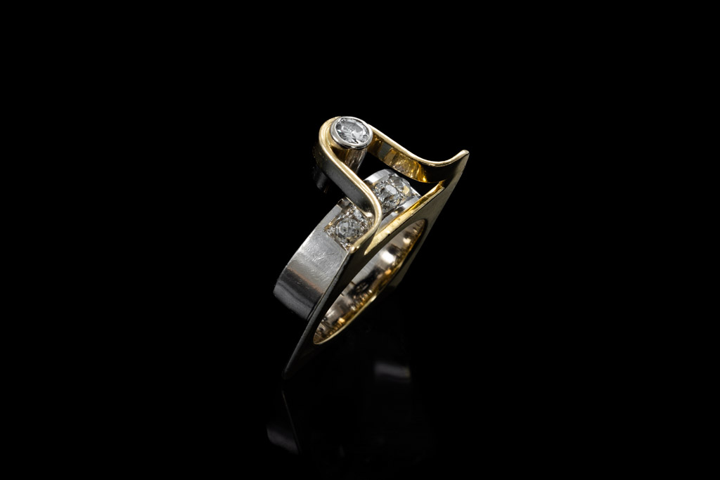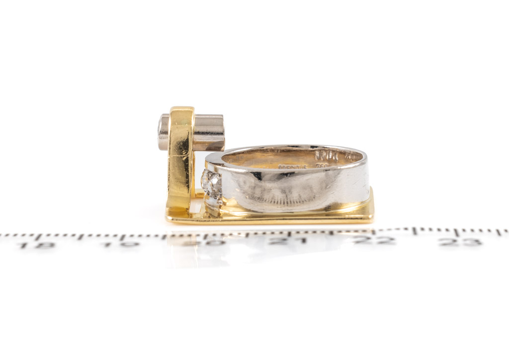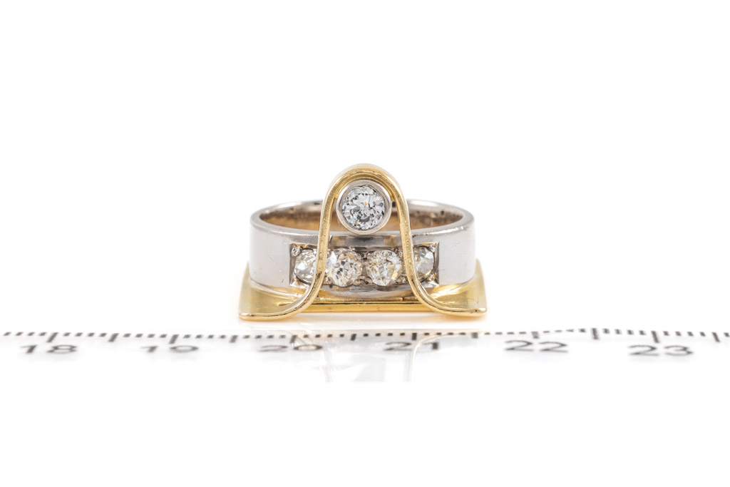 Diamond fancy design ring with 5 round Diamonds totalling 0.78cts (Estimated grading: H, J SI ). 18ct yellow and white gold. Ring size O½ - ring resizing is not recommended. Weight: 13.1g. With copy of the Valuation Certificate dated 08/10/96. (Pre-owned)