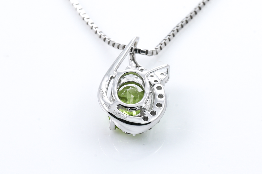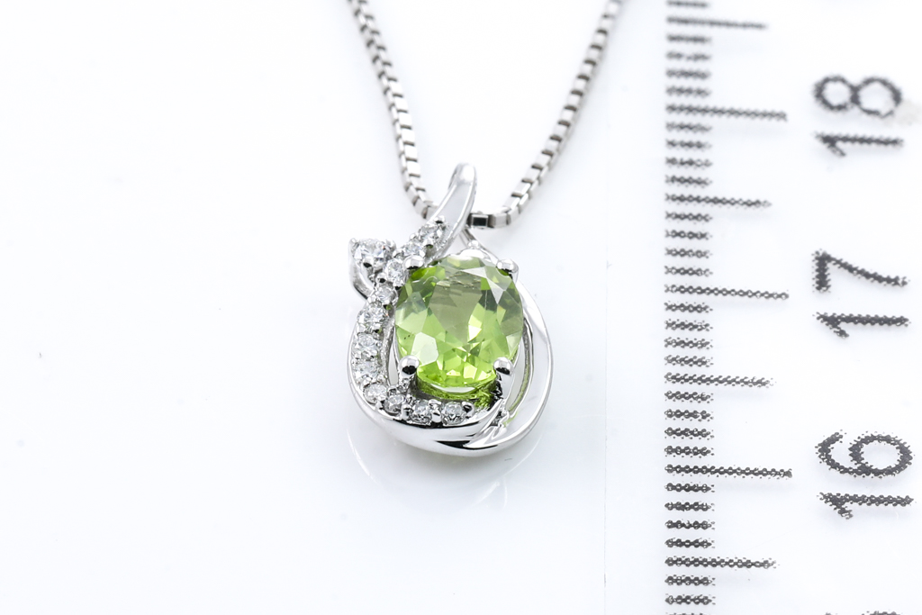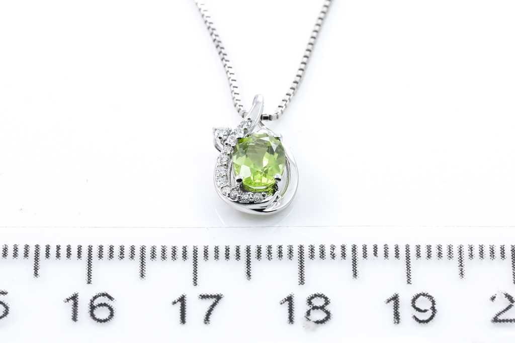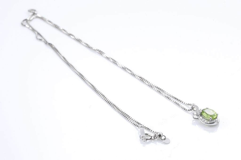 Peridot and Diamond pendant with oval shape Peridot of 0.78ct and round Diamond totalling 0.10cts. 18ct white gold with 45cm 18ct white gold adjustable chain. Weight: 3.1g. (Pre-owned)