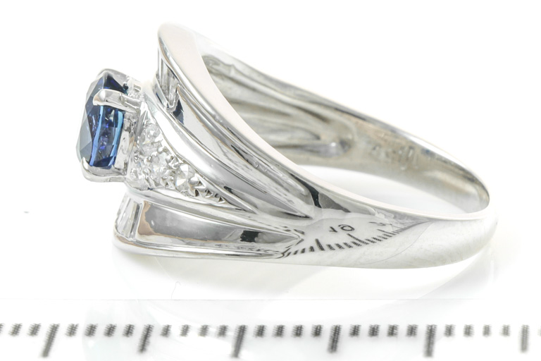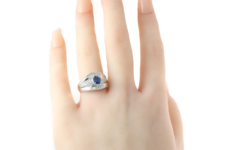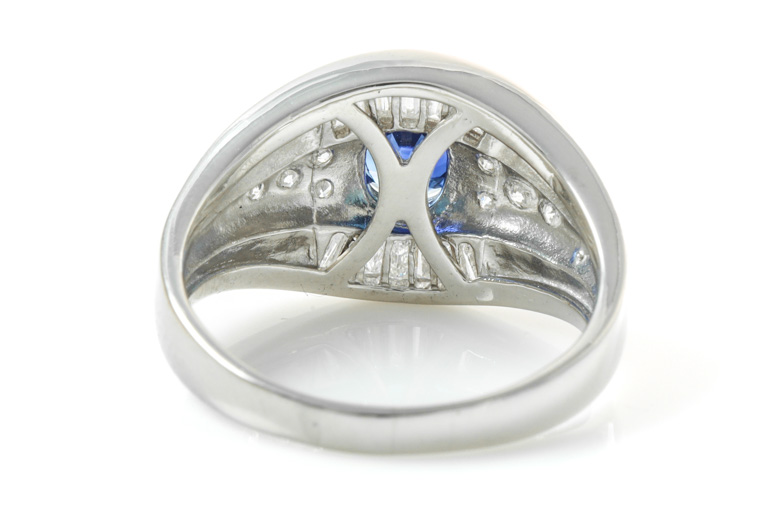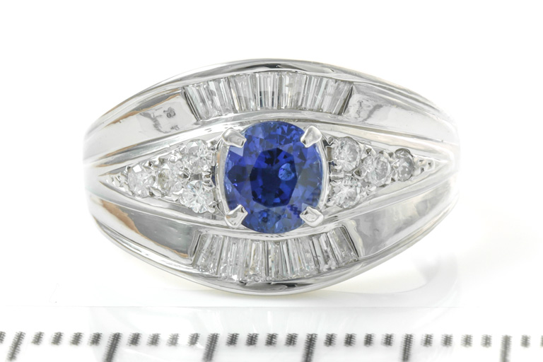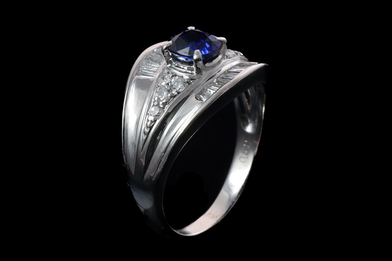 Sapphire and Diamond ring with an oval blue Sapphire of 0.78ct and round & baguette cut Diamonds totalling 0.24cts. Platinum-900. Ring size: N1/2. Weight: 7.7g (Pre-owned)