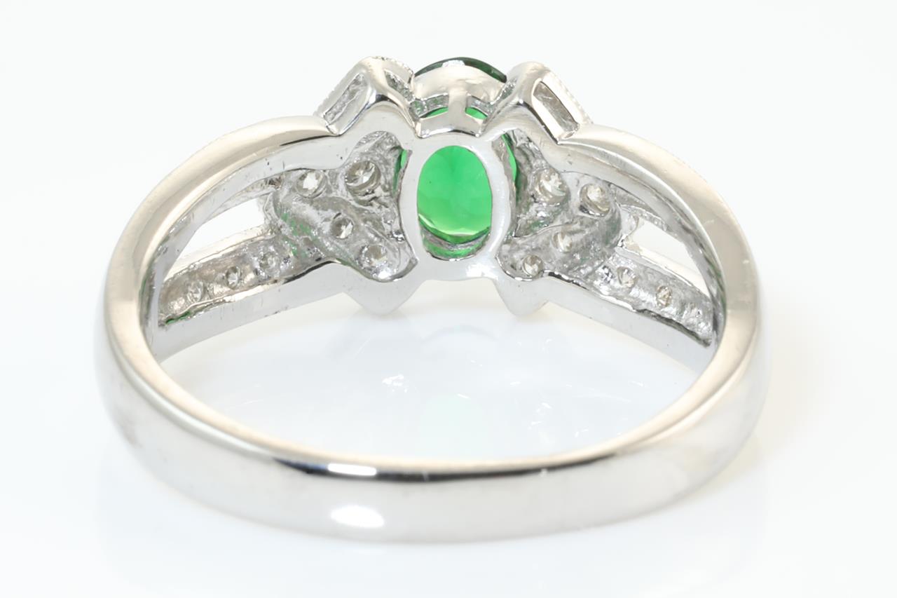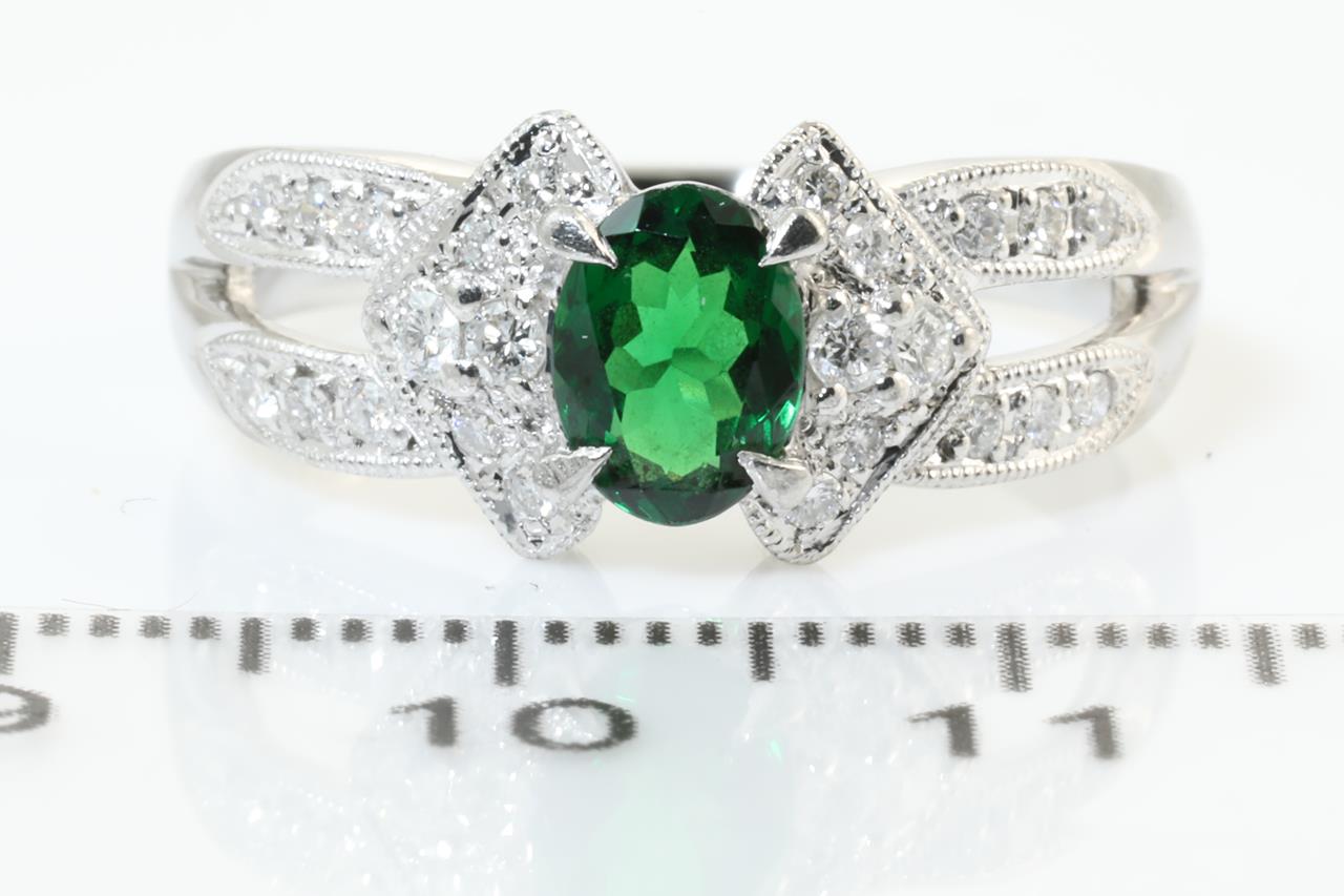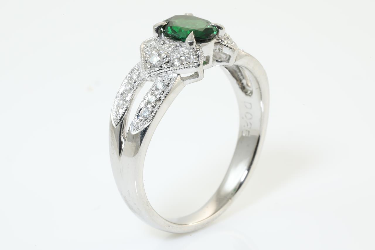 Tsavorite and Diamond ring with oval cut Tsavorite of 0.78ct and Diamonds totalling 0.25cts. Platinum. Ring size: P. Weight: 6.8g (Pre-owned)