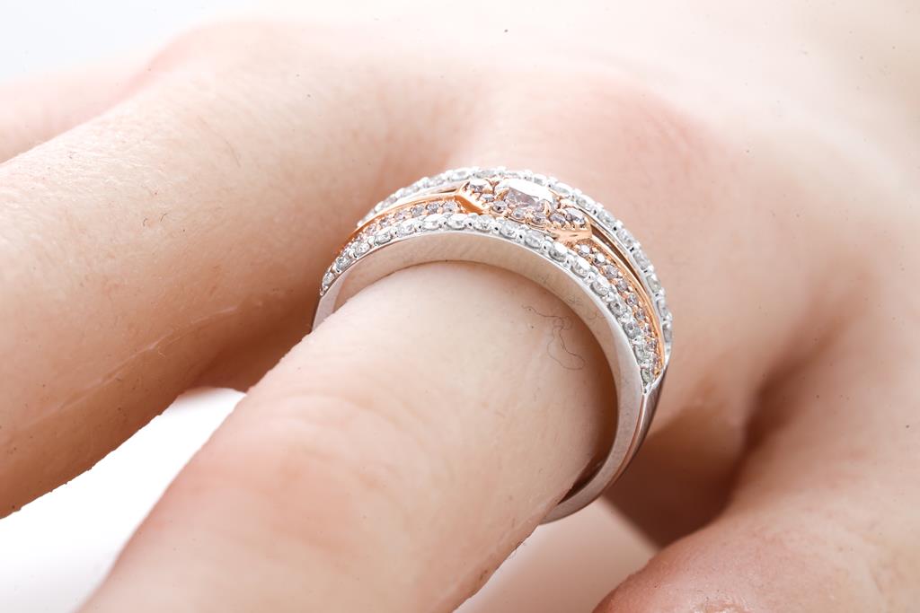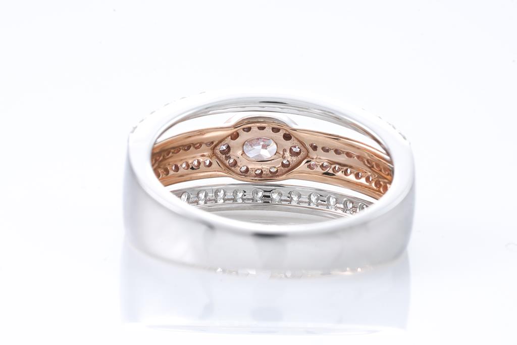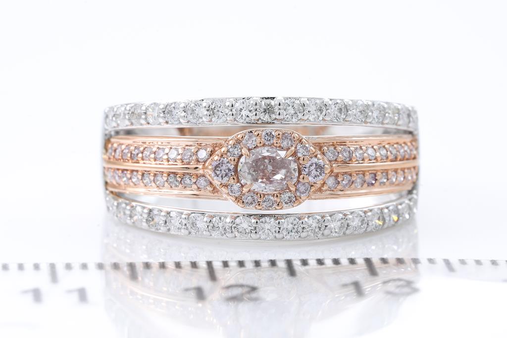 Diamond ring with oval pink Diamonds of 0.15ct and round Diamonds totalling 0.64cts (Estimated grading: Light Pink, H SI) . 18ct rose gold and white gold. Ring size N, Note: ring resizing is not recommended. Weight: 5.0g. (As new)