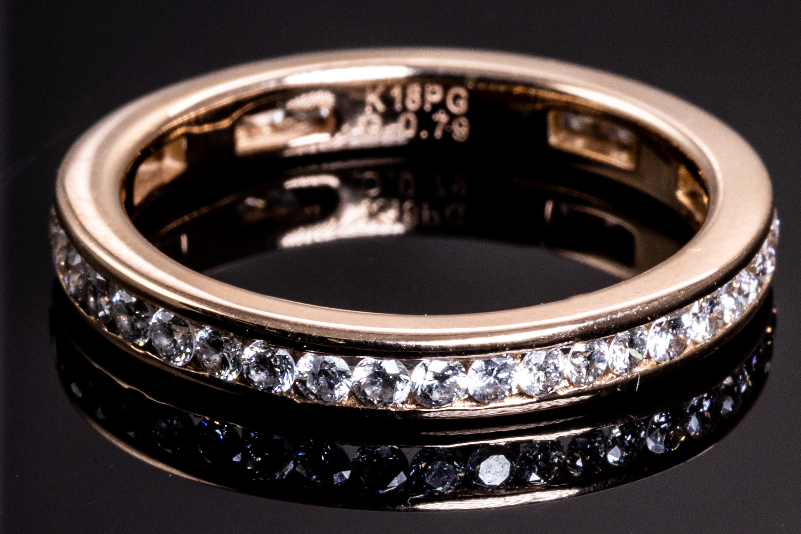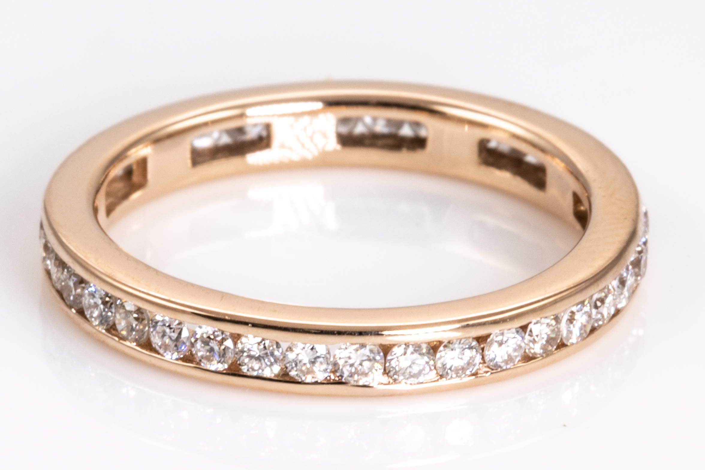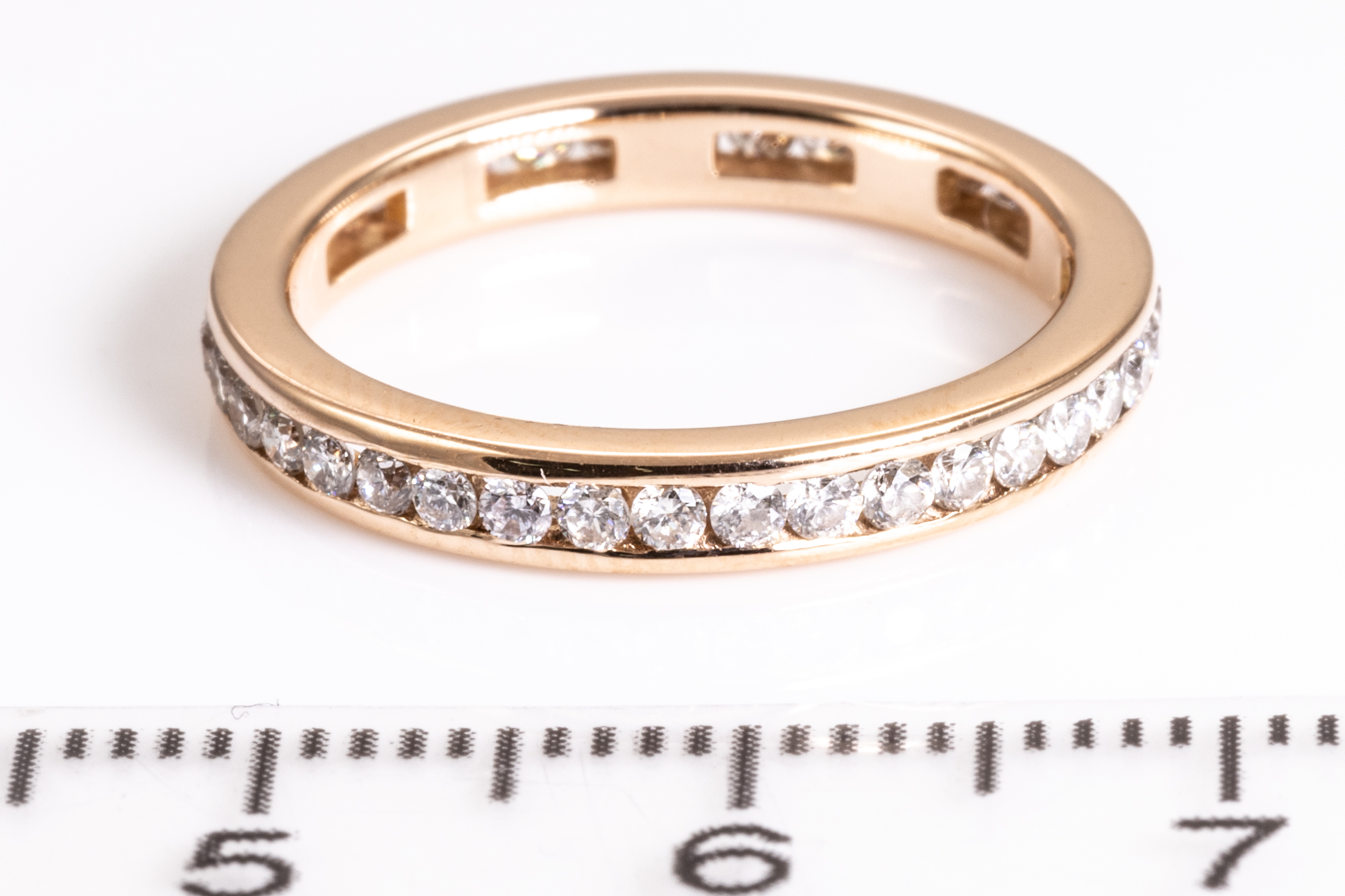 Diamond eternity ring with round Diamonds totalling 0.79cts (Estimated grading: H-I SI). 18ct yellow gold. Ring size L1/2 - resizing is not recommended. Weight: 3g. (Pre-owned)