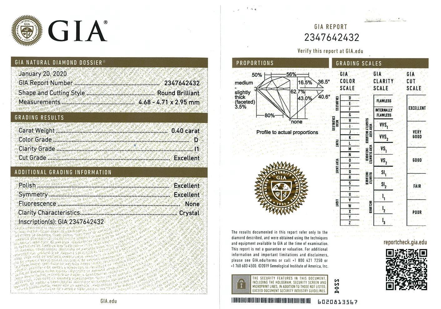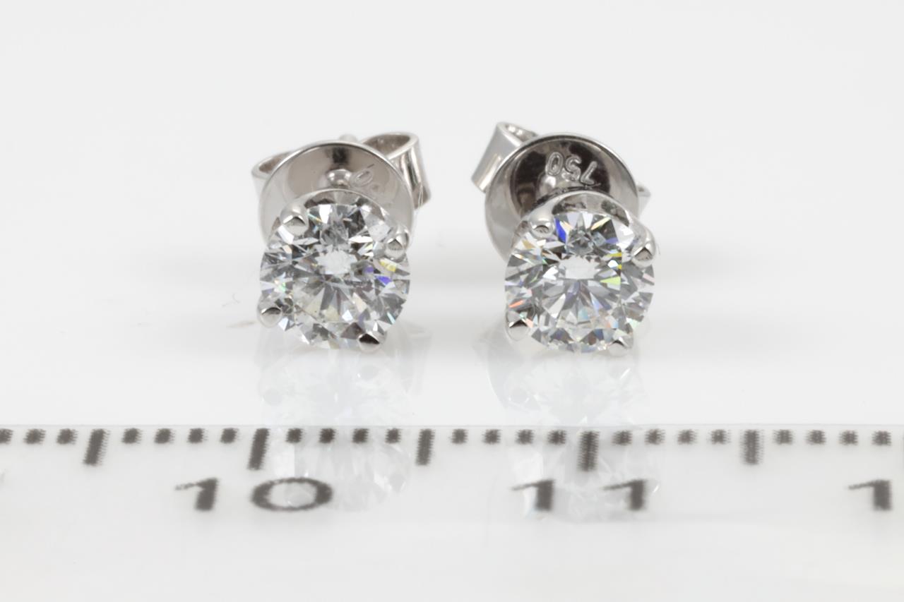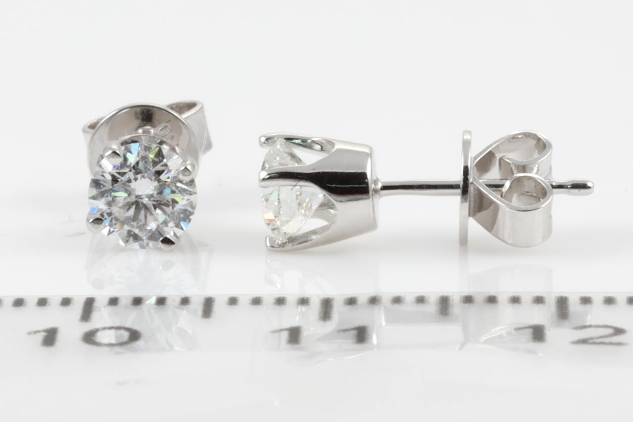 Diamond stud earrings with 2 round brilliant cut Diamonds totalling 0.80cts (with GIA reports graded as D P1 #2347642432, 7331917372). 18ct white gold. Weight: 1.5g. (New).