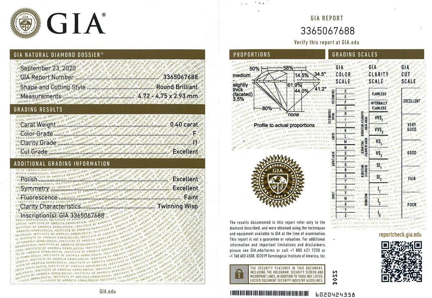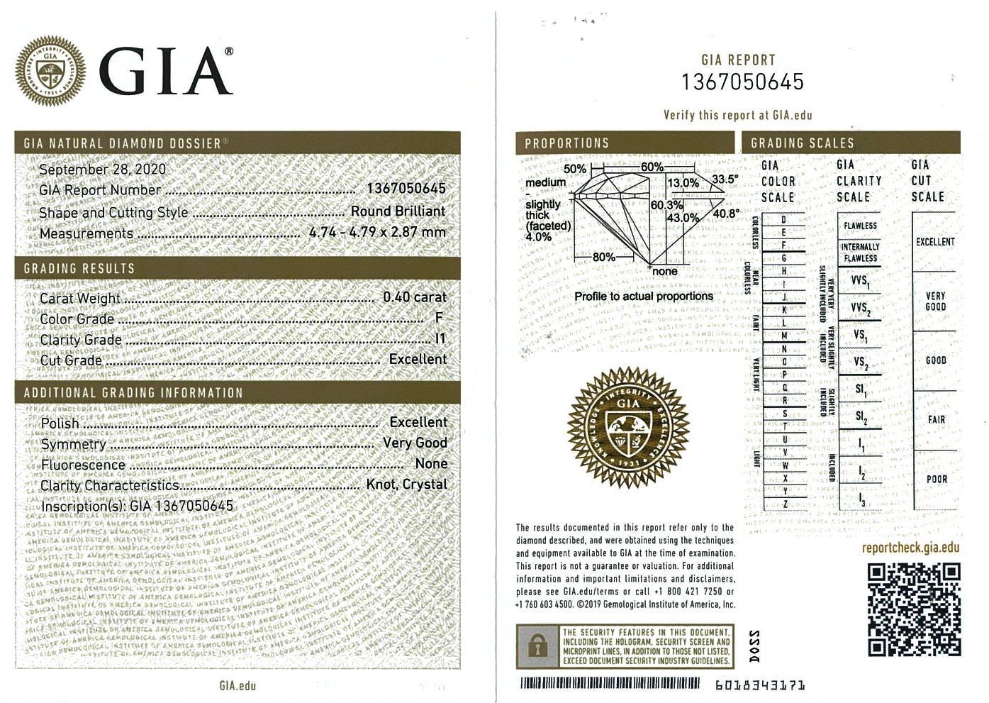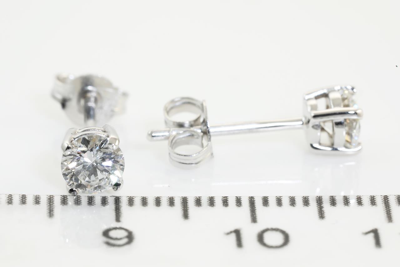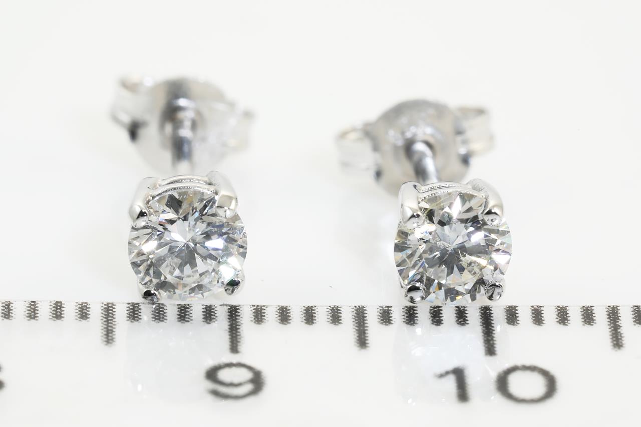Diamond stud earrings with 2 round brilliant cut Diamonds totalling 0.80cts (with GIA reports graded as F P1 #3365067688, 1367050645). 18ct white gold. Weight: 1.5g. (New).
