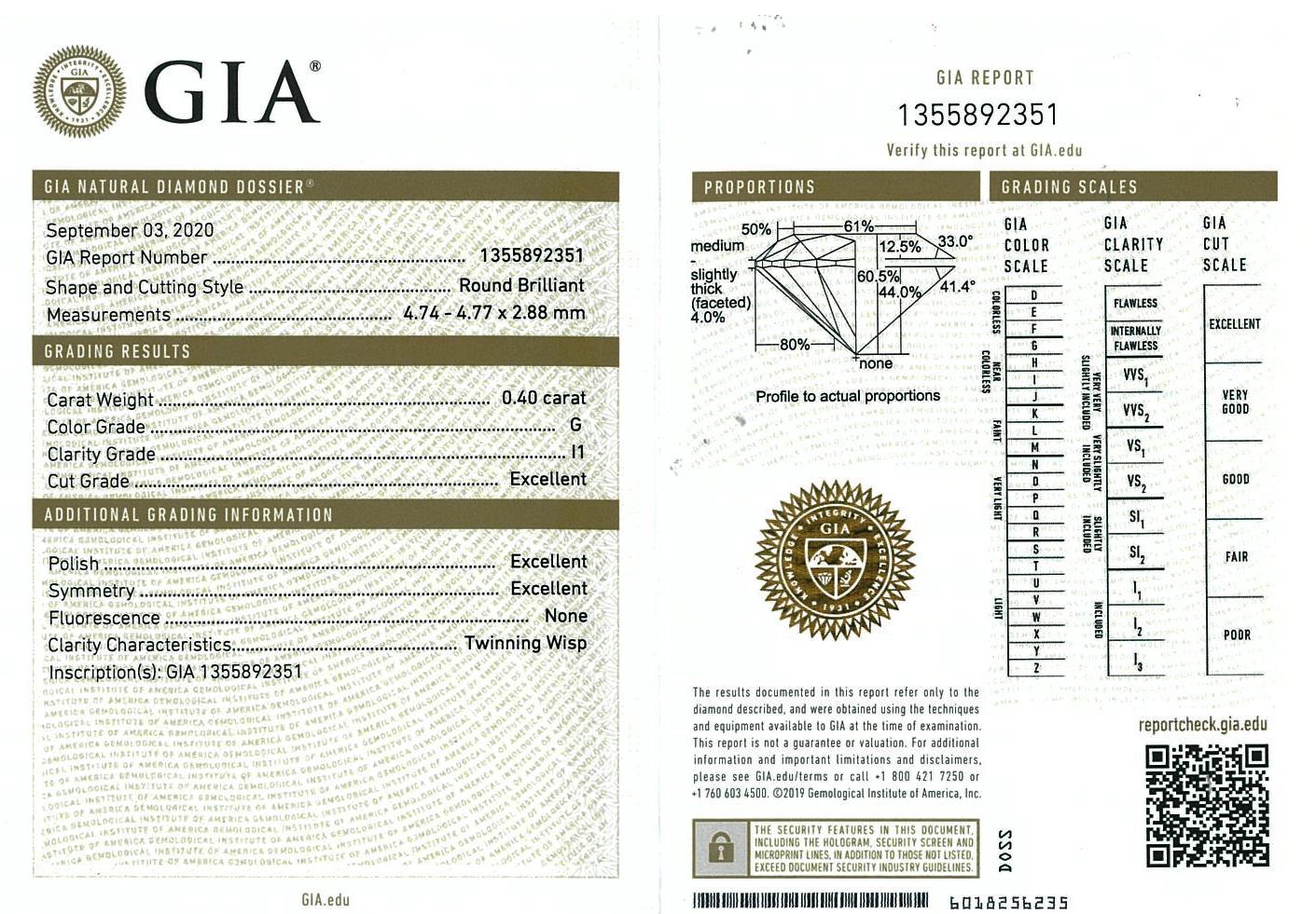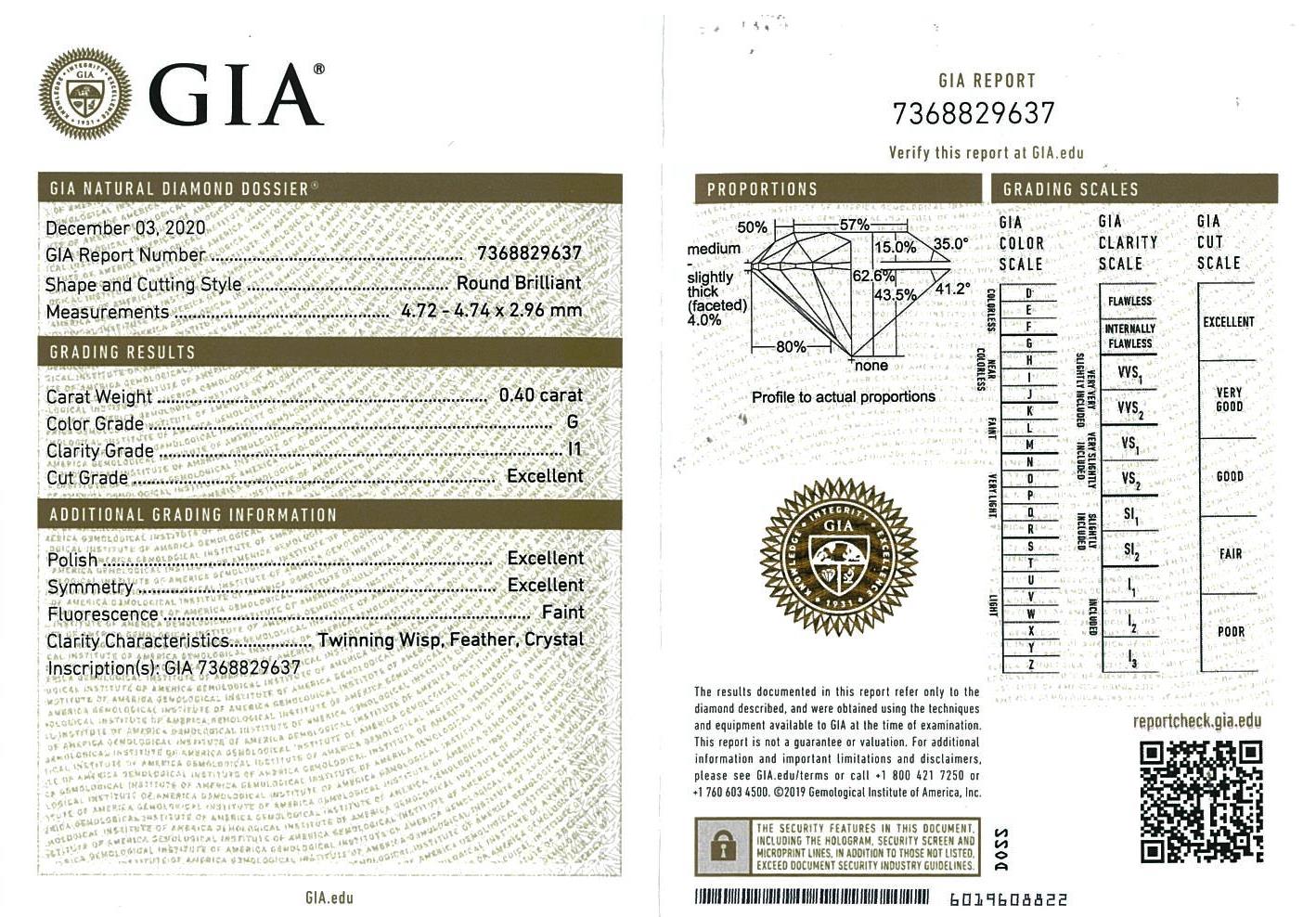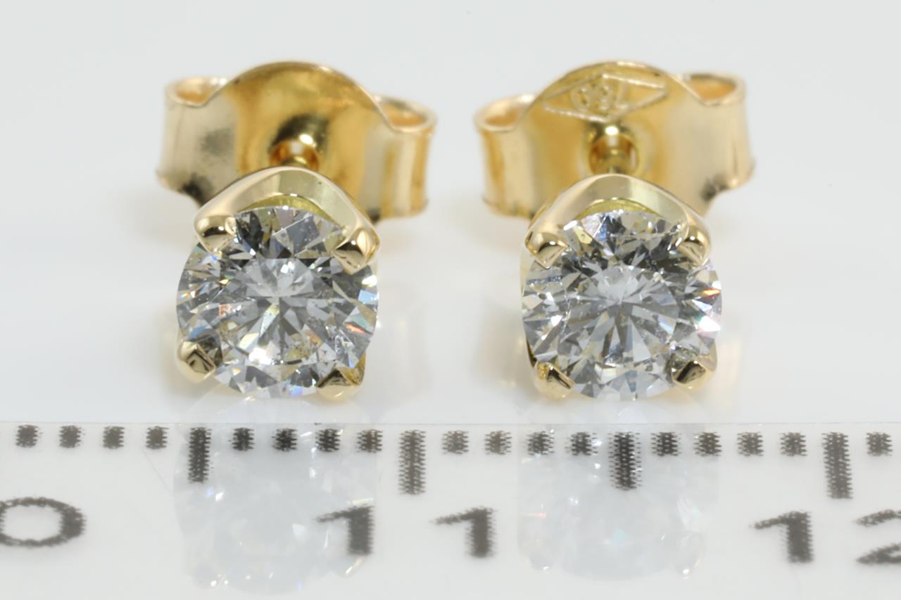 Diamond stud earrings with 2 round brilliant cut Diamonds totalling 0.80cts (with GIA reports graded as G P1 #1355892351, 7368829637). 18ct yellow gold. Weight: 1.5g. (New).