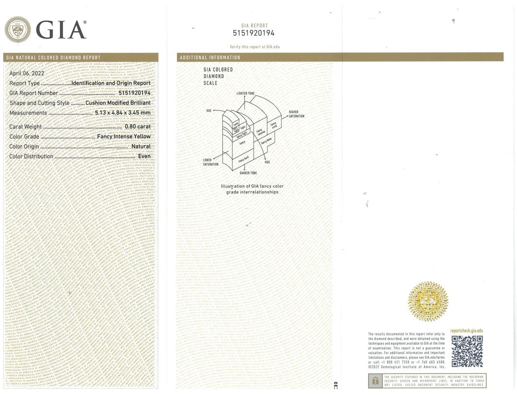 A loose cushion cut Diamond of 0.80ct (with GIA report graded as Natural Fancy Intense Yellow Even#5151920194). (New)