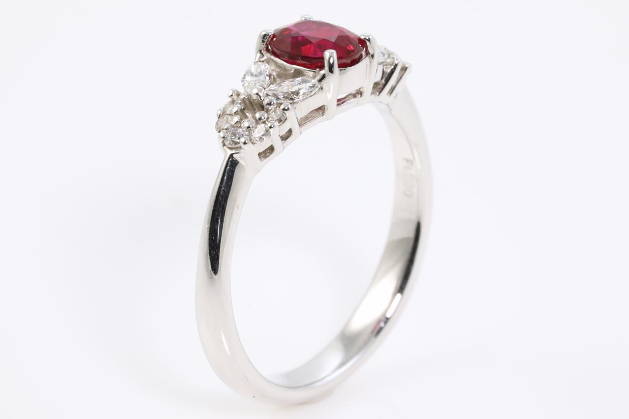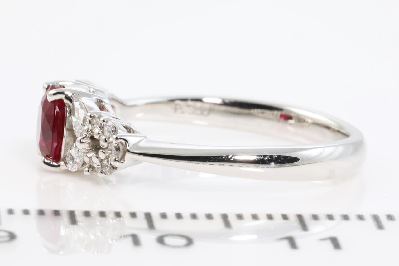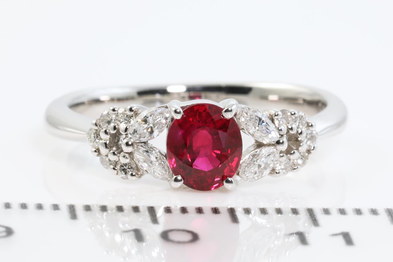 Ruby and Diamond ring with oval shape Ruby of 0.80ct with round and marquise cut Diamonds totalling 0.27cts. Platinum. Ring size: L1/2. Weight: 4.4g (Pre-owned)