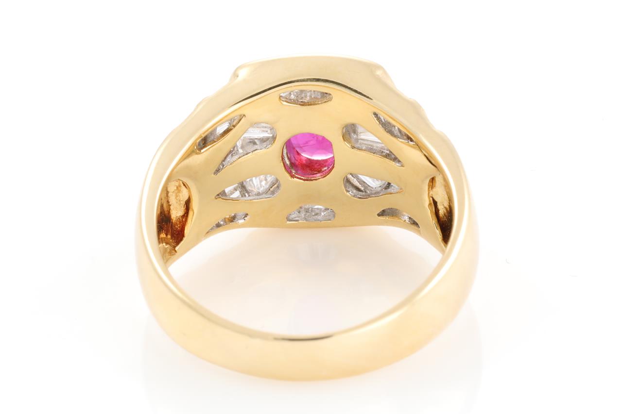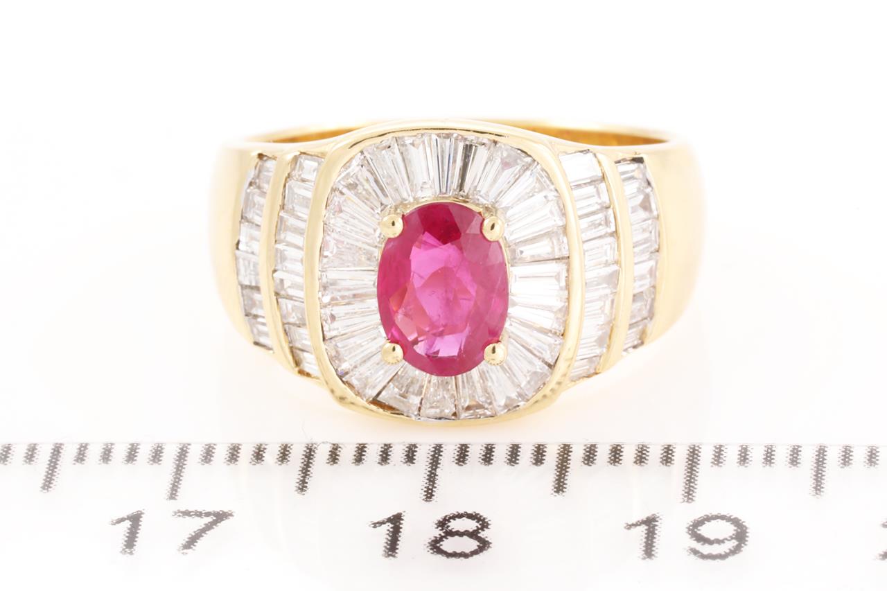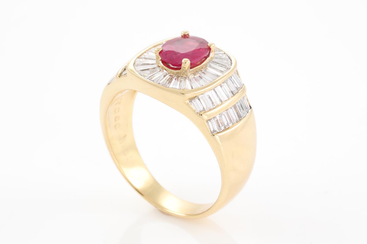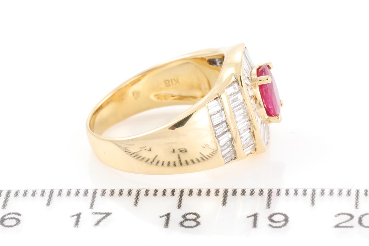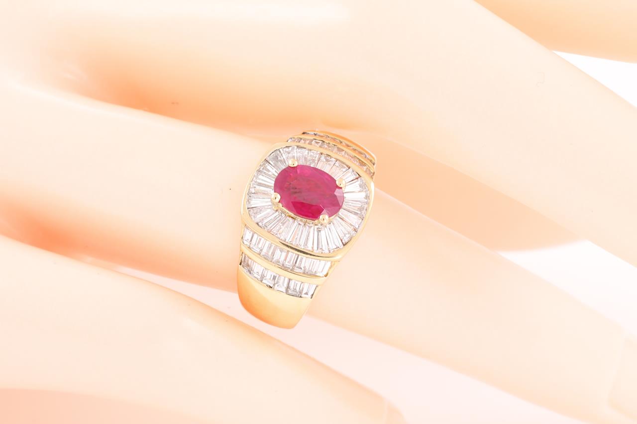 Ruby and Diamond ring with an oval Ruby of 0.80ct and baguette cut Diamonds totalling 1.52cts (Estimated grading: G VS-SI). 18ct yellow gold. Ring size M - ring resizing is not recommended. Weight: 6.9g. (Pre-owned)