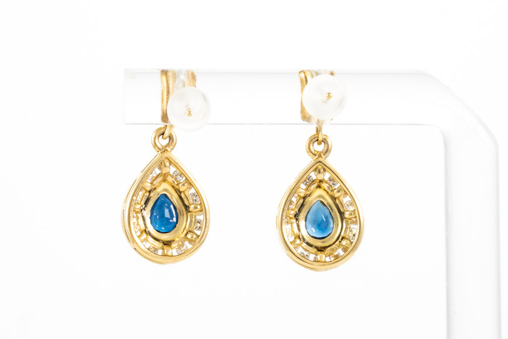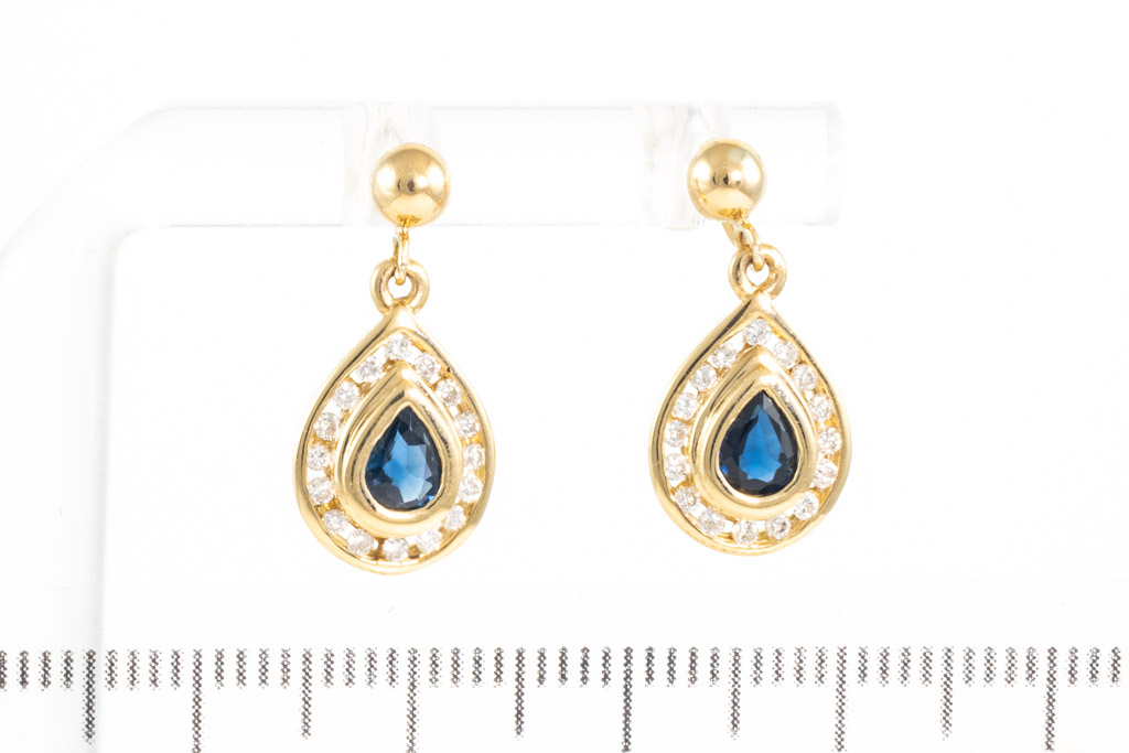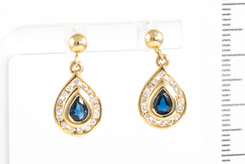 Sapphire and Diamond earrings with 2 pear shape blue Sapphires totalling 0.80cts and round Diamonds totalling 0.32cts (Estimated grading: H SI). 18ct yellow gold with silicon backs. Weight: 3.3g. (Pre-owned)