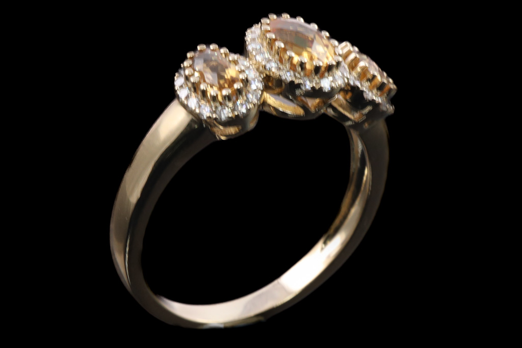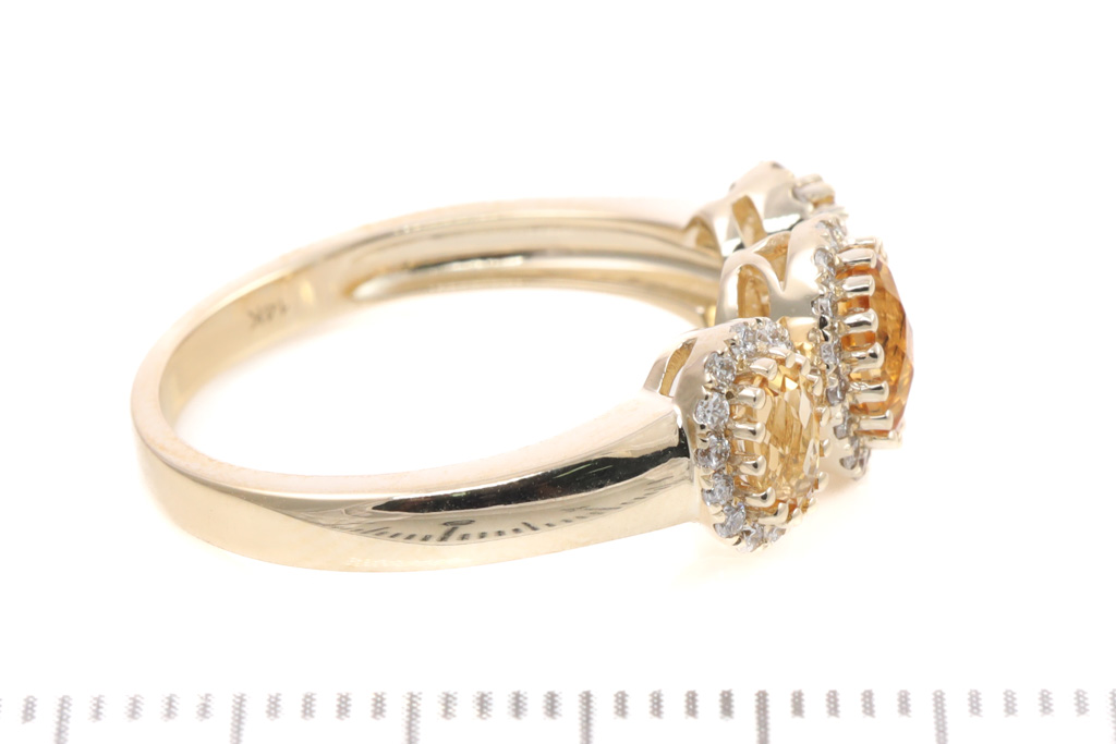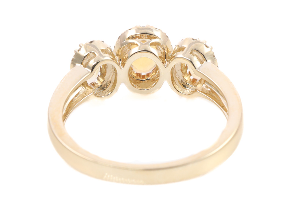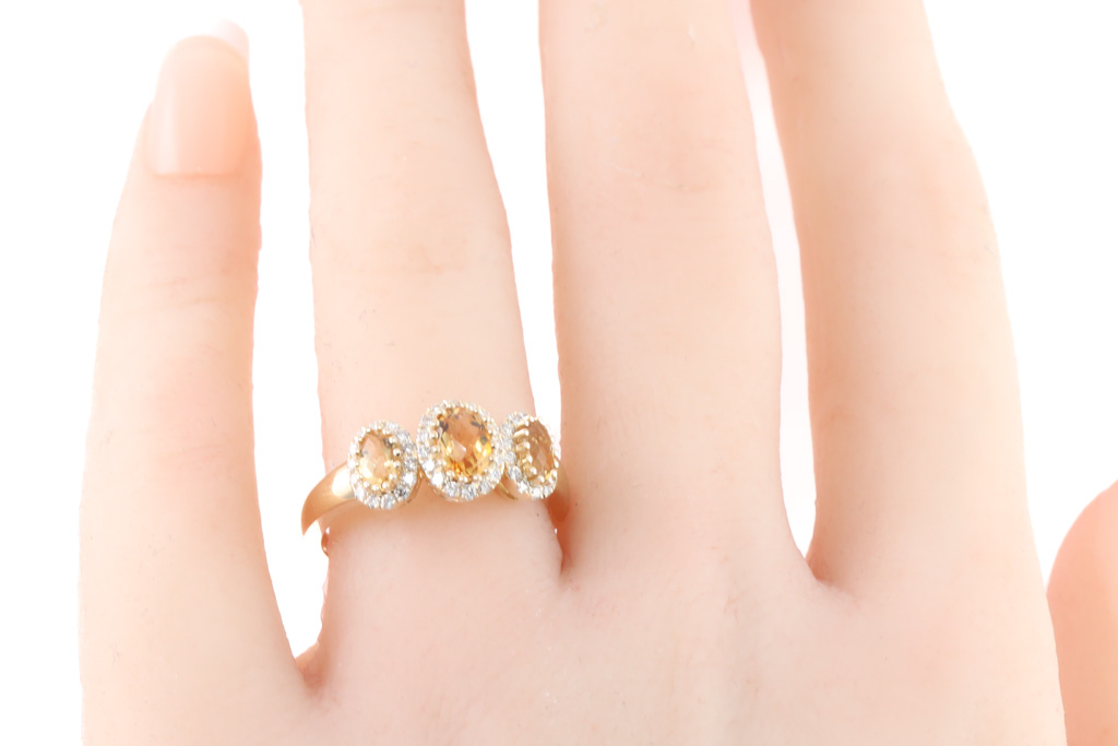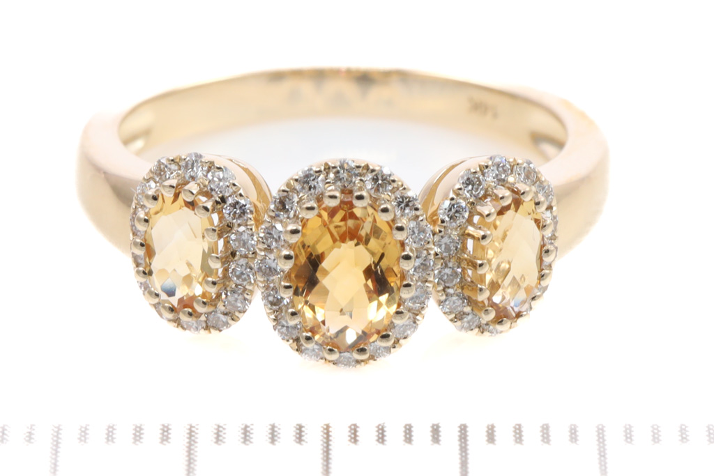 Citrine and Diamond ring with 3 oval checkerboard Citrine totalling 0.81ct and round Diamonds totalling 0.27cts. 14ct yellow gold. Ring size N. Weight: 3.8g. (New)
