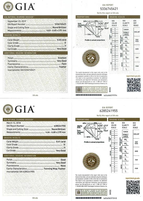 Diamond stud earrings with 2 round brilliant cut Diamonds totalling 0.81cts (with GIA reports graded as D P1 #6285241955, 5336745421). 18ct yellow gold. Weight: 1.5g. (New).