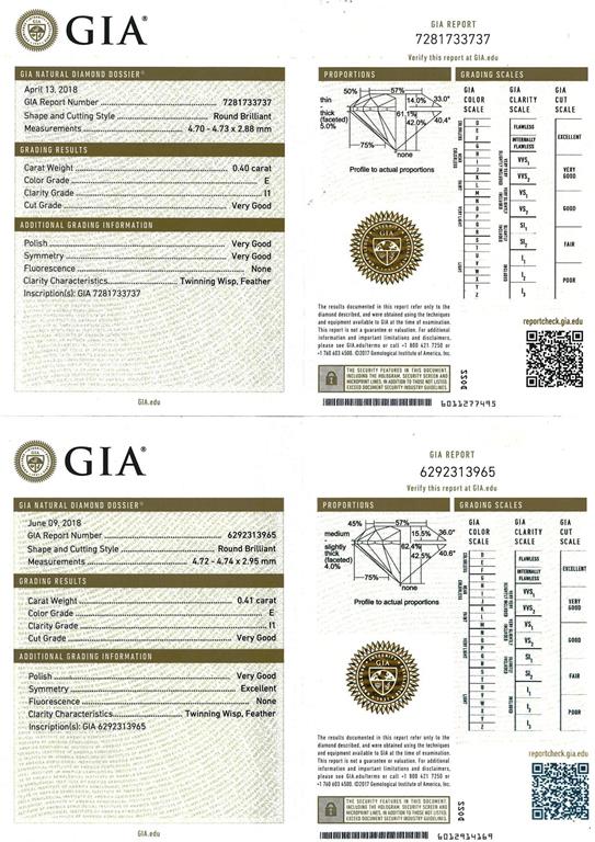 Diamond stud earrings with 2 round brilliant cut Diamonds totalling 0.81cts (with GIA reports graded as E P1 #6292313965, 7281733737). 18ct white gold. Weight: 1.5g. (New).