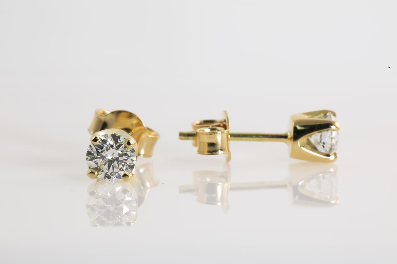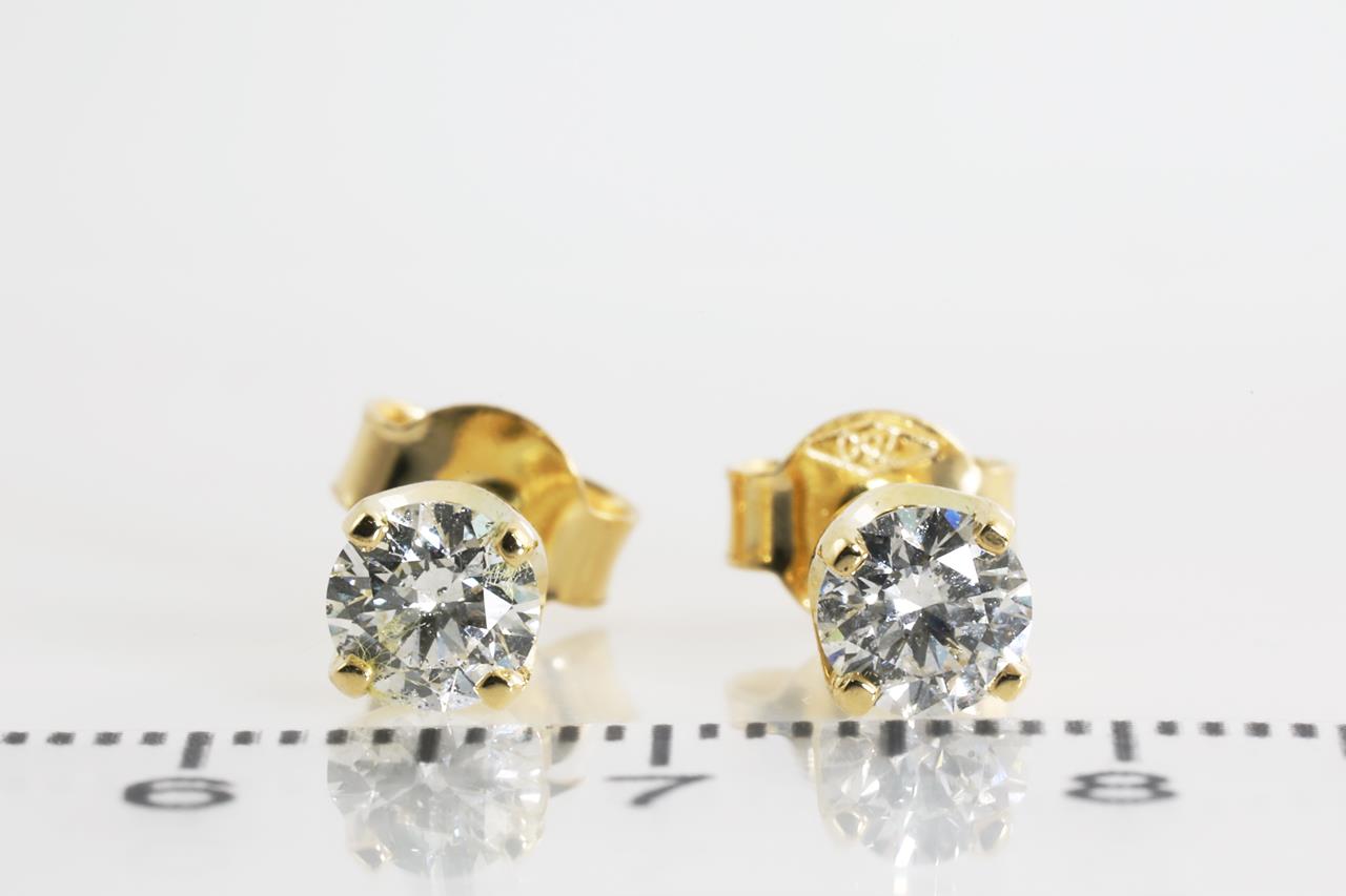 Diamond stud earrings with 2 round brilliant cut Diamonds totalling 0.81cts (with GIA reports graded as G P1 #6355630223, 1355981927). 18ct yellow gold. Weight: 1.8g. (New).
