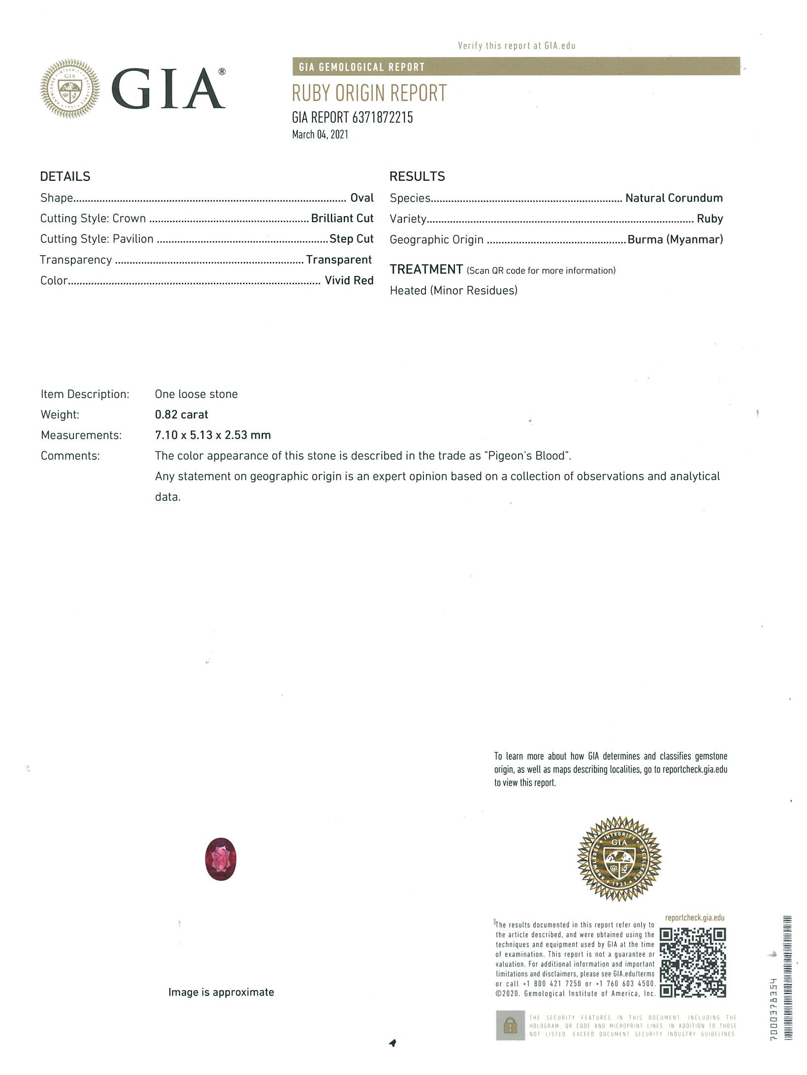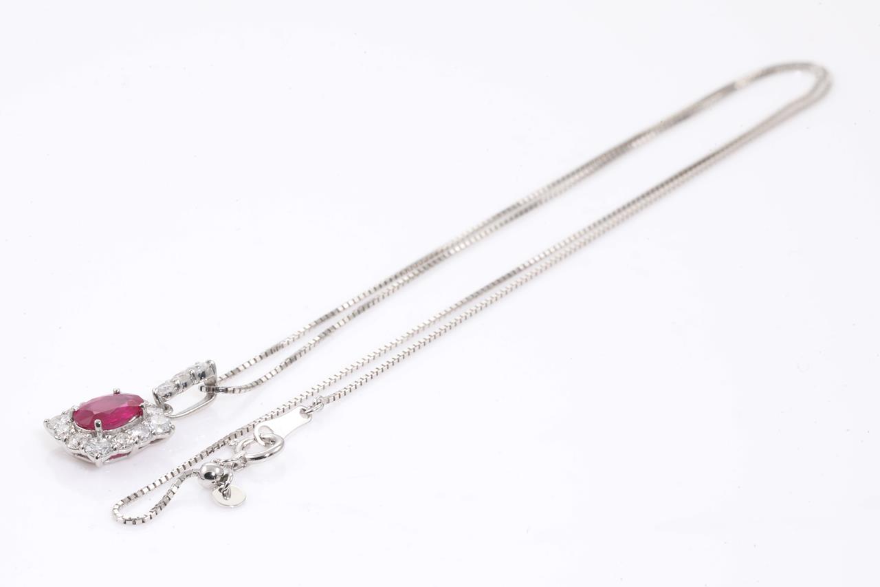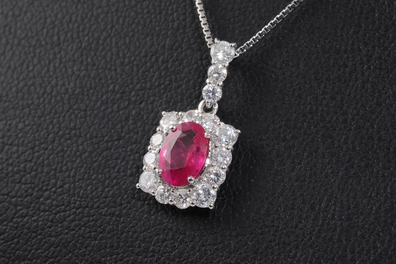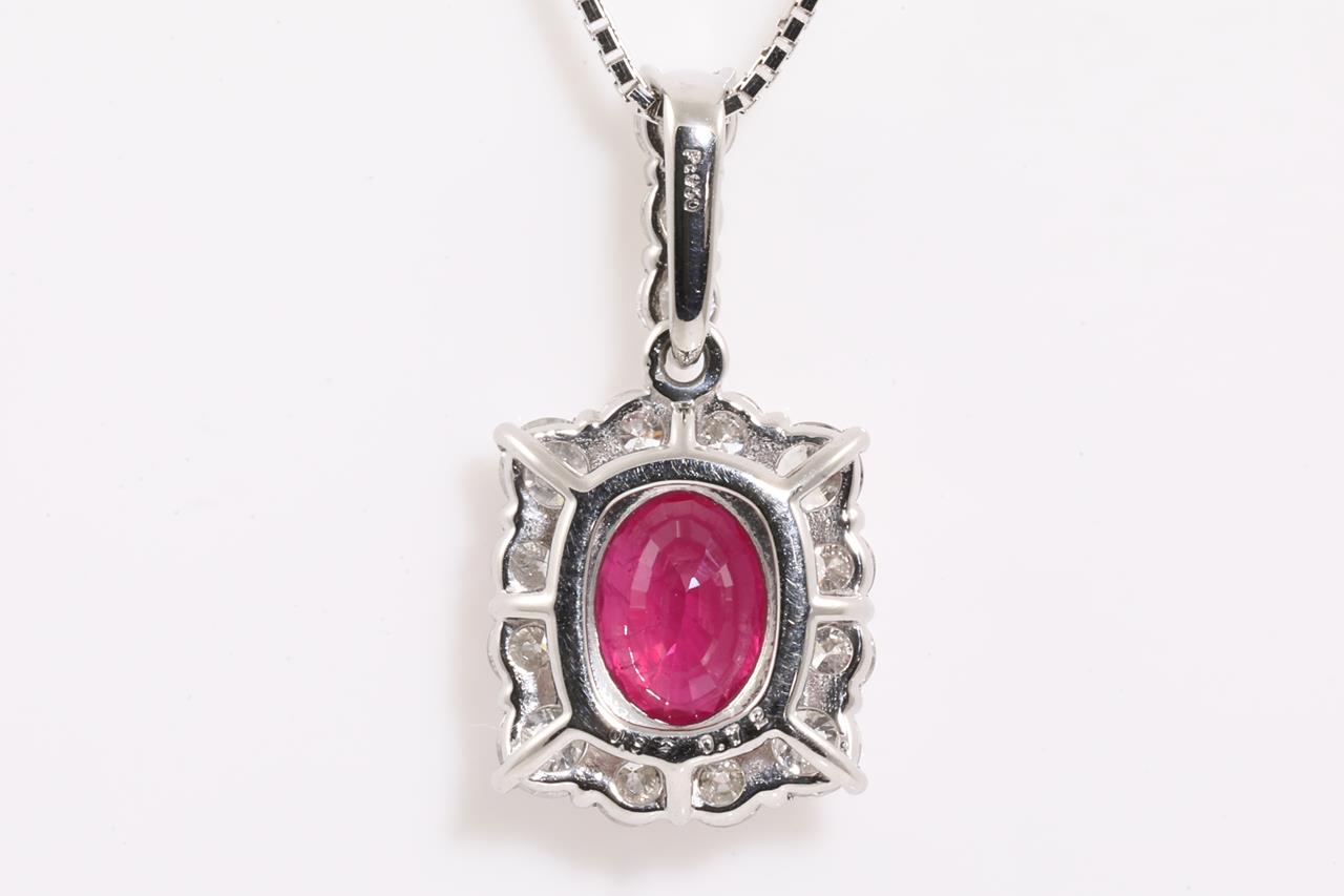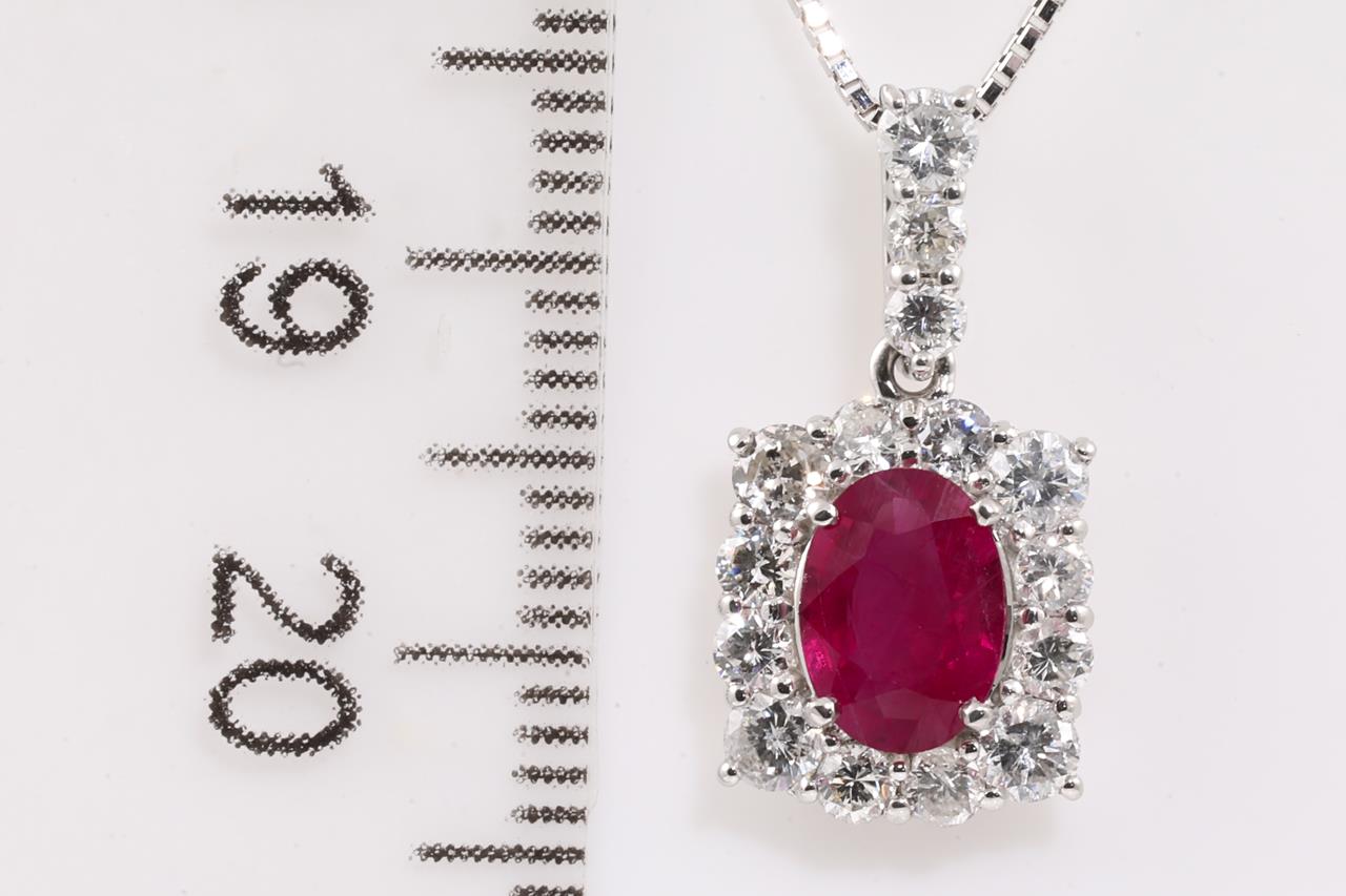Ruby and Diamond pendant with an oval shape Pigeon's Blood Burmese Ruby of 0.82cts (with GIA report #6371872215) and round Diamonds totalling 0.72cts (Estimated grading: H-I SI-P1). Platinum with 18ct white gold 44cm adjustable chain. Weight: 3.7g. (Pre-owned)