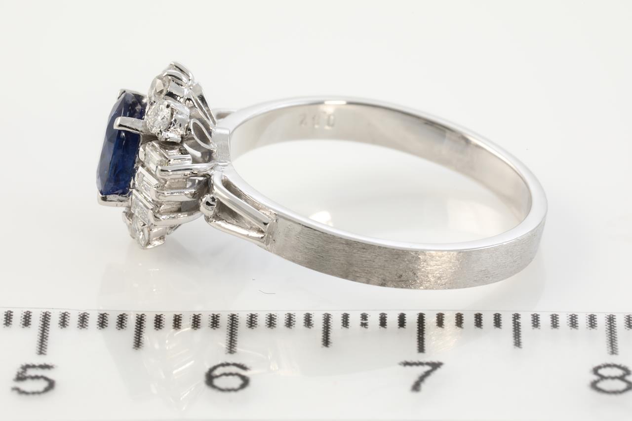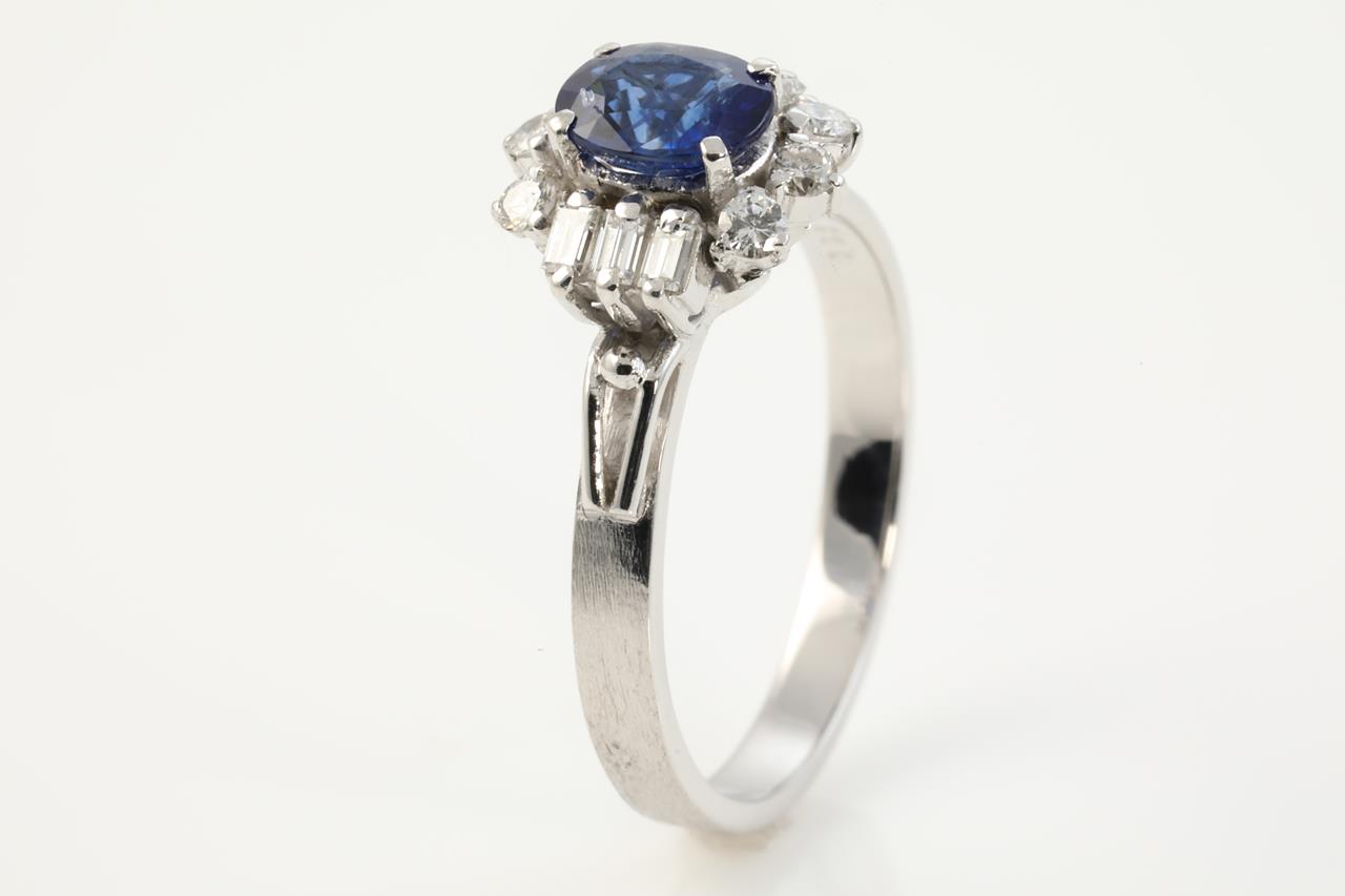 Sapphire and Diamond ring with oval shape Sapphire of 0.82ct and Diamonds totalling 0.23cts. Platinum. Ring size: L1/2. Weight: 4.3g (Pre-owned)