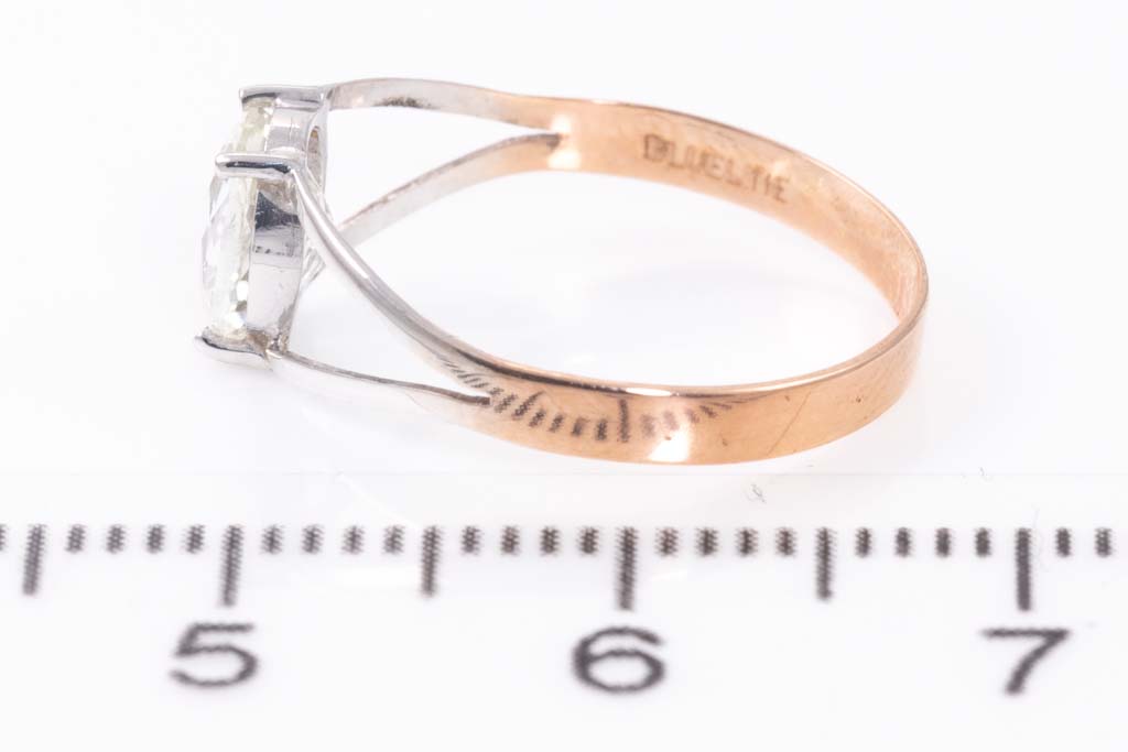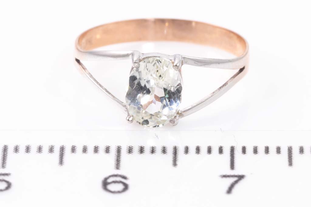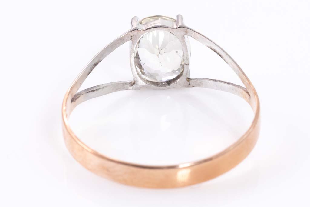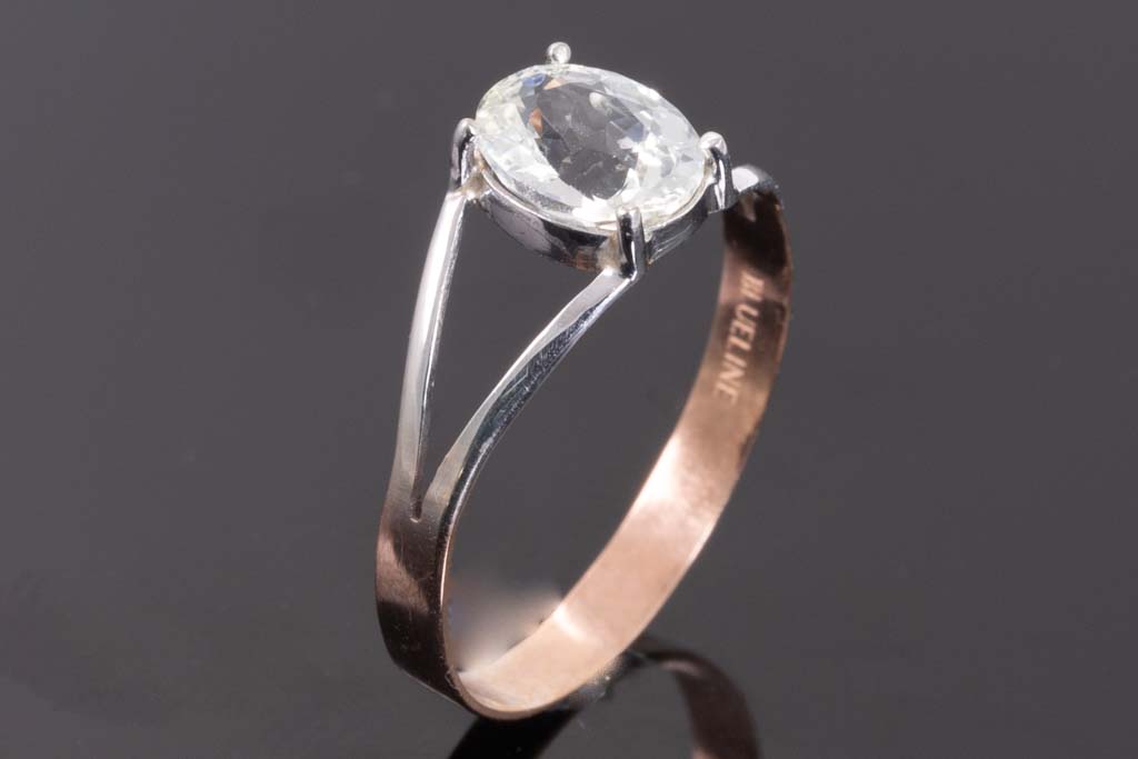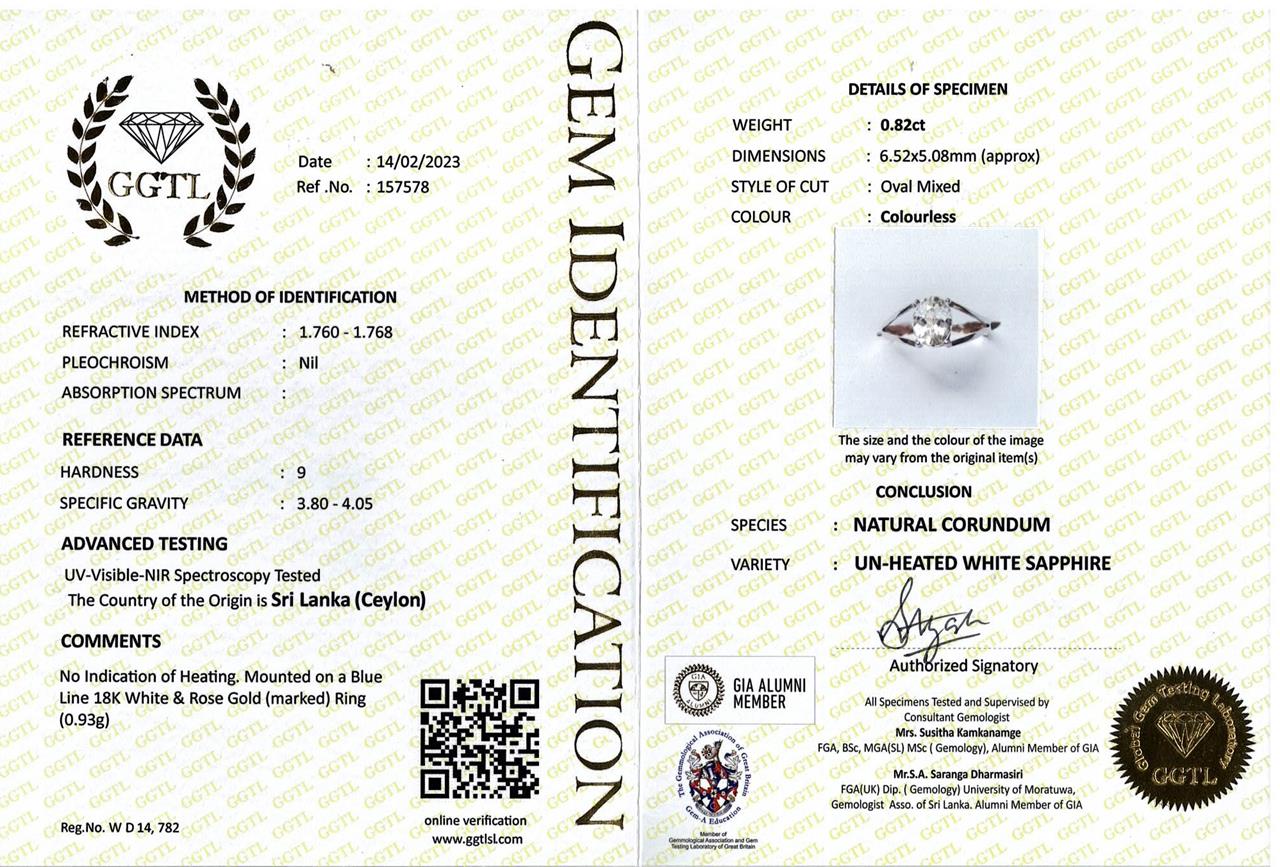 Sapphire ring with an oval shape unheated Ceylon colourless Sapphire ring of 0.82ct. 18ct white gold and rose gold. Ring size H - ring resizing is not recommended. Weight: 0.9g. With certificate #GGTL 157578. (As New)