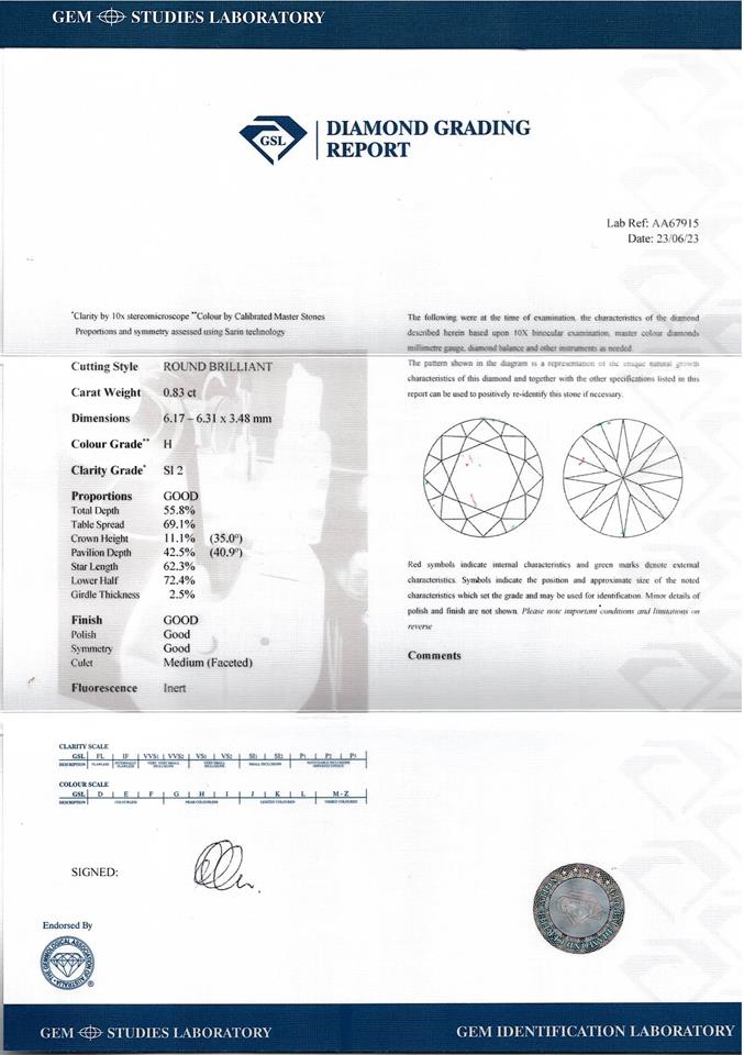 A loose round brilliant cut Diamond of 0.83ct (with GSL Diamond Grading Report graded as H SI2 #AA67915). (New)