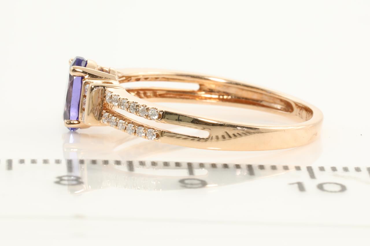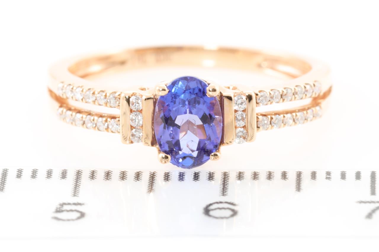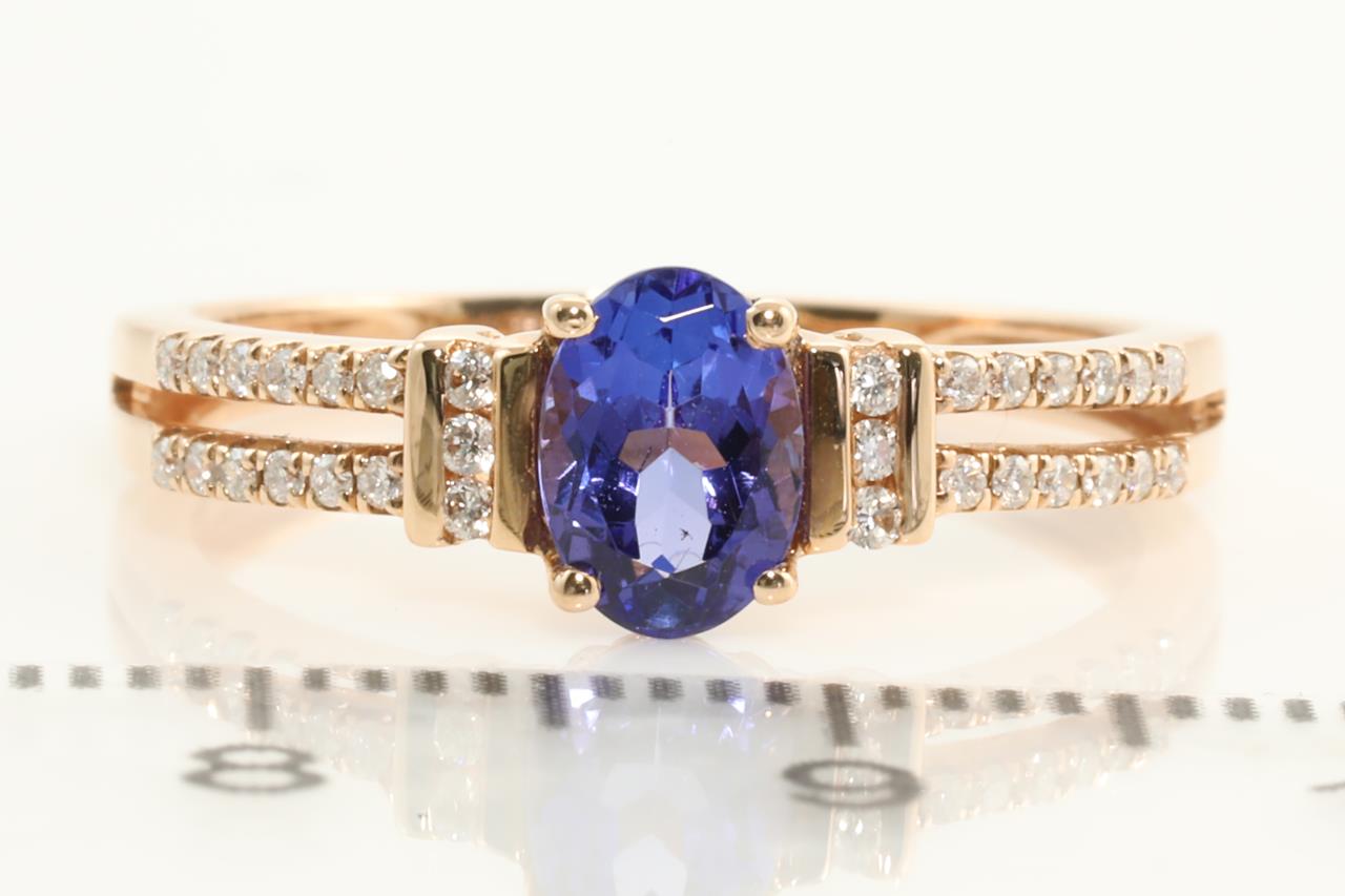 Tanzanite and Diamond ring with oval Tanzanite of 0.83ct and round Diamonds totalling 0.13cts. 14ct rose gold. Ring size M1/2. Weight: 2.4g (As New)