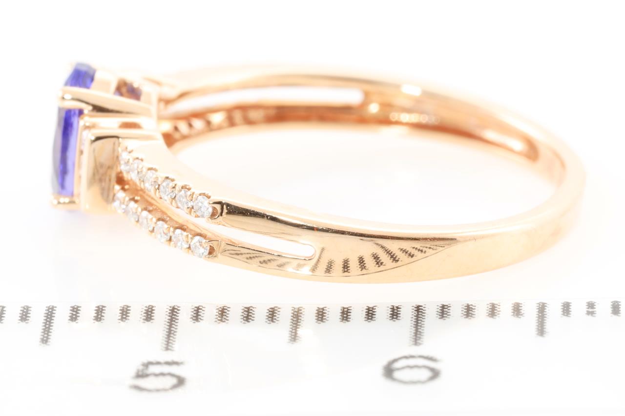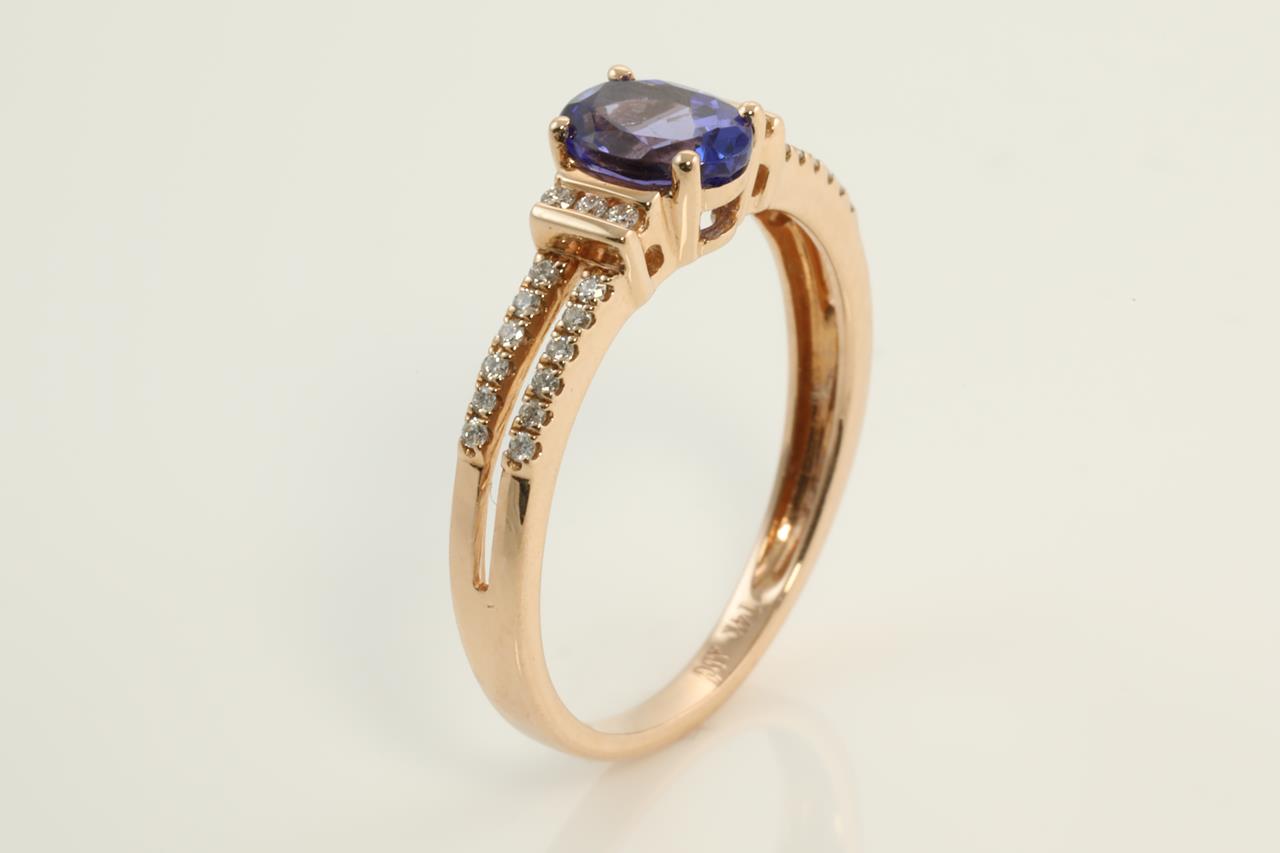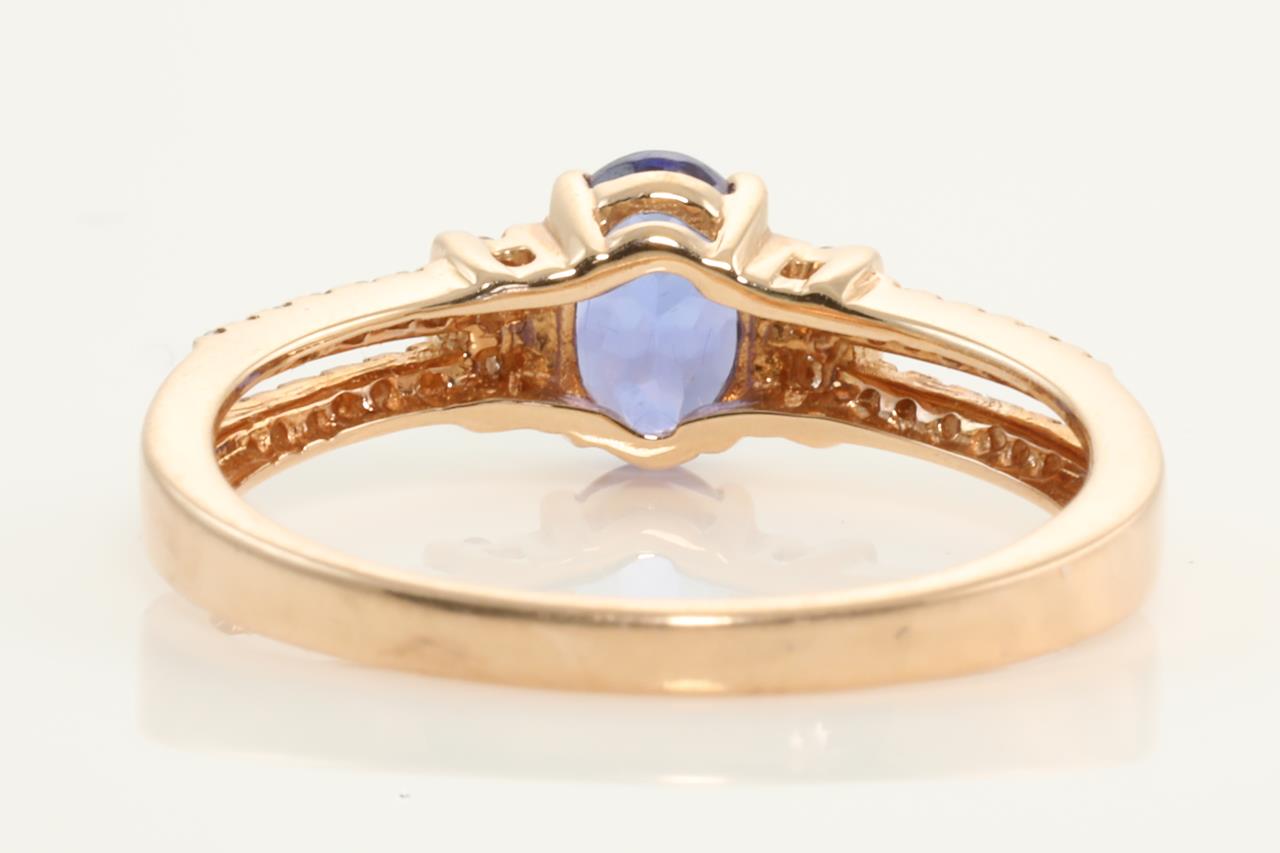 Tanzanite and Diamond ring with oval Tanzanite of 0.83ct and round Diamonds totalling 0.13cts. 14ct rose gold. Ring size M1/2. Weight: 2.4g (As New)