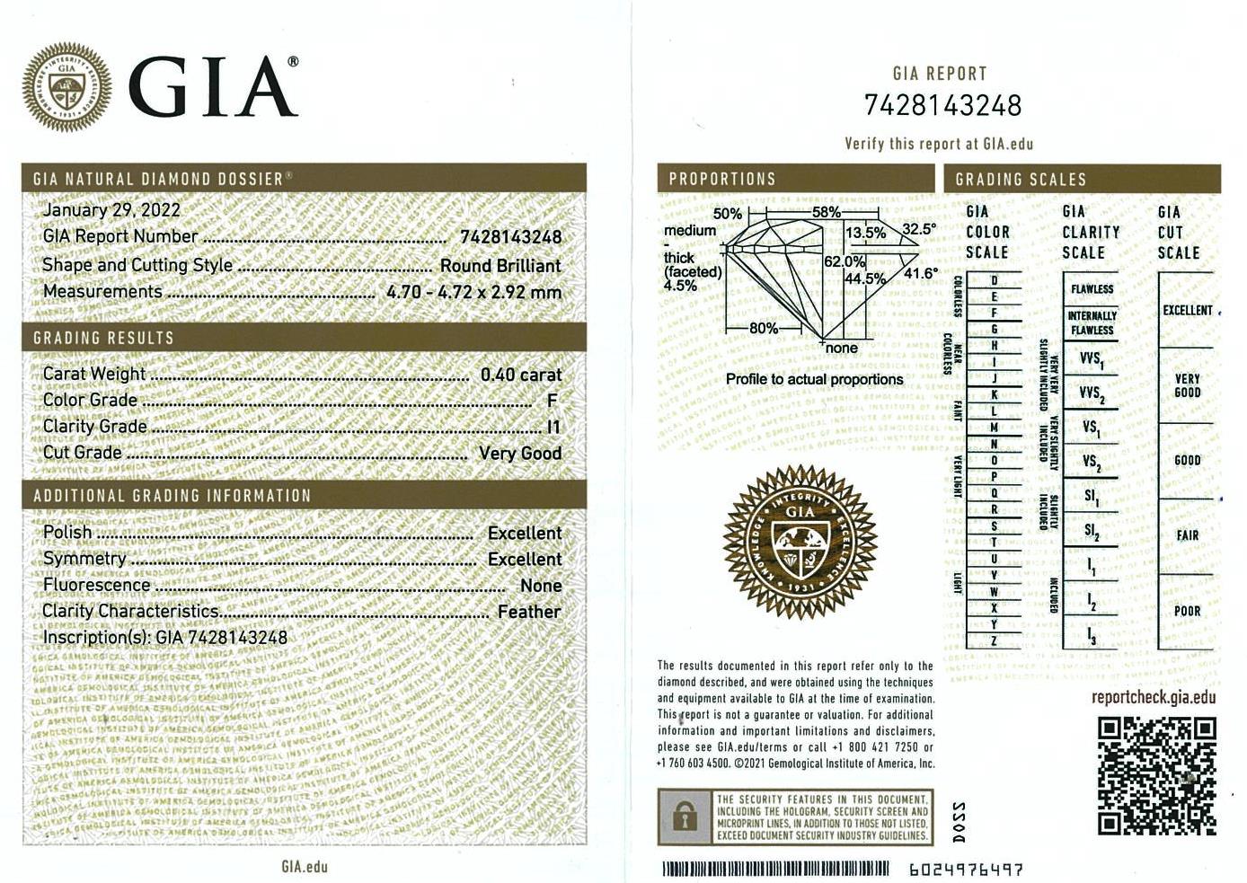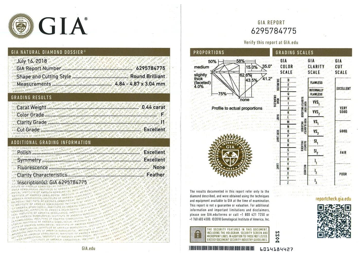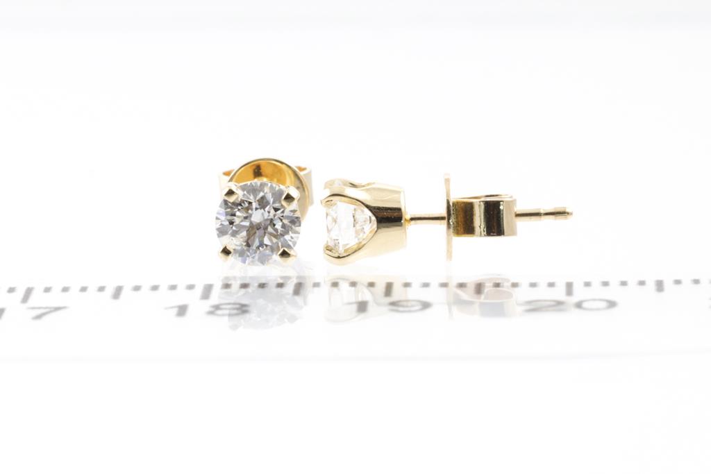 Diamond stud earrings with 2 round brilliant cut Diamonds totalling 0.84cts (both with GIA summary report graded as F I1, # 6295784775, 7428143248). 18ct yellow gold. Weight: 1.5g. (New)