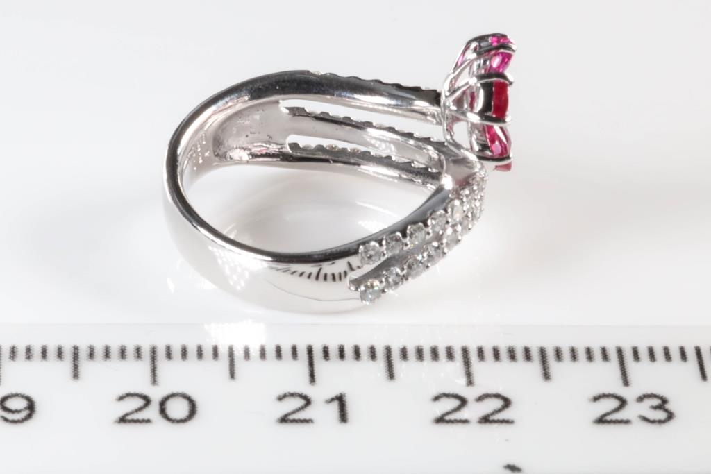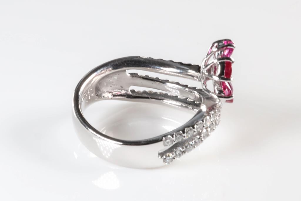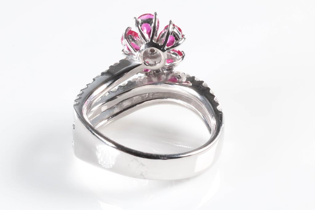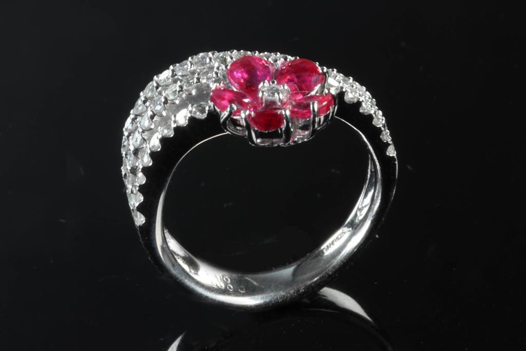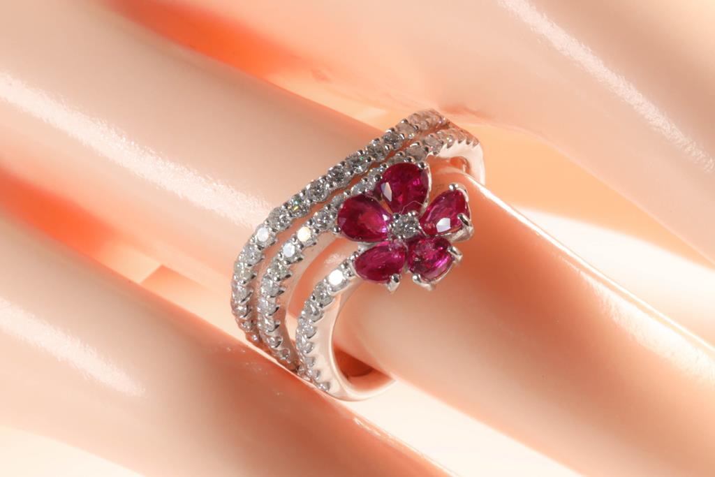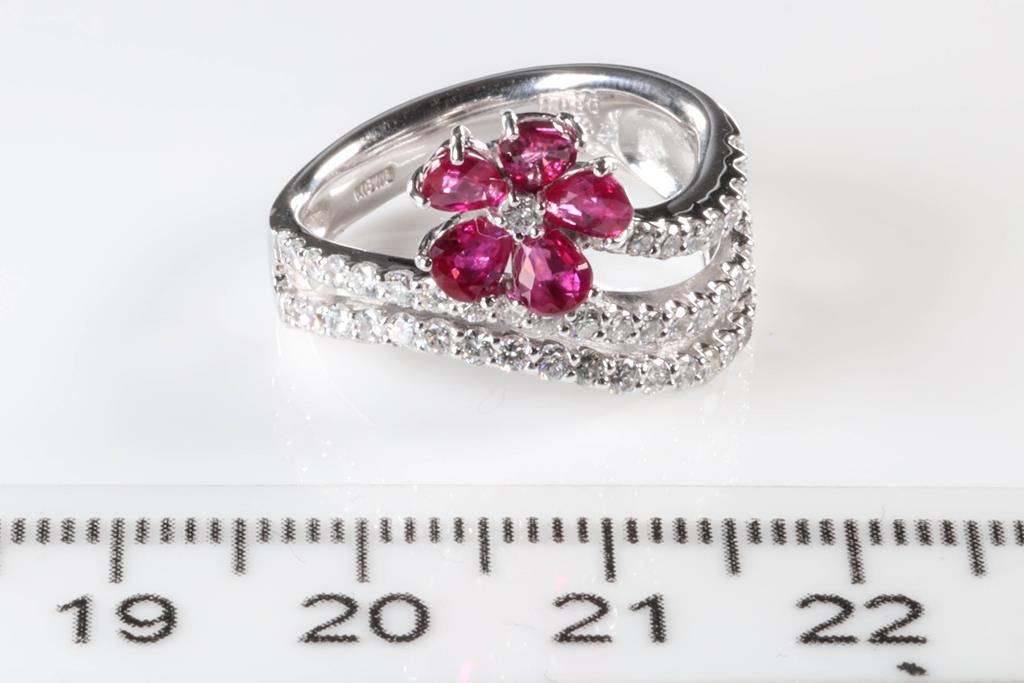 Ruby and Diamond ring with 5 pear shape Rubies totalling 0.84cts and round Diamonds totalling 0.80cts (Estimated grading: G-H SI). 18ct white gold. Ring size: L - ring resizing is not recommended. Weight: 7g. (Pre-owned)