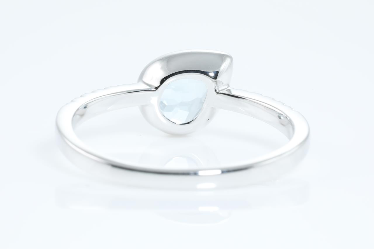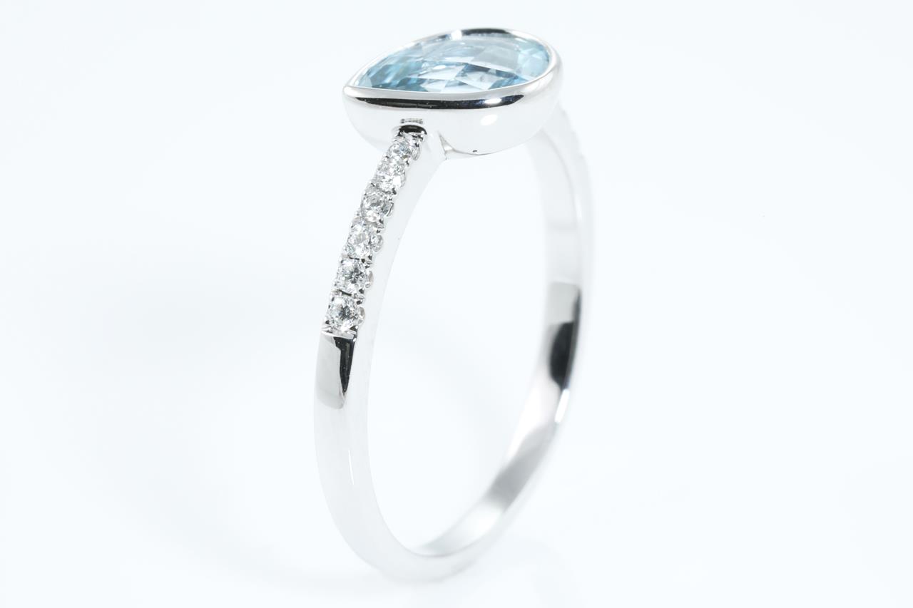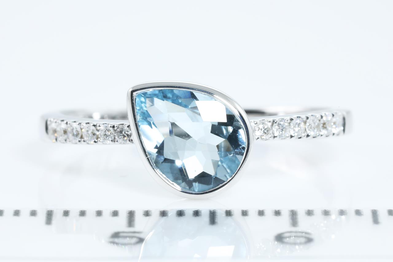 Aquamarine and Diamond ring with pear checkerboard cut Aquamarine of 0.85ct and Diamonds totalling 0.11tcs. 14ct white gold. Ring size N1/2 Note it is not recommended to resize this ring smaller. Weight: 2.1 (New)