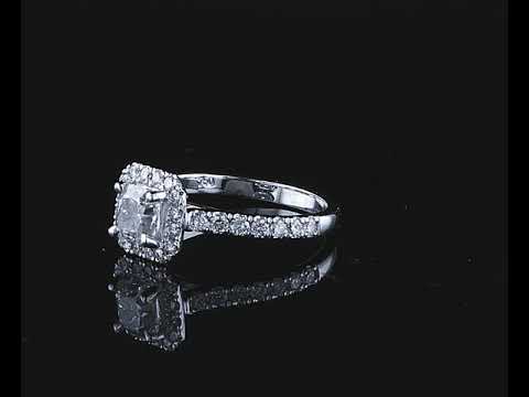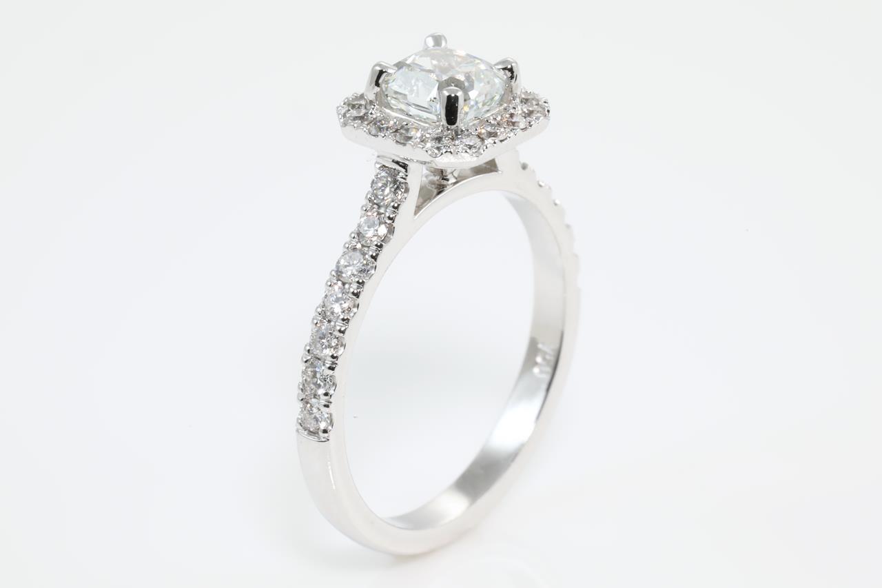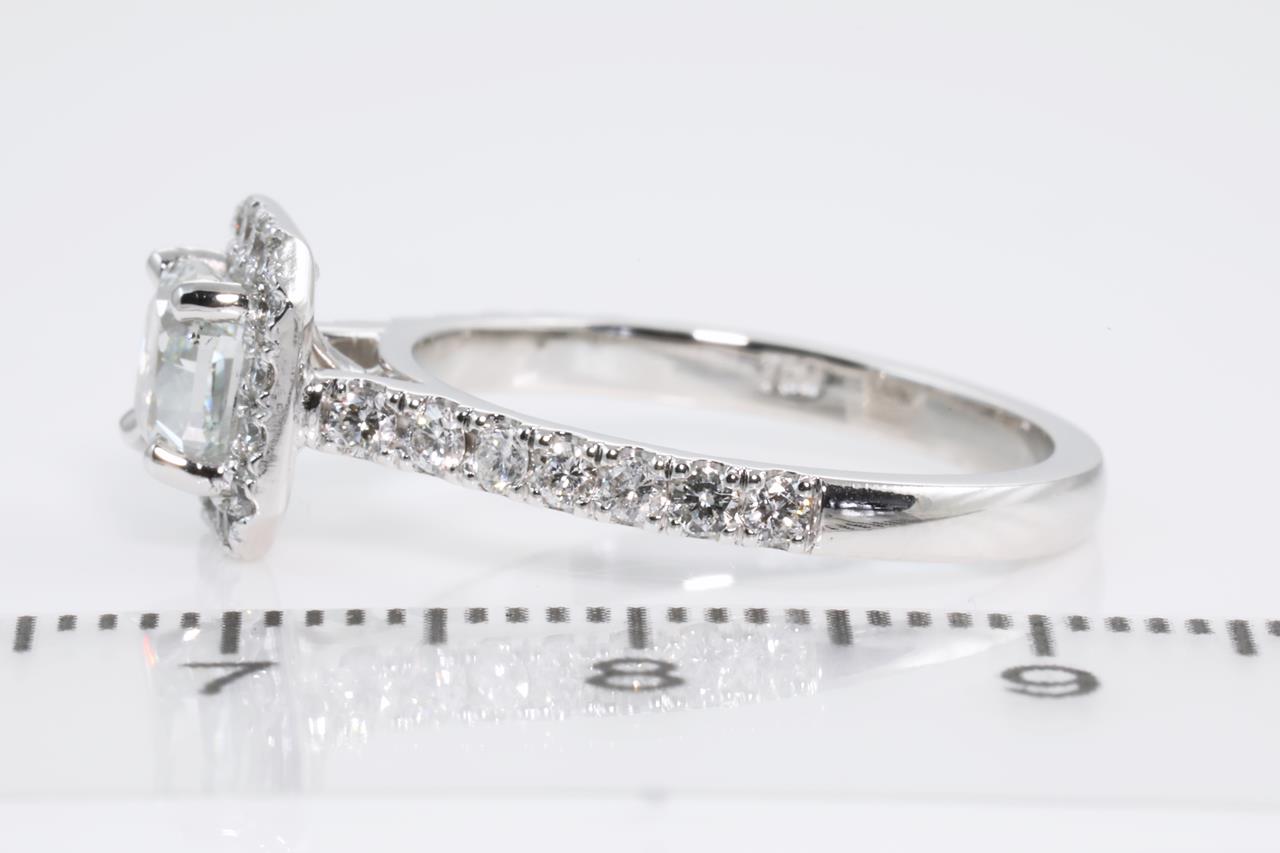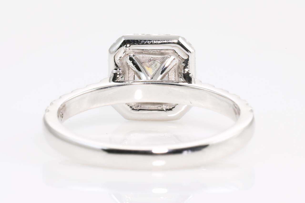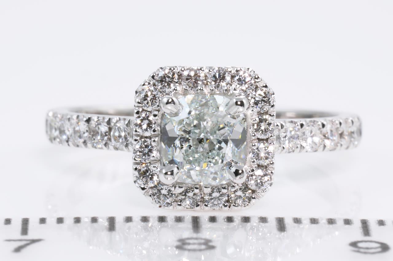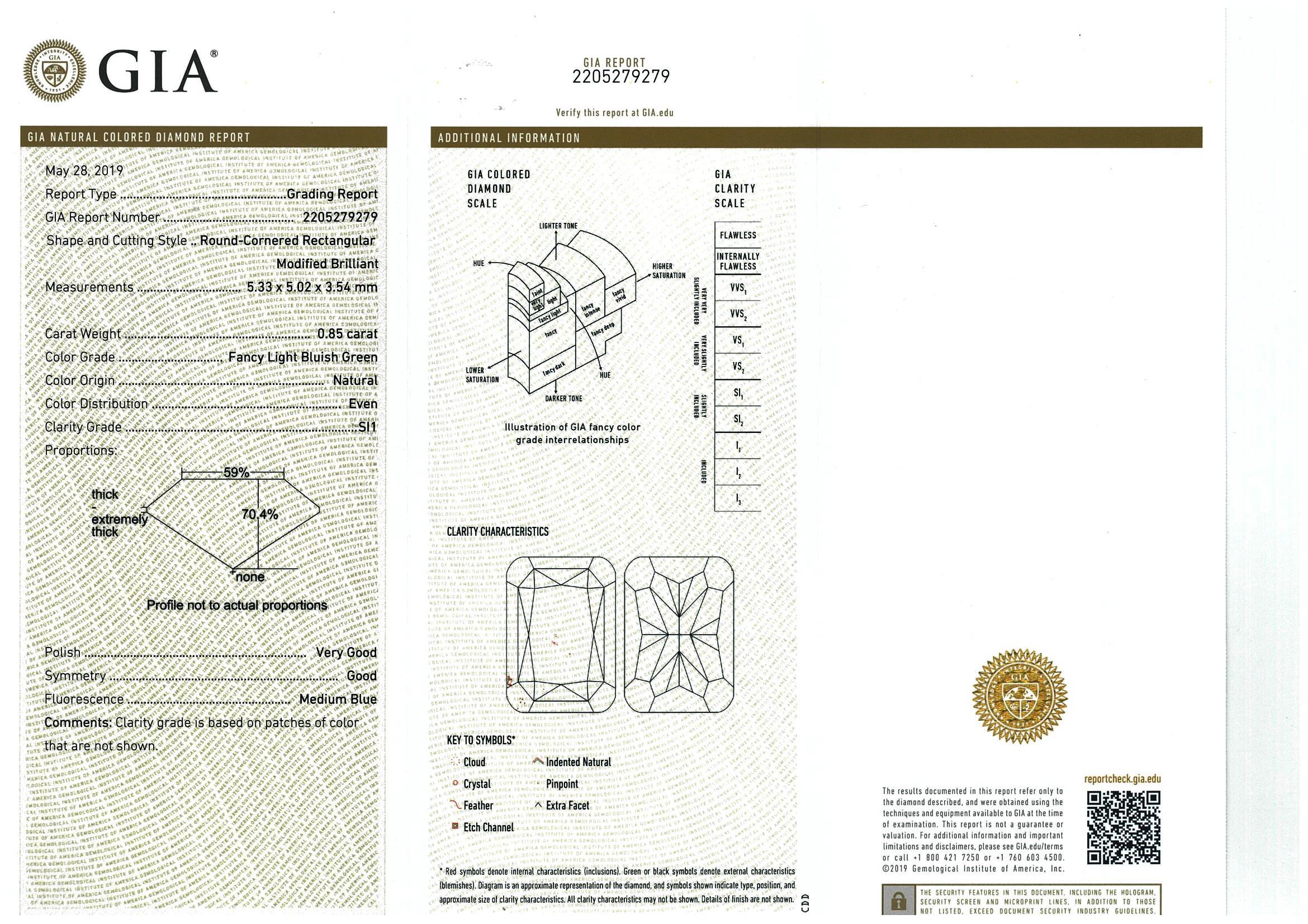Diamond ring with centre Radiant cut Diamond of 0.85ct (with GIA report graded as Natural Fancy Light Bluish Green SI1 #2205279279) with surrounding Diamonds totalling 0.24cts. 18ct white gold. Ring size M. Weight: 3.8g (new)