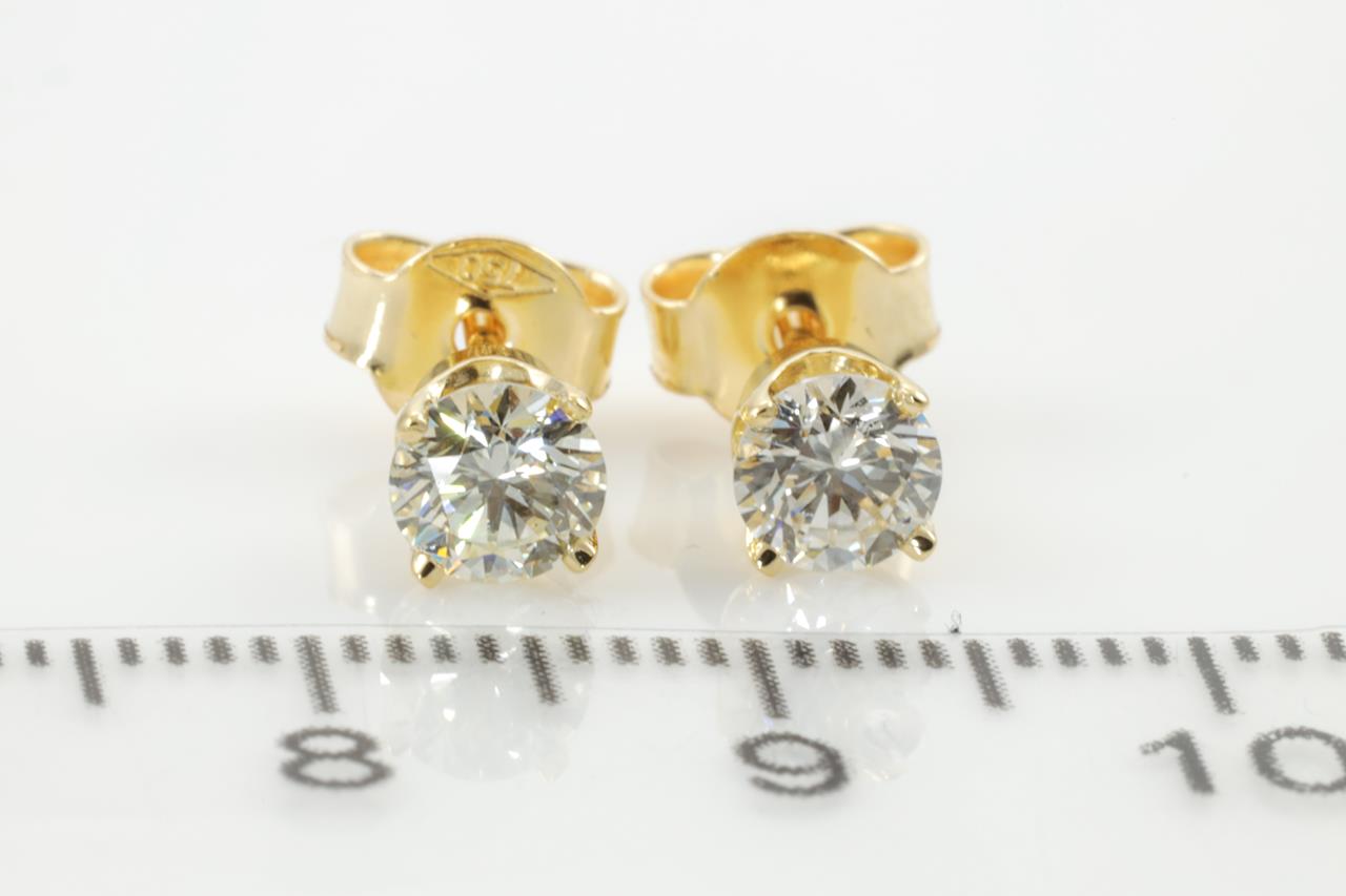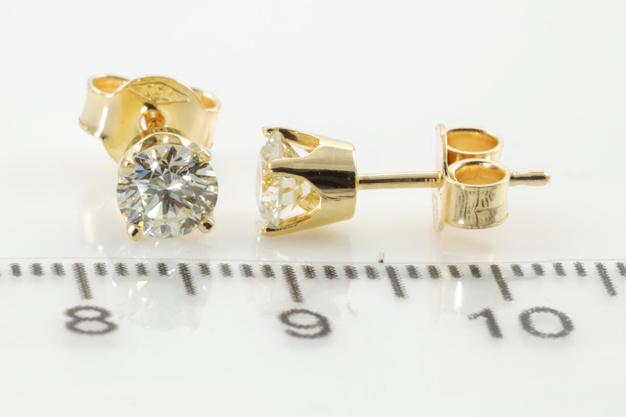Diamond stud earrings with 2 round Diamonds totalling 0.85cts (Estimated grading: K-L VS). 18ct yellow gold. Weight 1.6g. (New)