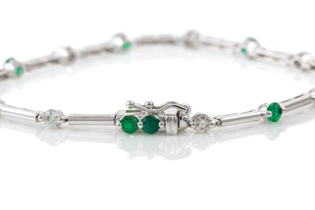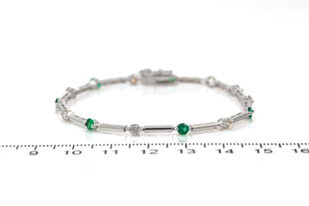 Emerald and Diamond bracelet with 8 round Emeralds totalling 0.85cts and 7 round Diamonds totalling 0.80cts (Estimated grading I-J P1). 18ct white gold. Length: 17.5cm. Weight: 6.9g. (Pre-owned)