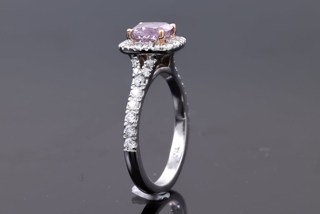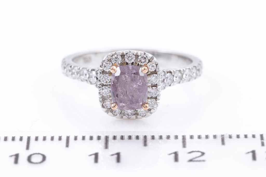 Diamond halo ring with centre cushion cut Diamond of 0.85ct (with GIA report graded as Natural Fancy Brownish Purple-Pink Even #5181725983. FSA estimated clarity Grade: P3.) with surrounding Diamonds totalling 0.42cts (Estimated grading: G SI). 18ct rose and white gold. Ring size K. Weight 4g. (New)