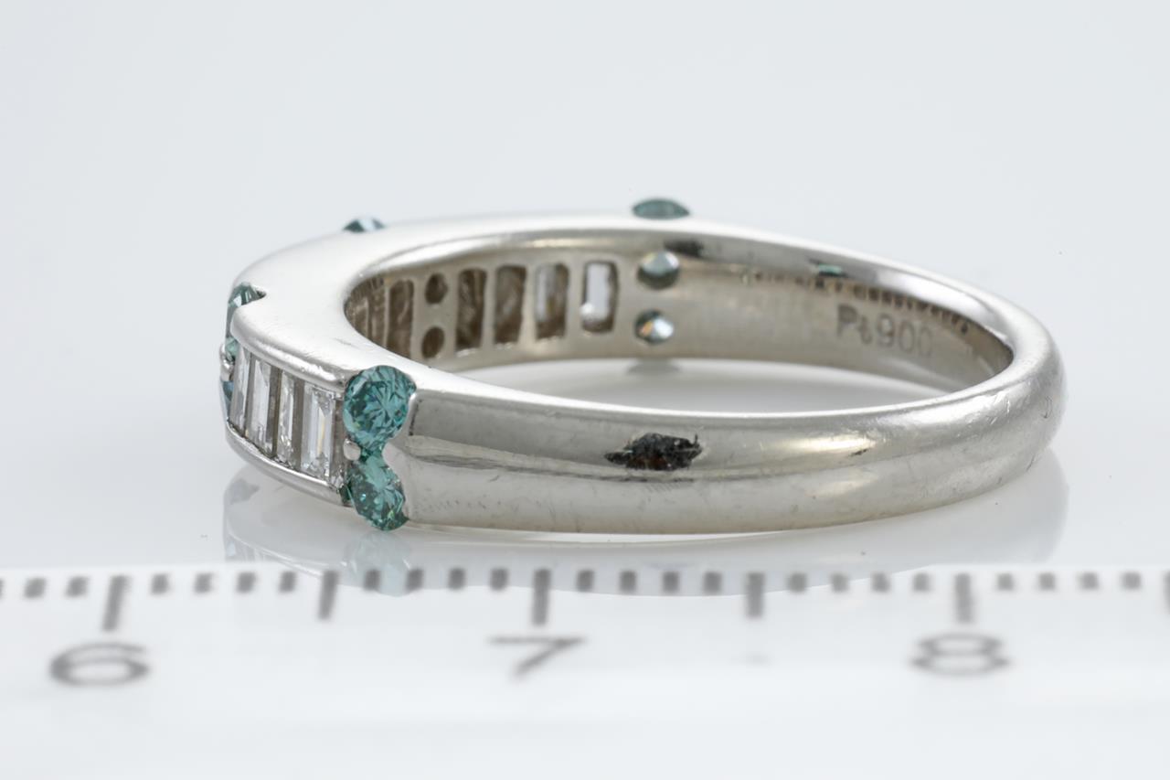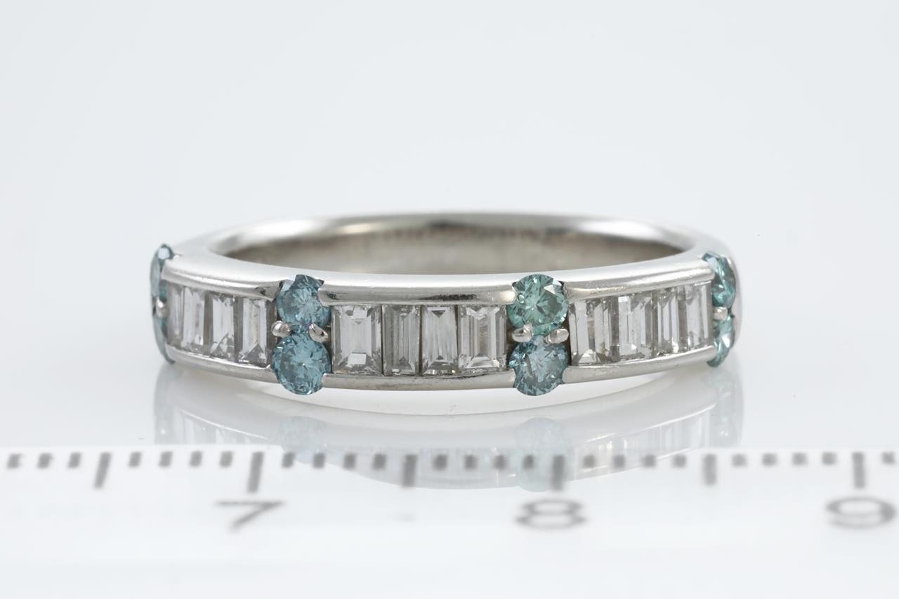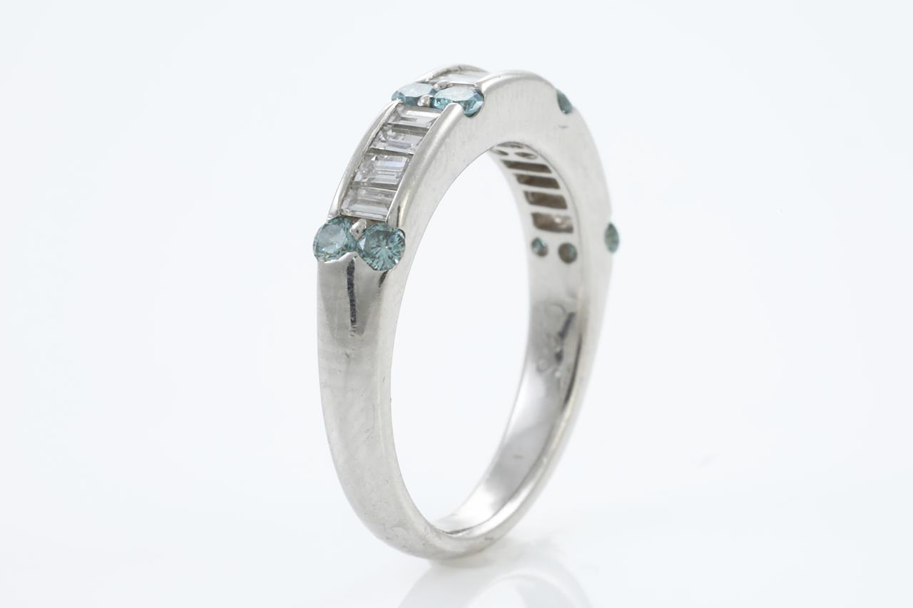Diamond ring with baguette cut white Diamonds (Estimated grading: G SI) and colour treated blue Diamonds totalling 0.86cts. Platinum. Ring size: L. Weight: 6.2g. (Pre-owned)
