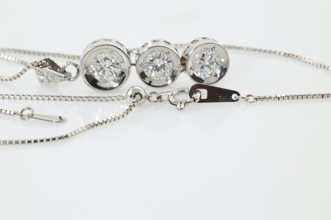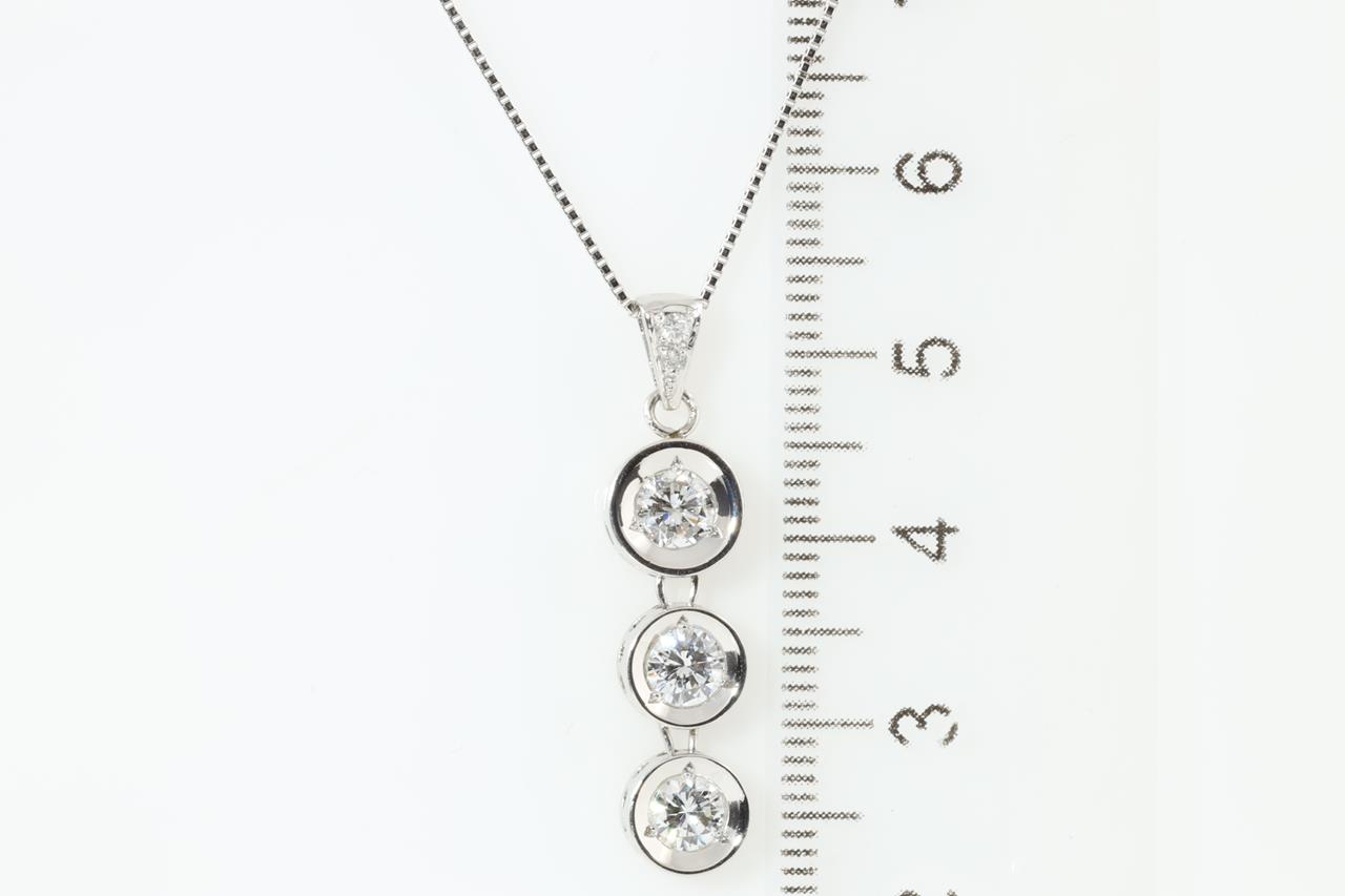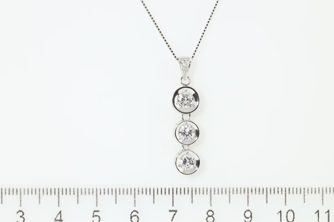 Diamond pendant with three round Diamonds (Estimated grading: H SI-P1) totalling 0.84cts (0.30ct, 0.28ct and 0.25ct) and diamonds totalling 0.03cts. Platinum with adjustable 45cm chain. Weight: 6.6g (Pre-owned)