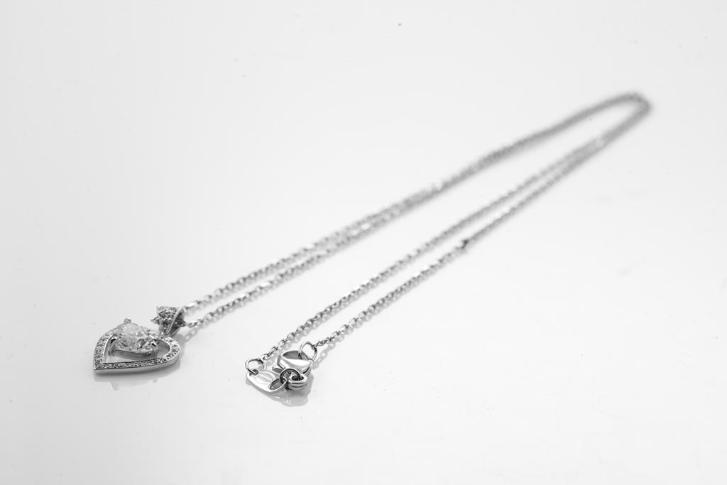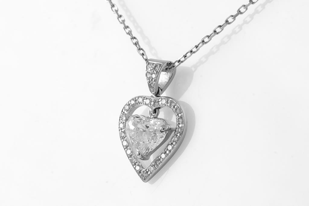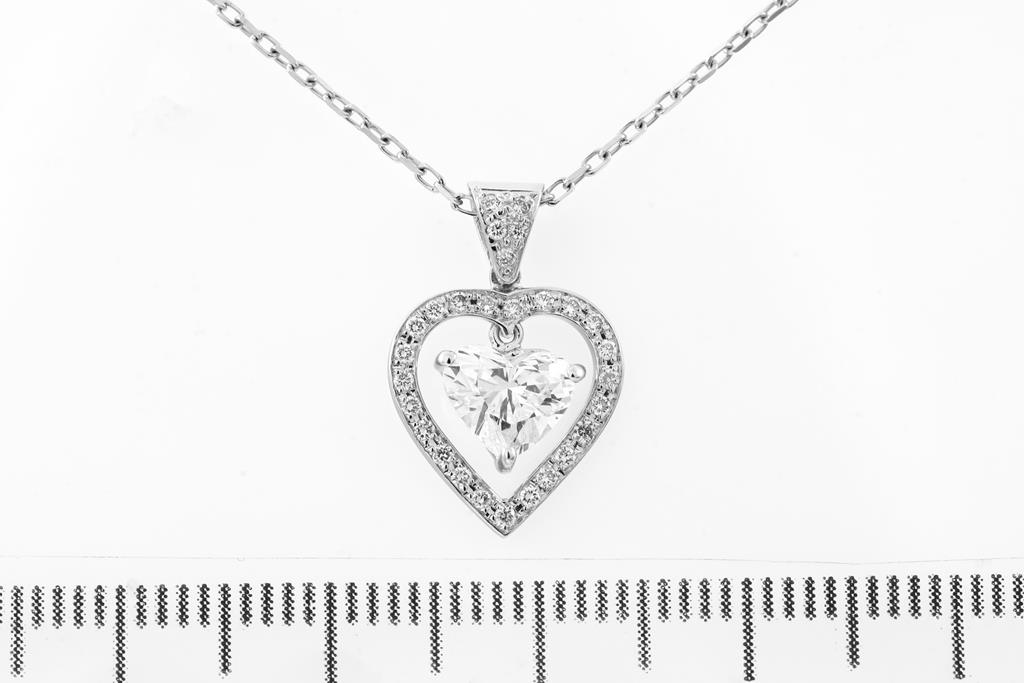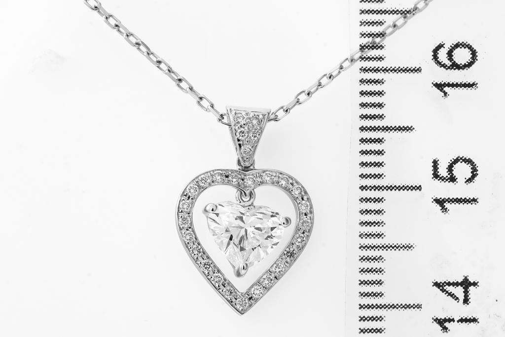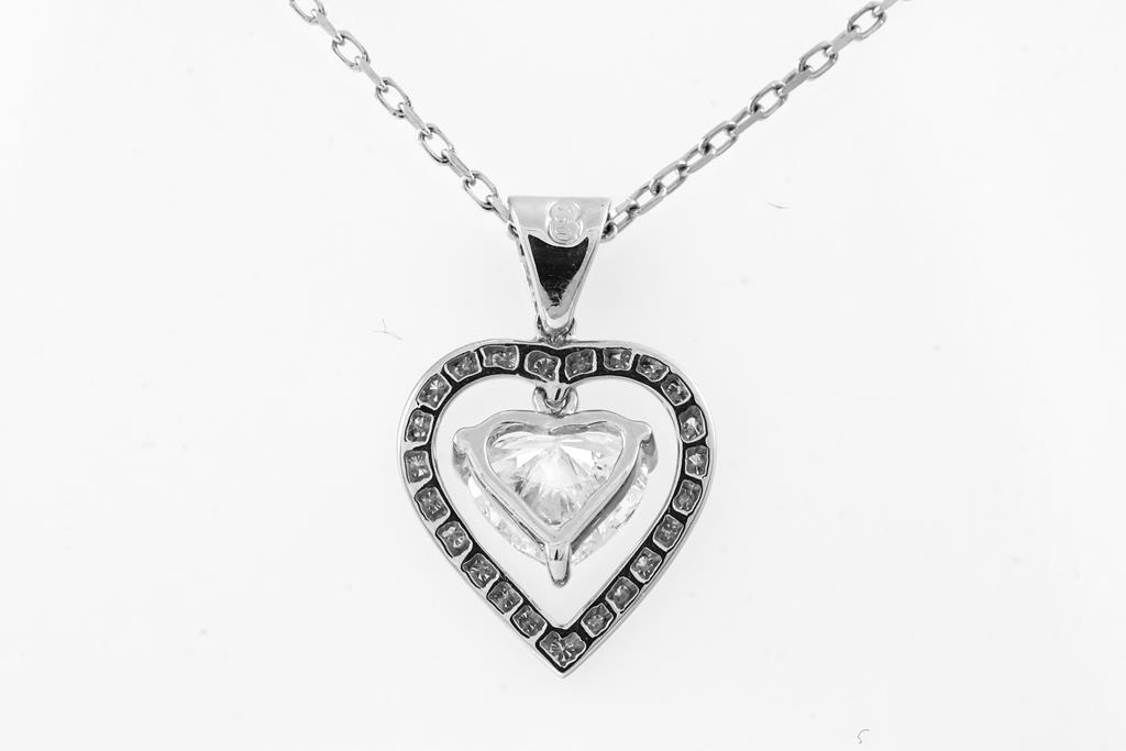 Diamond Pendant with centre heart shape Diamond of 0.70ct (Estimated grading H SI2) and round Diamond totalling approximately 0.17cts. 18ct white gold with 45cm 18ct white gold chain. Weight 2.9g. (As New)