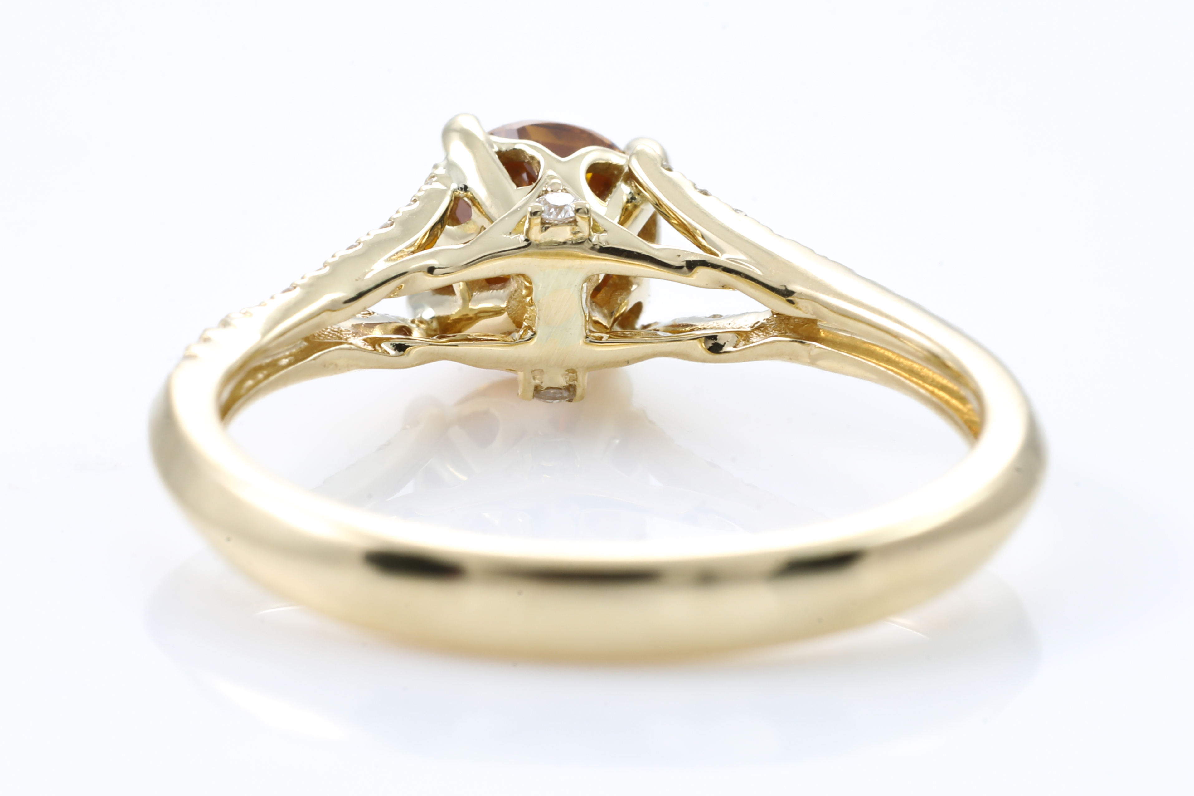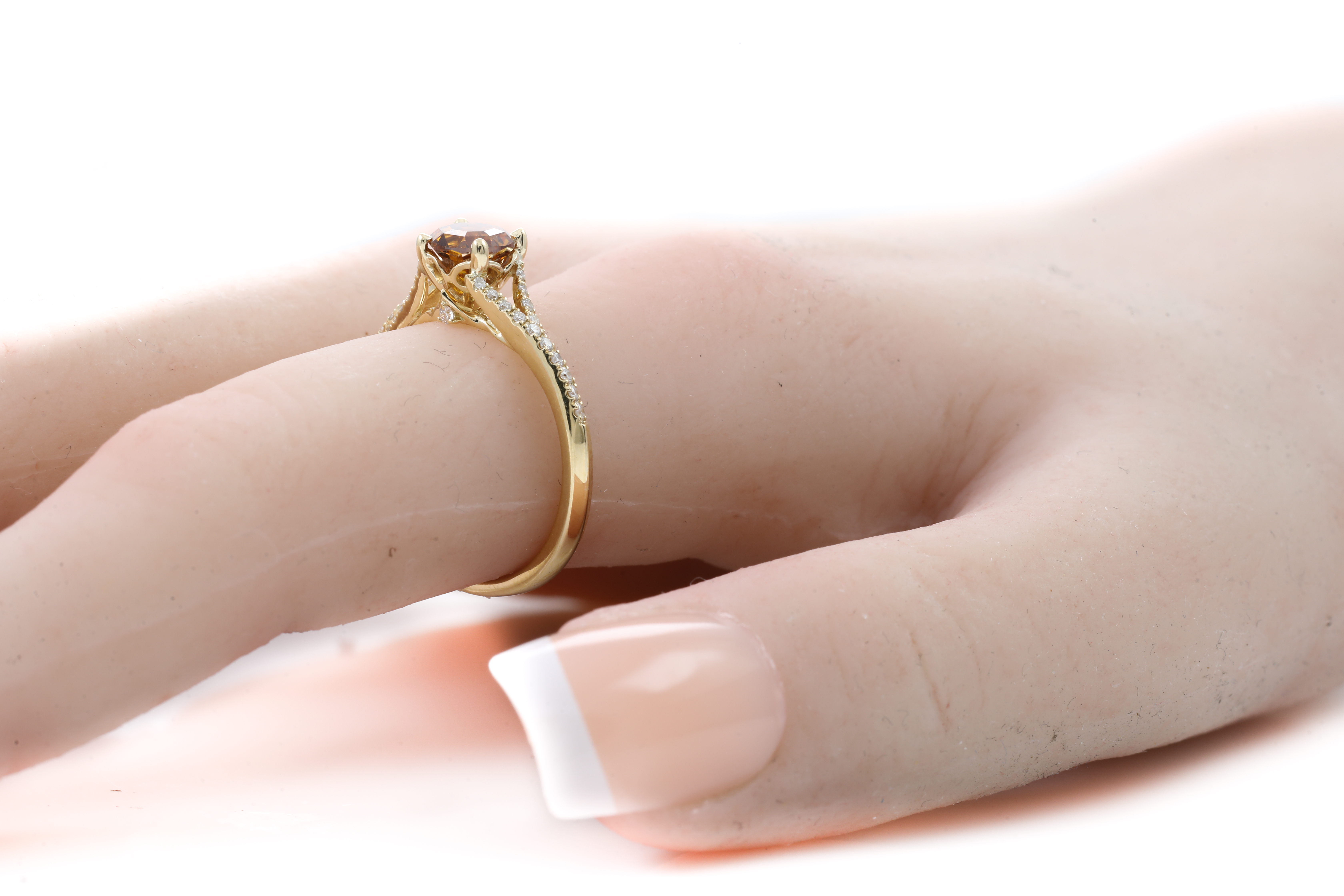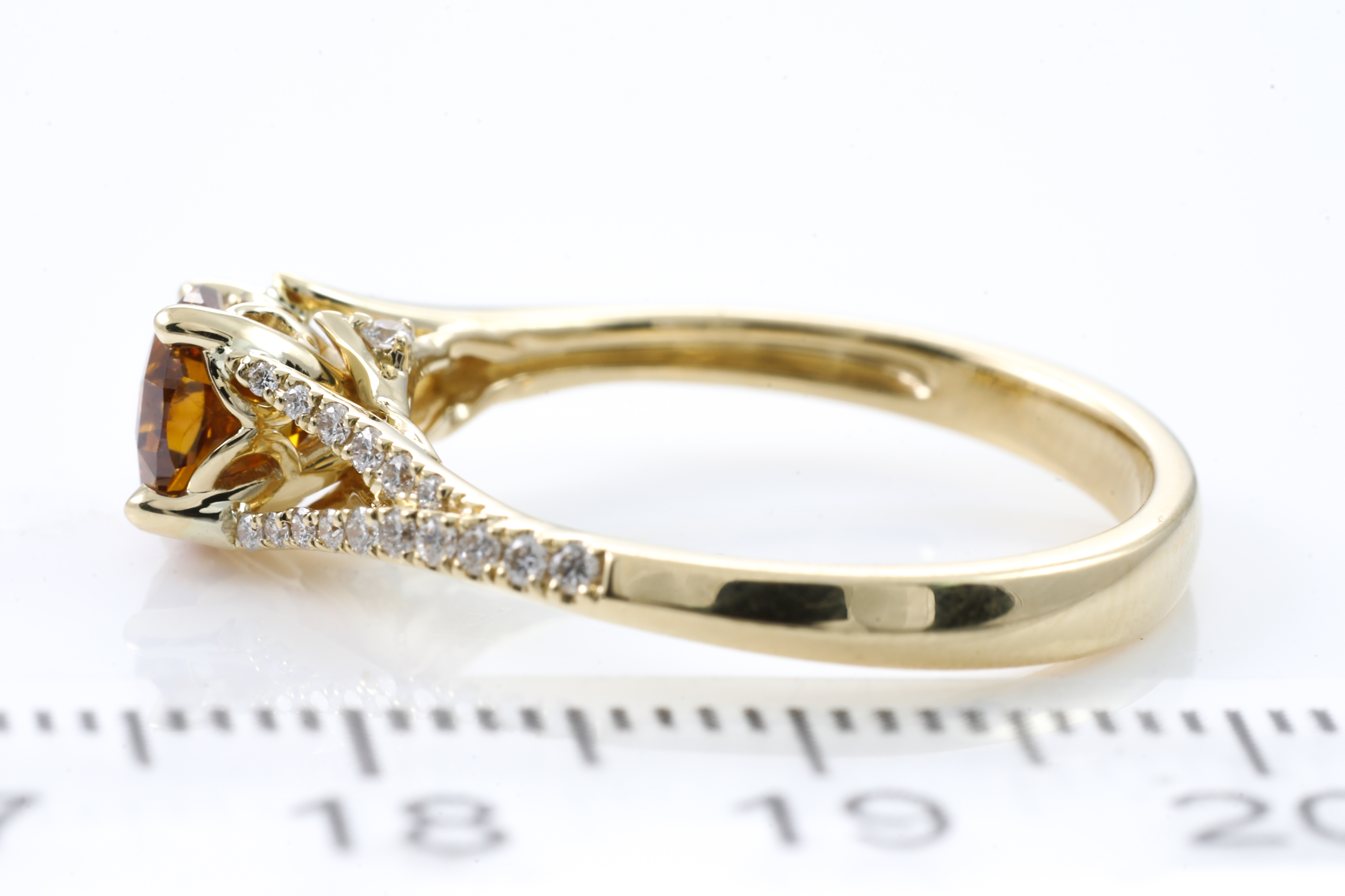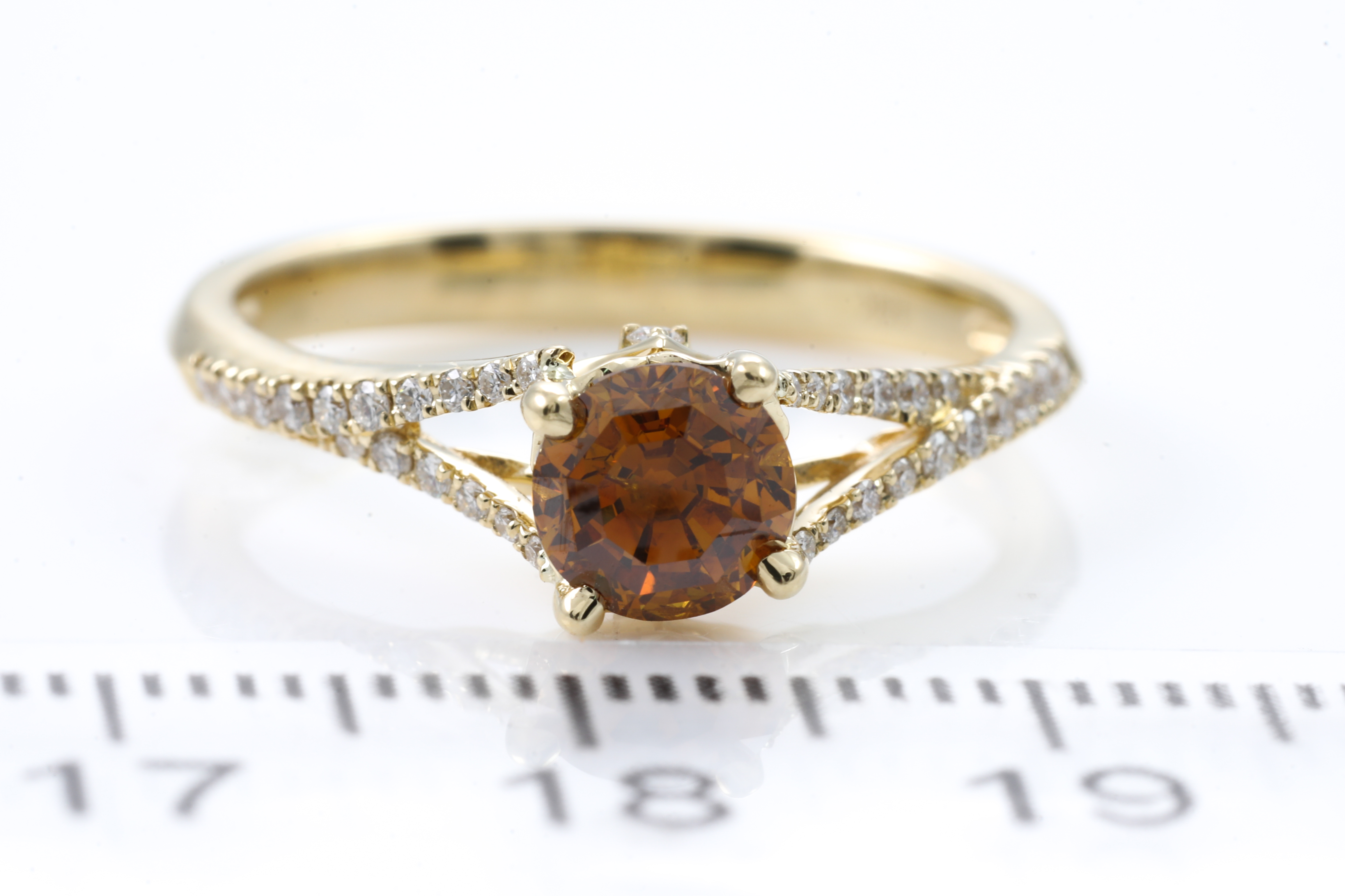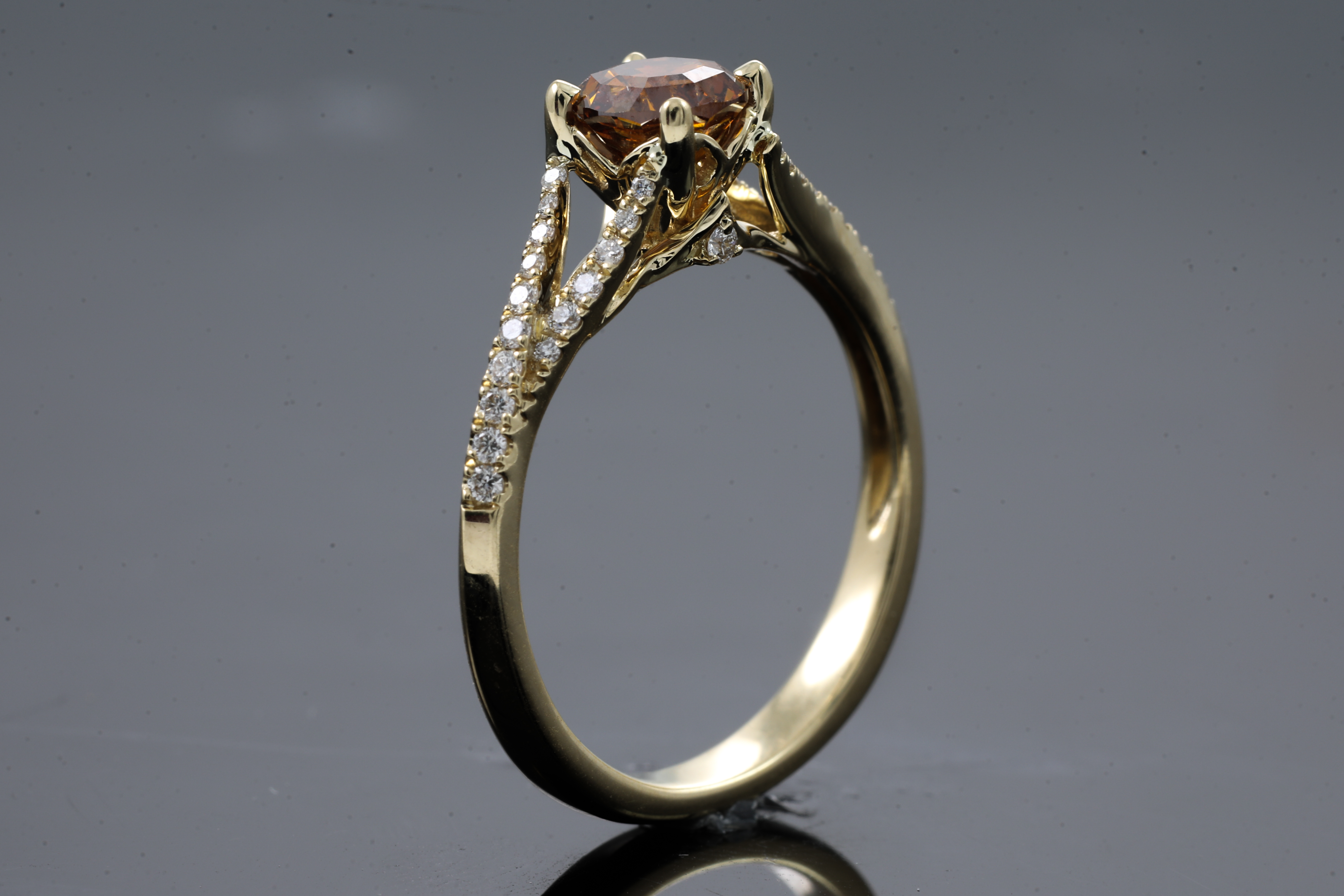 Diamond ring with centre round step cut Diamond of 0.88ct (with GIA report graded as Natural Fancy Deep Brownish Yellowish Orange Even #5202403562, FSA estimated clarity grading: P1) and remaining round Diamonds totalling 0.20cts. 18ct yellow gold. Ring size N. Weight: 3.6g. (New)