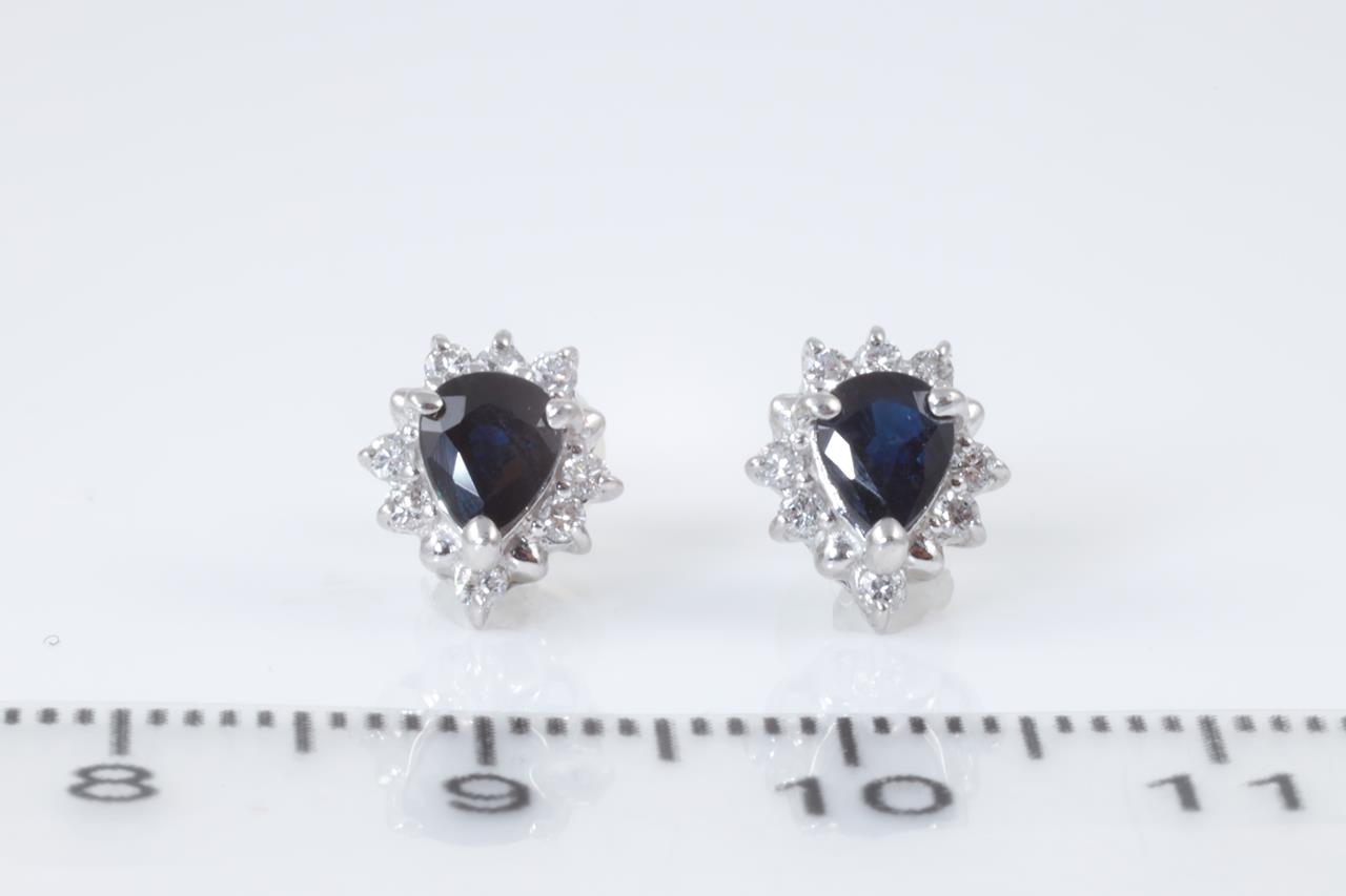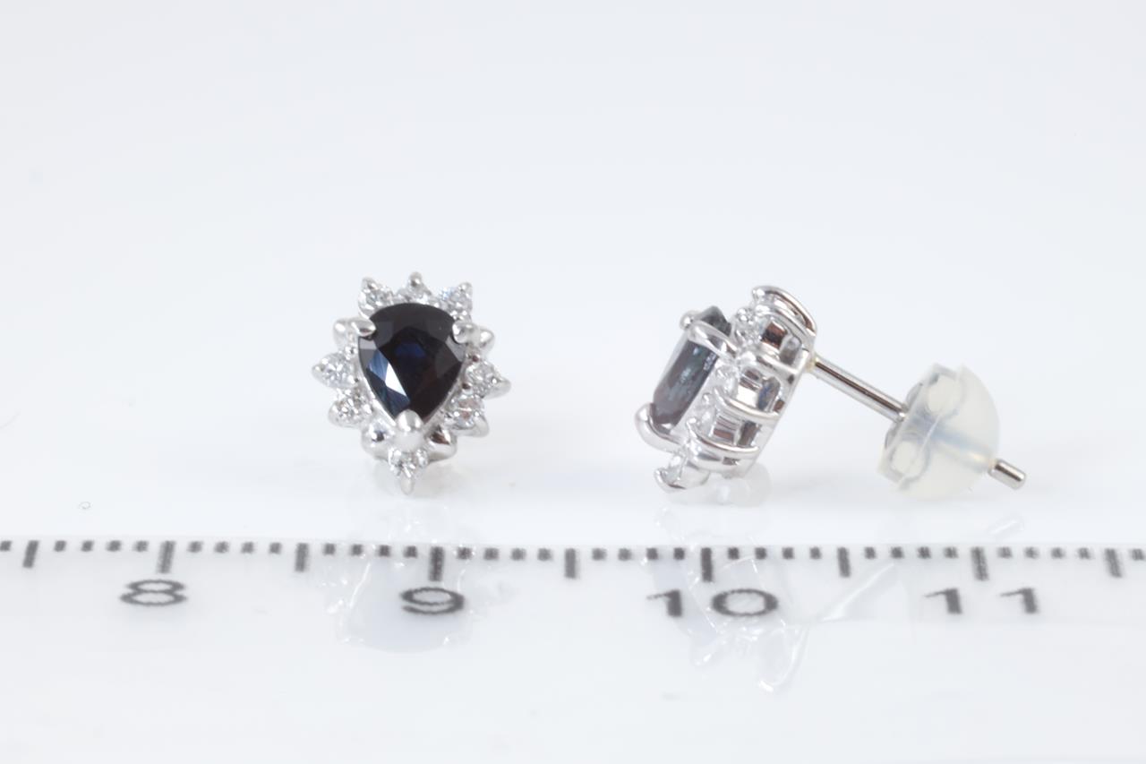 Sapphire and Diamond earrings with pear shape blue Sapphires totalling 0.88cts and Diamonds totalling 0.18cts. Platinum with platinum & silicon backs. Weight: 2.3g (Pre-owned).