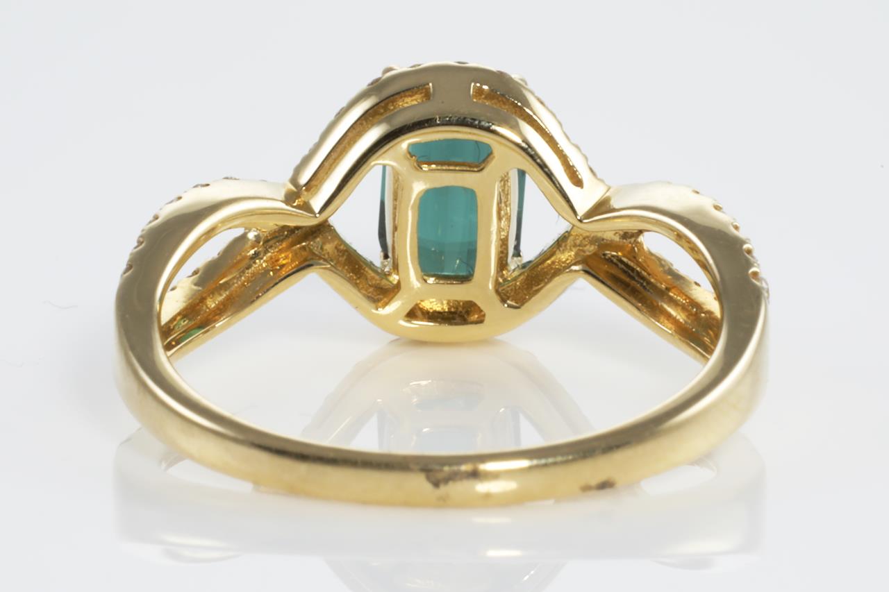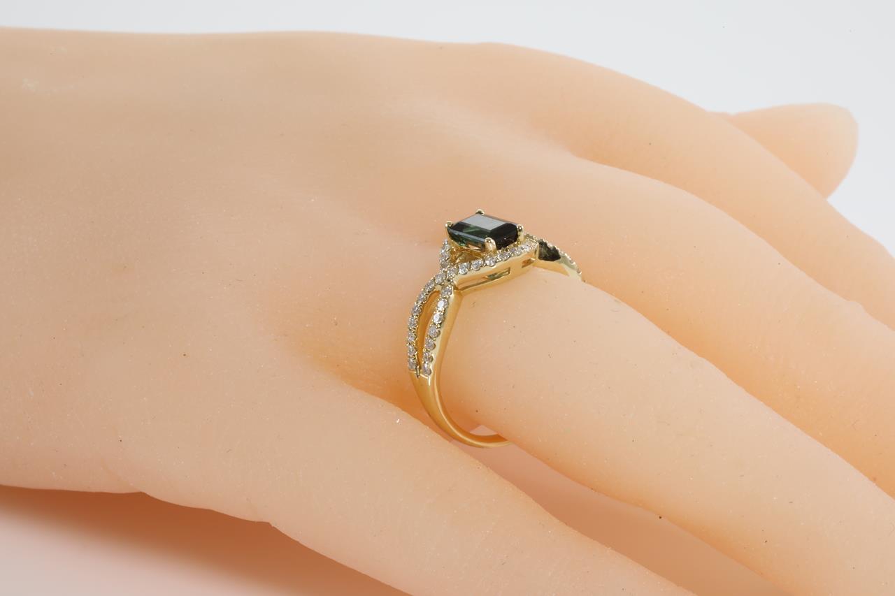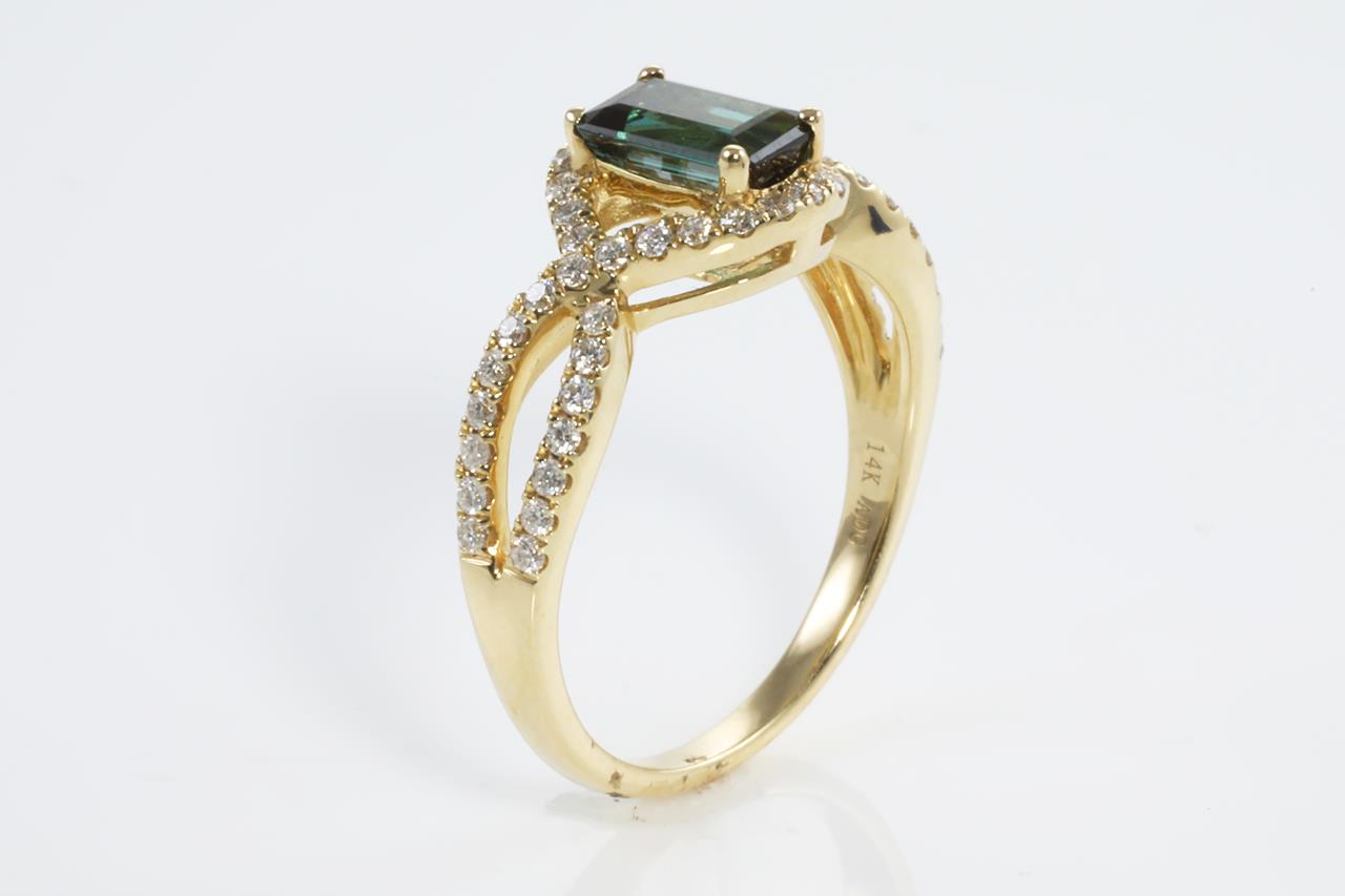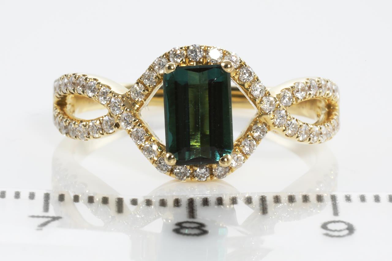 Tourmaline and Diamond ring with emerald cut green Tourmaline of 0.88ct and Diamonds totalling 0.39cts (Estimated grading: H SI). 14ct yellow gold. Ring size O - Ring resizing is not recommended. Weight: 3.5g (As New).