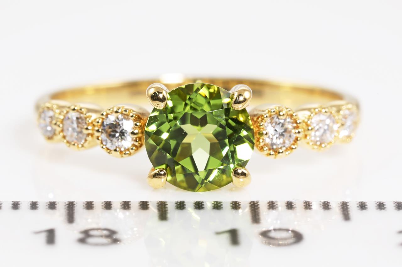 Peridot and Diamond ring with a round Peridot of 0.89ct and 6 Diamonds totalling 0.17cts. 18ct yellow gold. Ring size L1/2. Weight: 2.4g (Pre-owned)