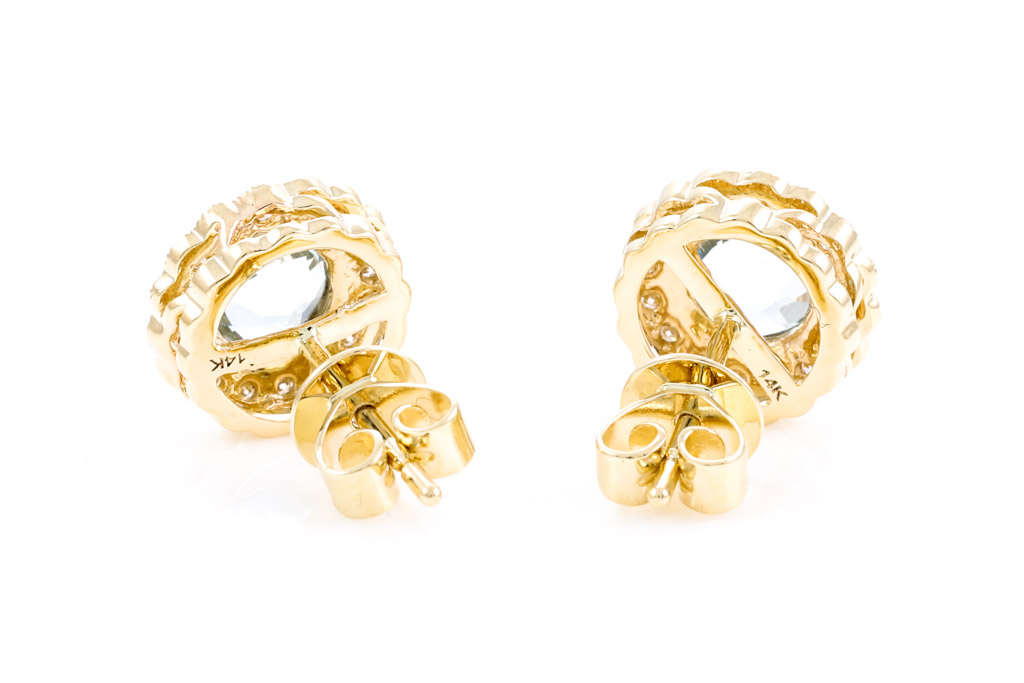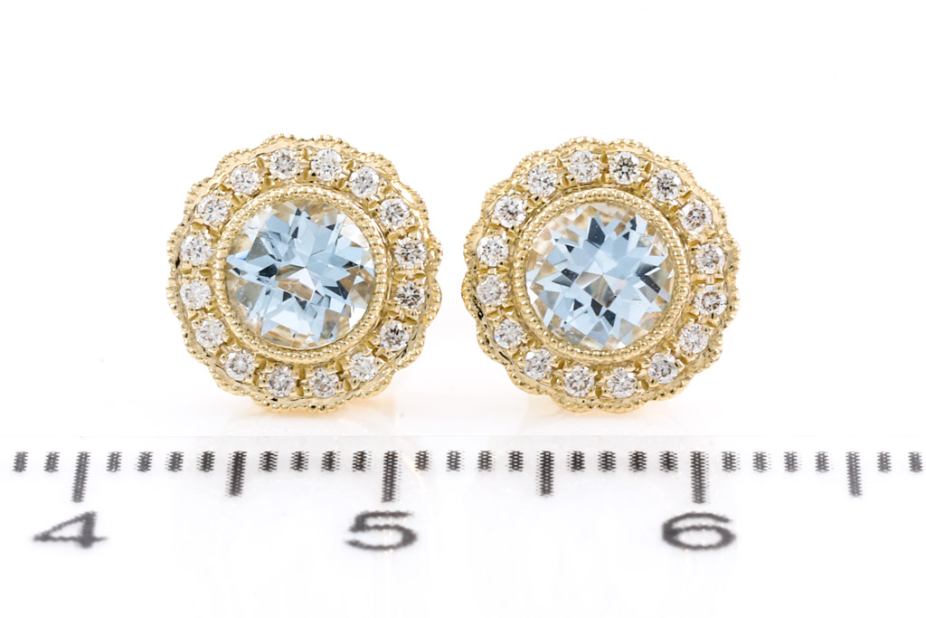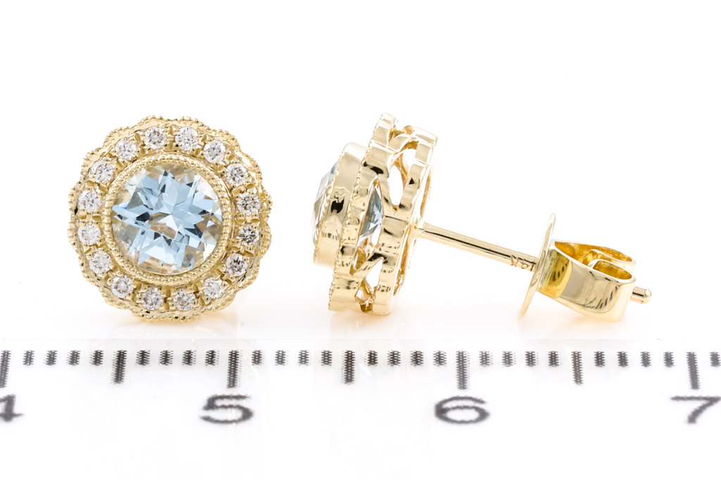 Aquamarine and Diamond earrings with round Aquamarine totalling 0.90cts and round Diamonds totalling 0.16cts. 14ct yellow gold. Weight: 2.3g. (New).