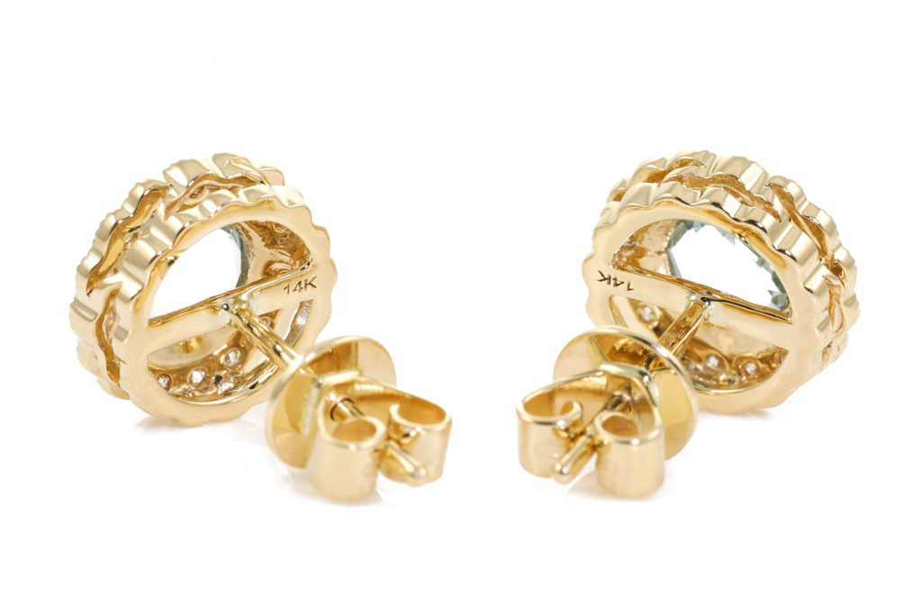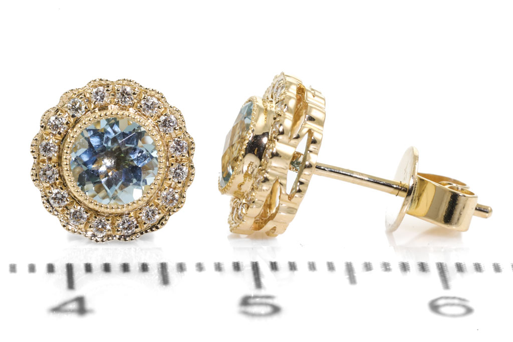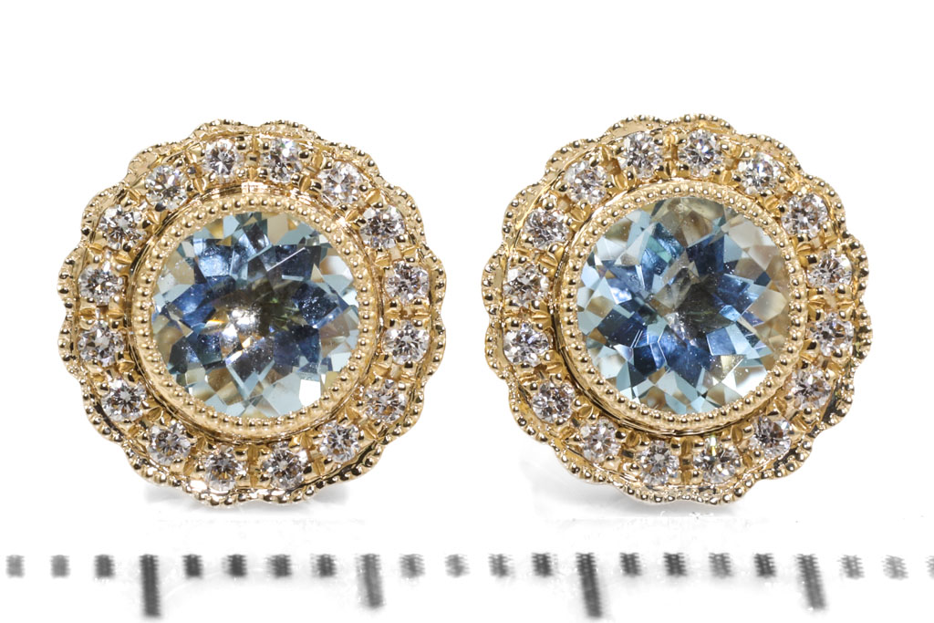 Aquamarine and Diamond earrings with round Aquamarines totalling 0.90cts and Diamonds totalling 0.16cts. 14ct yellow gold. Weight: 2.2g. (New)