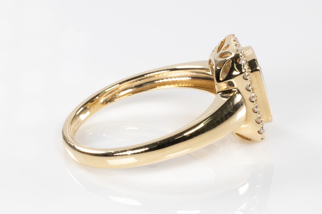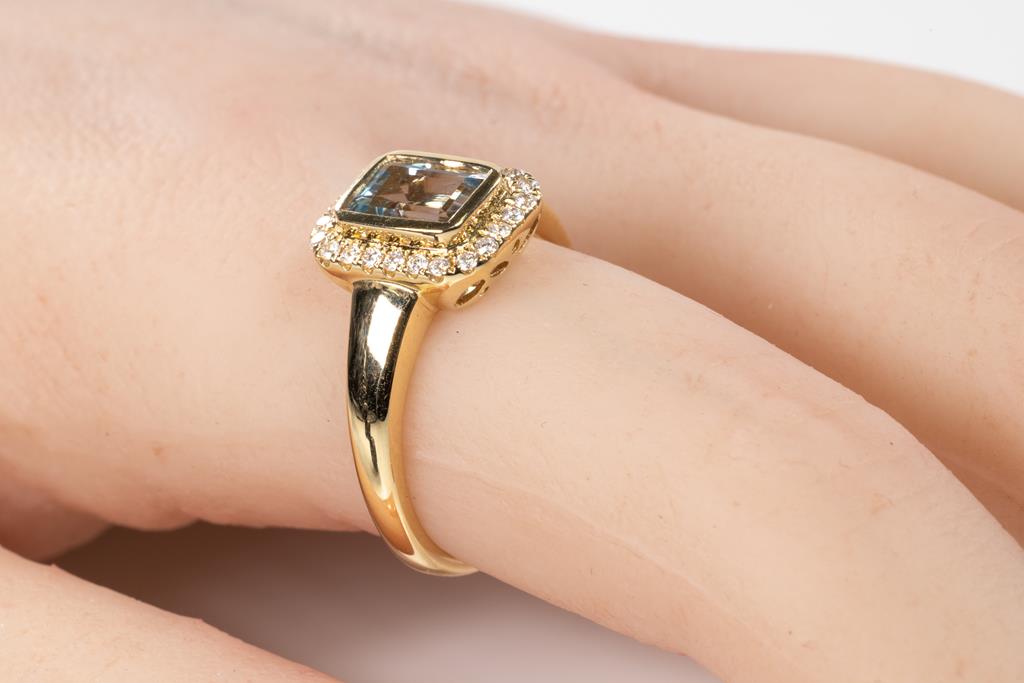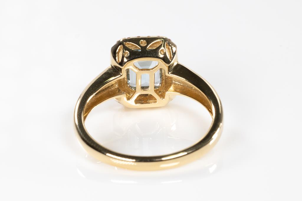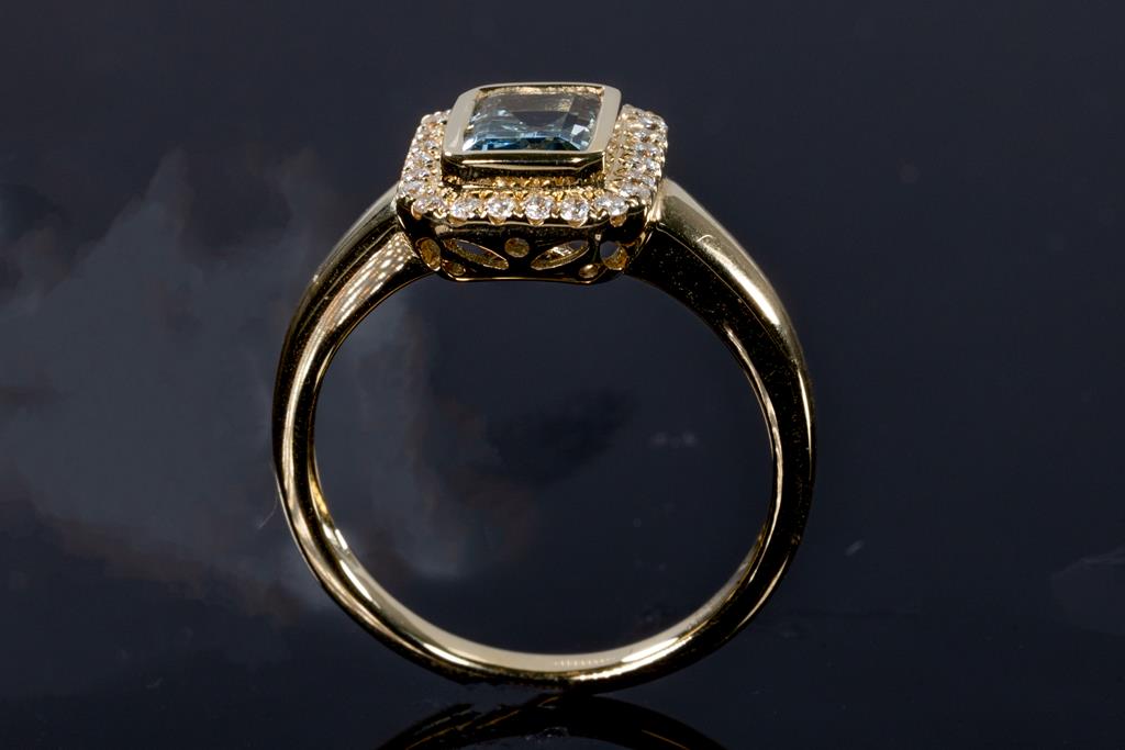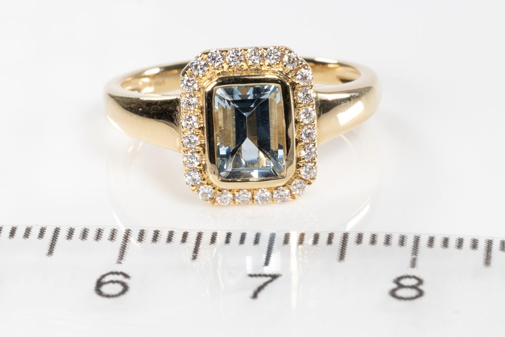 Aquamarine and Diamond ring with an emerald cut Aquamarine of 0.90ct and round Diamonds totalling 0.18cts. 14ct yellow gold. Ring size: N1/2. Weight: 3.8g. (As new)