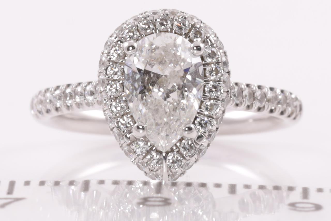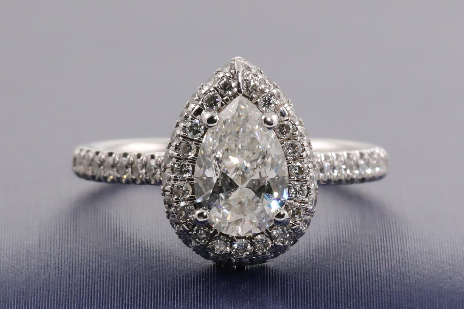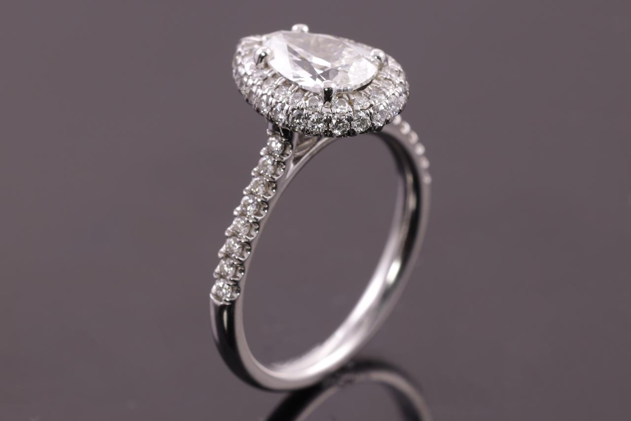 Diamond halo ring with a centre pear shape Diamond of 0.90ct (with copy of GIA summary report graded as G SI2 #2237920133) and remaining Diamonds totalling approximately 0.38cts (Estimated grading: H SI). Platinum. Ring size I1/2. Weight: 4.7g. (Pre-owned)