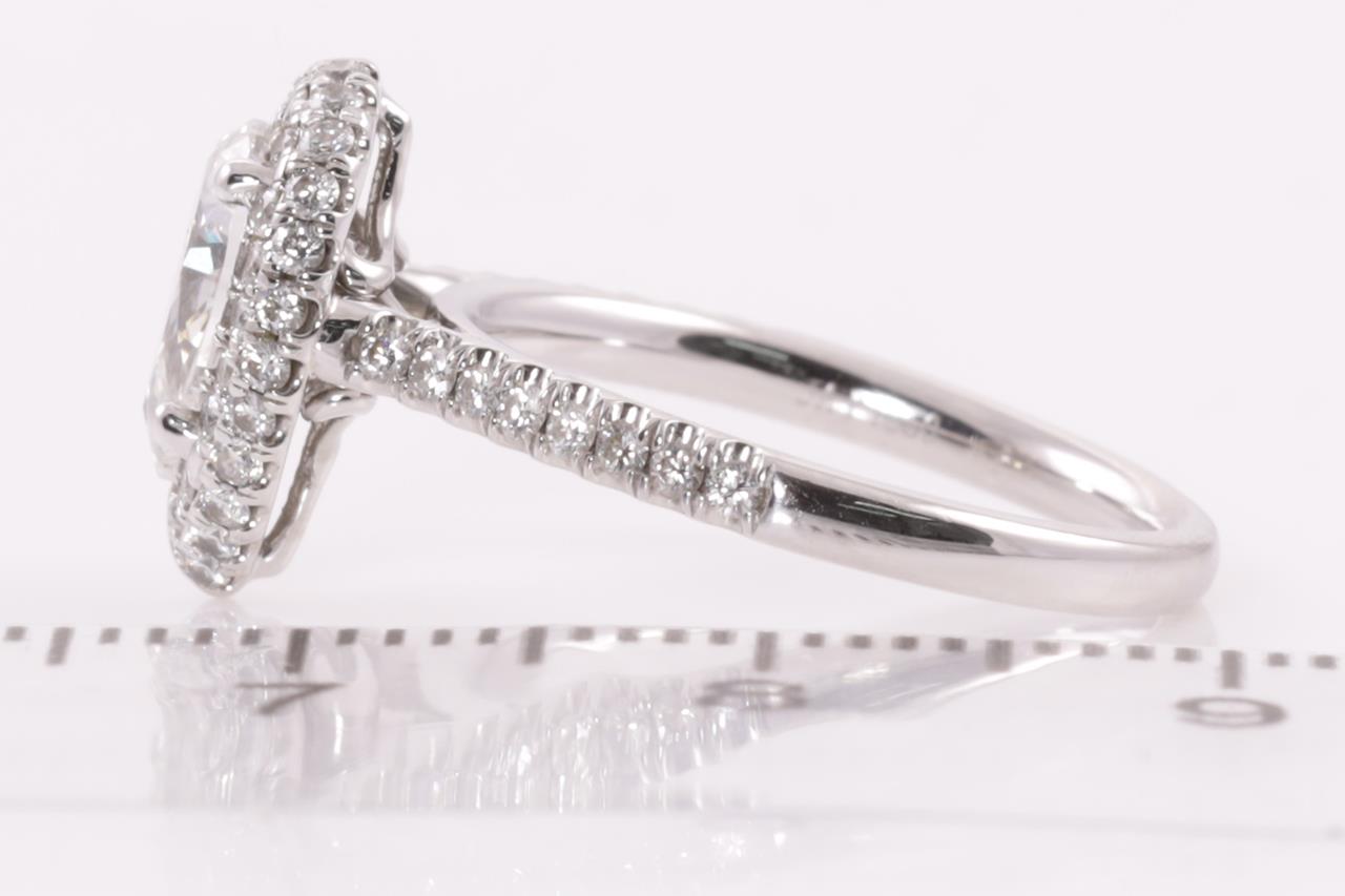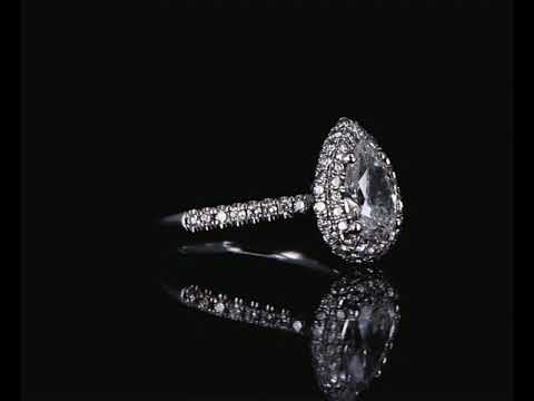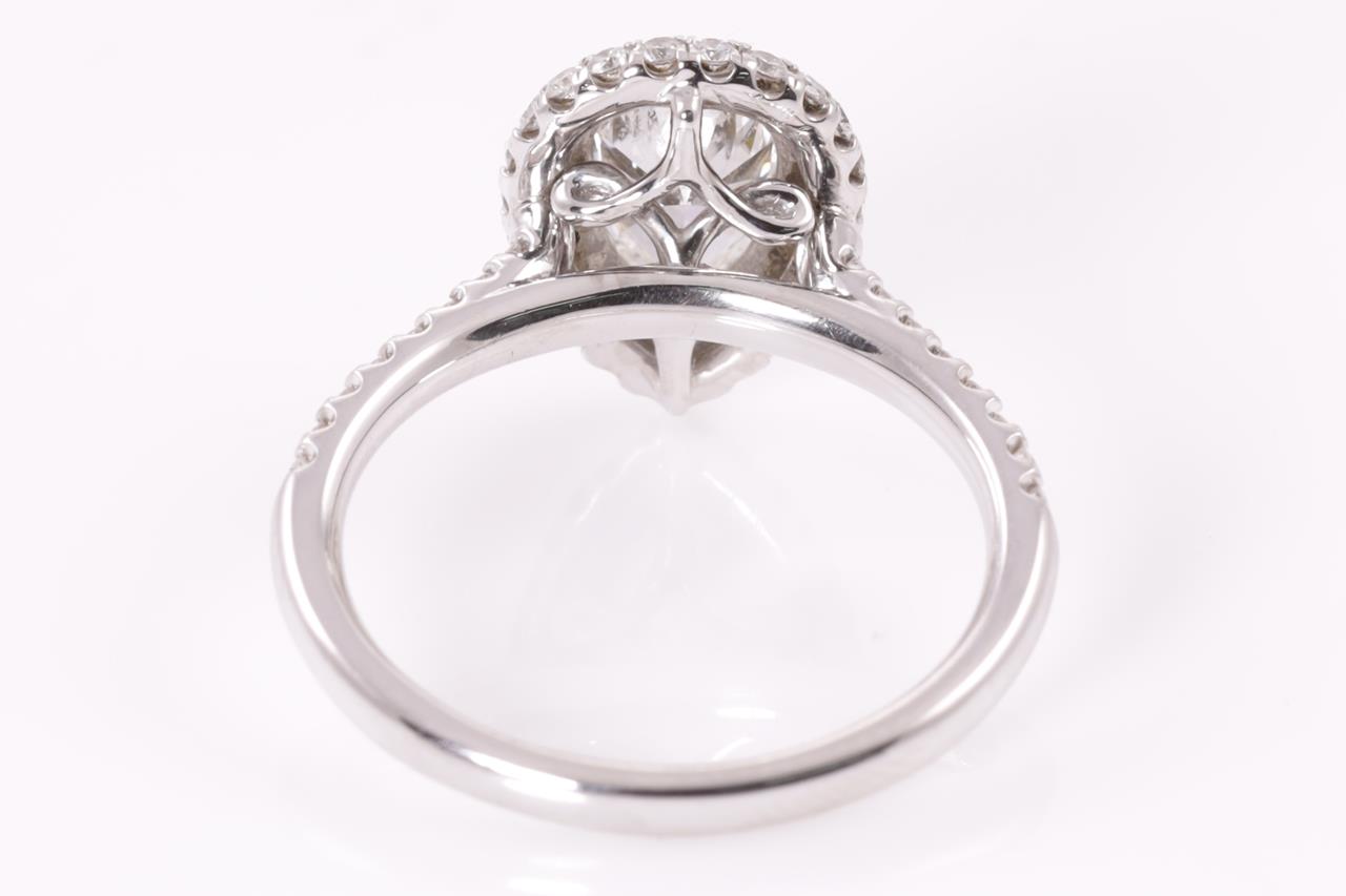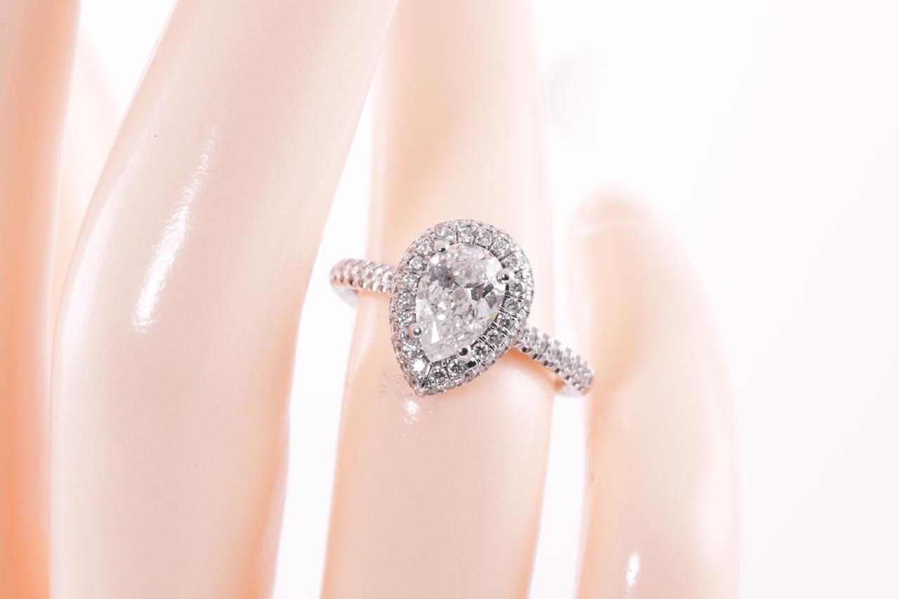 Diamond halo ring with a centre pear shape Diamond of 0.90ct (with copy of GIA summary report graded as G SI2 #2237920133) and remaining Diamonds totalling approximately 0.38cts (Estimated grading: H SI). Platinum. Ring size I1/2. Weight: 4.7g. (Pre-owned)