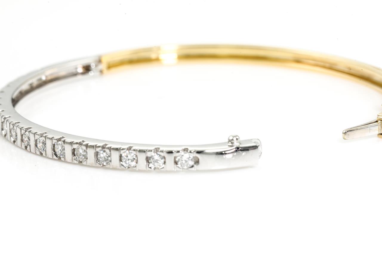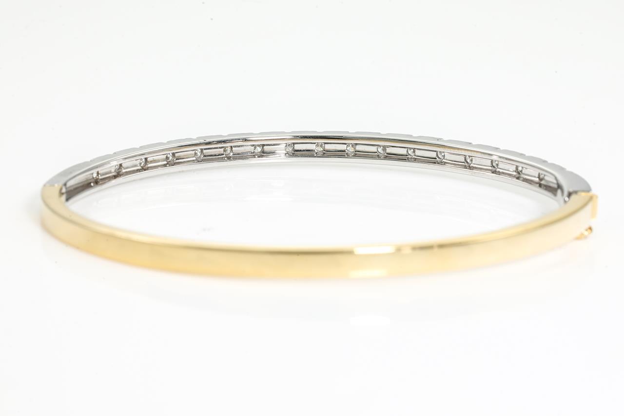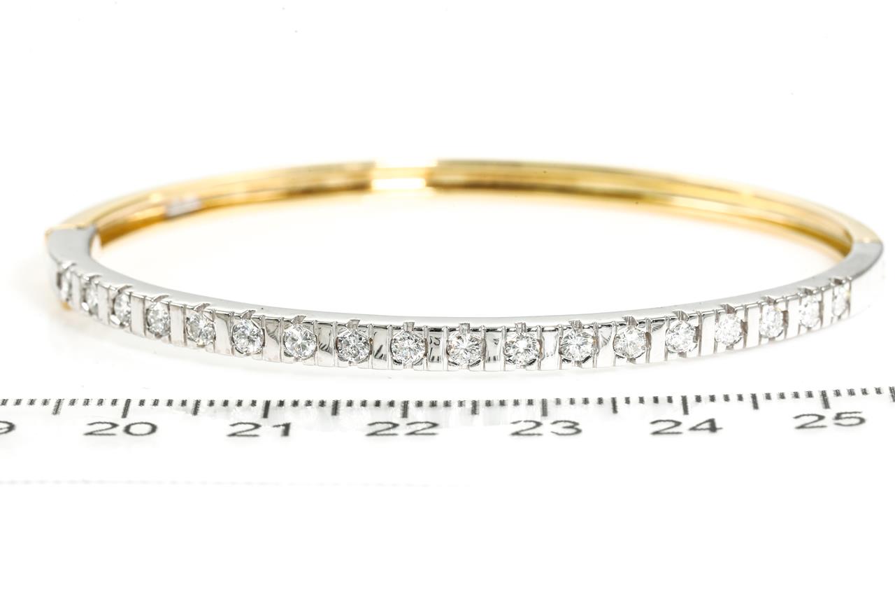Diamond Bangle with 18 round Diamonds totalling 0.90cts (Estimated grading: G-H SI). 18ct yellow and white gold. Circumference: 16.5cm. With Certificate #415403. Weight: 18.5g. (Pre-owned)