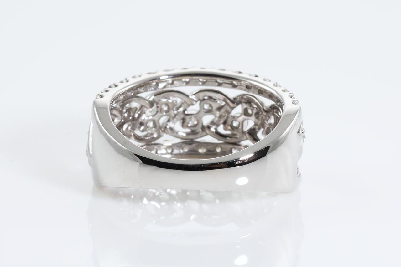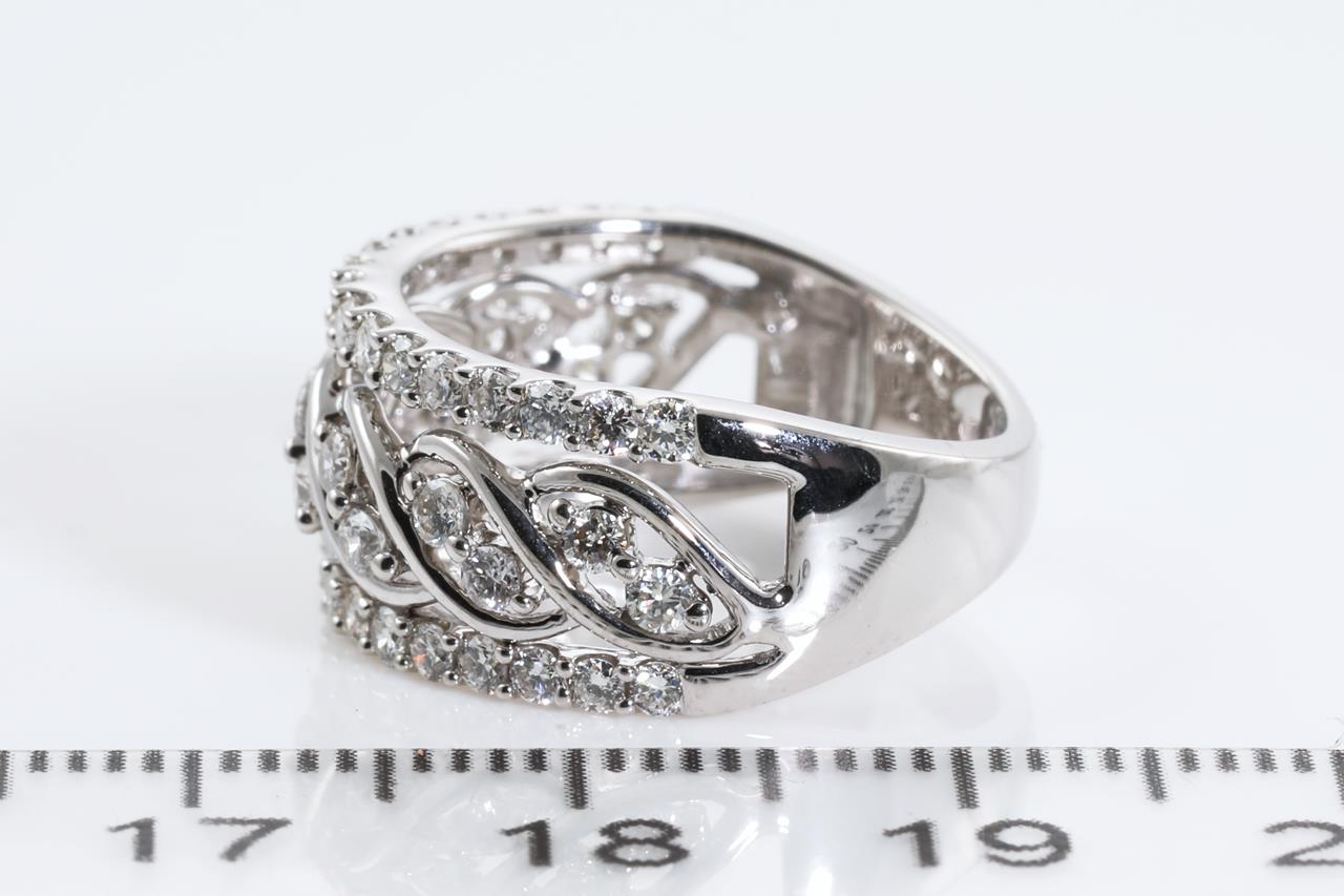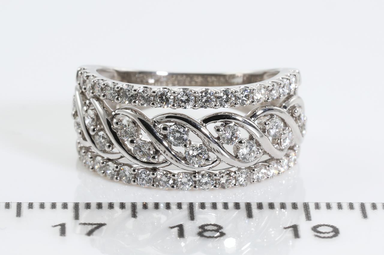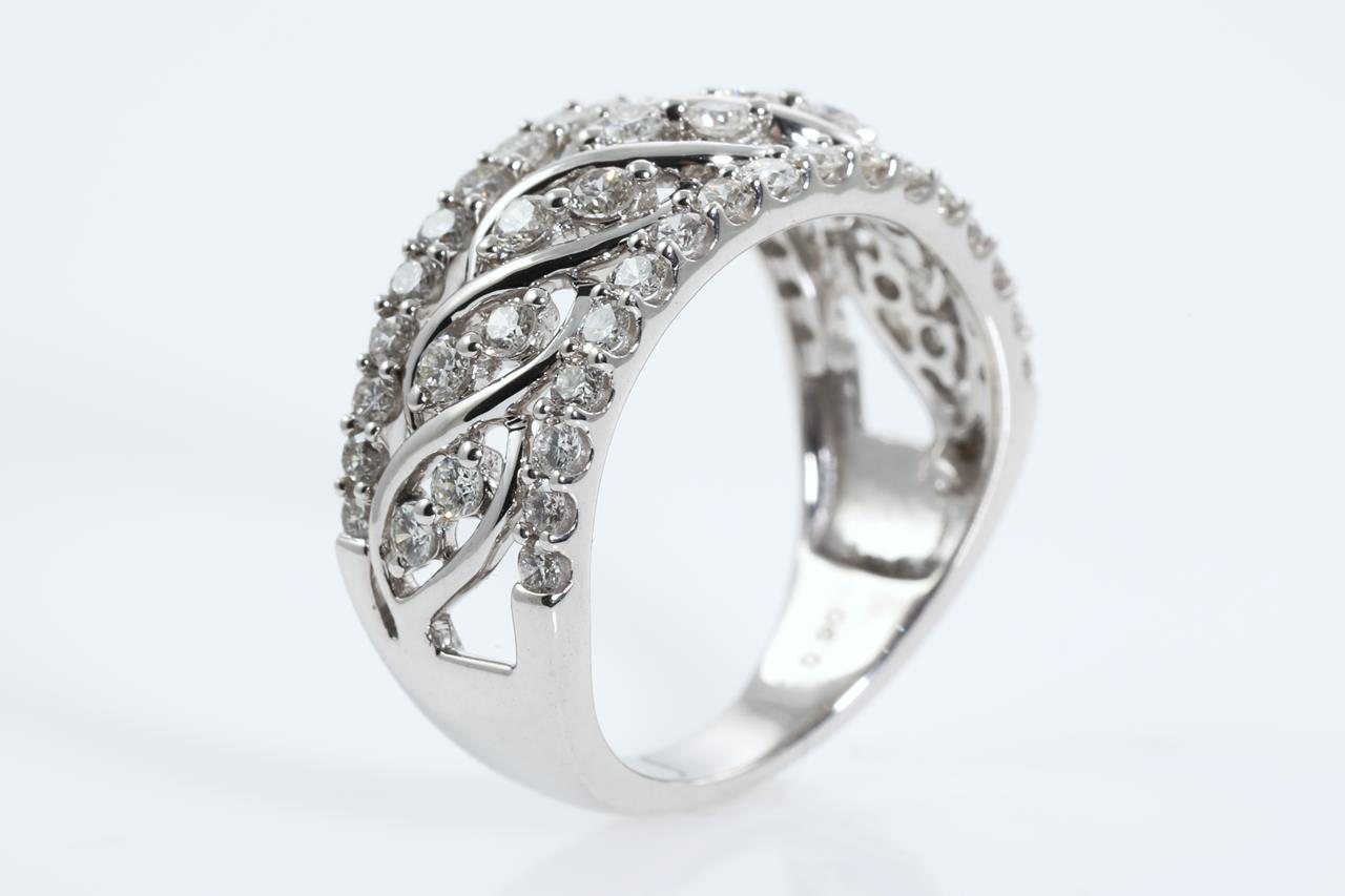 Diamond dress ring with 48 round Diamonds totalling 0.90cts (Estimated Grading: H SI). 14ct white gold. Ring size L - cannot be resized up, down with ring clip. Weight: 4.5g (New)