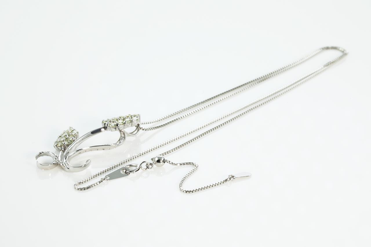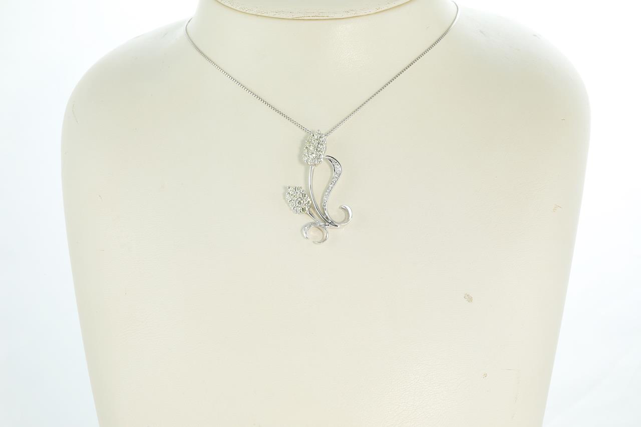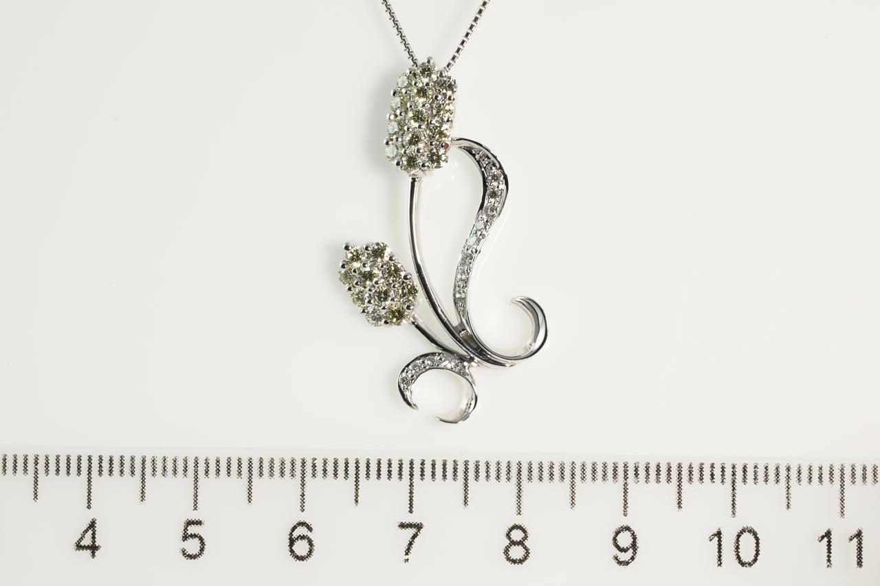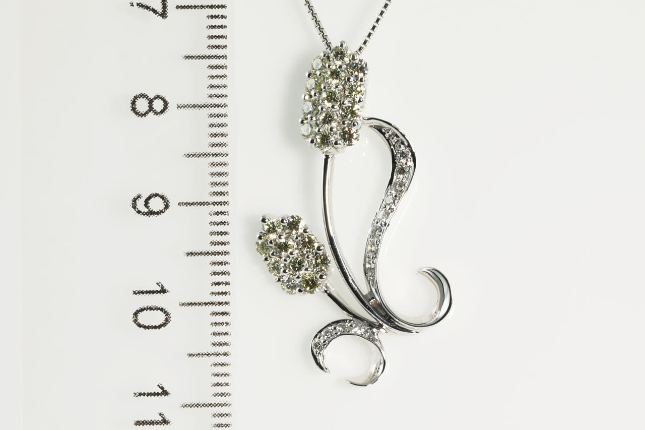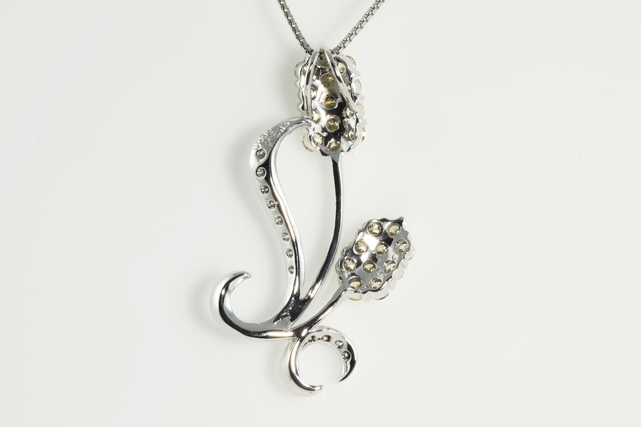Diamond flower design pendant with round white Diamonds and natural light yellow Diamonds totalling 0.90cts (Estimated clarity: VS). 18ct white gold with 18ct gold adjustable 45cm chain. Weight: 5.7g (Pre-owned)