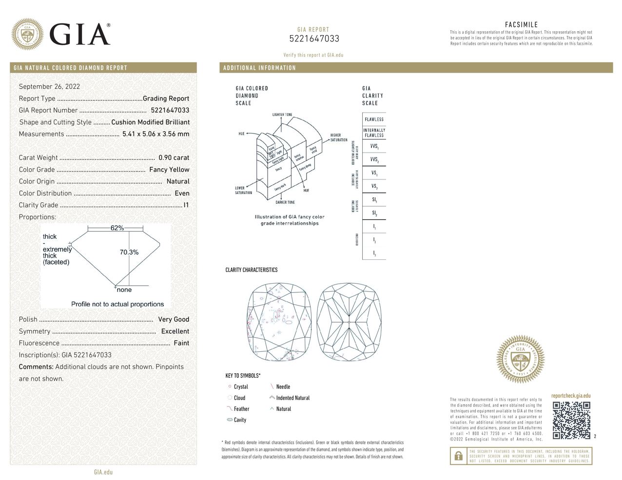 A loose cushion cut Diamond of 0.90ct (with GIA report graded as Natural Fancy Yellow Even P1#5221647033). (New)