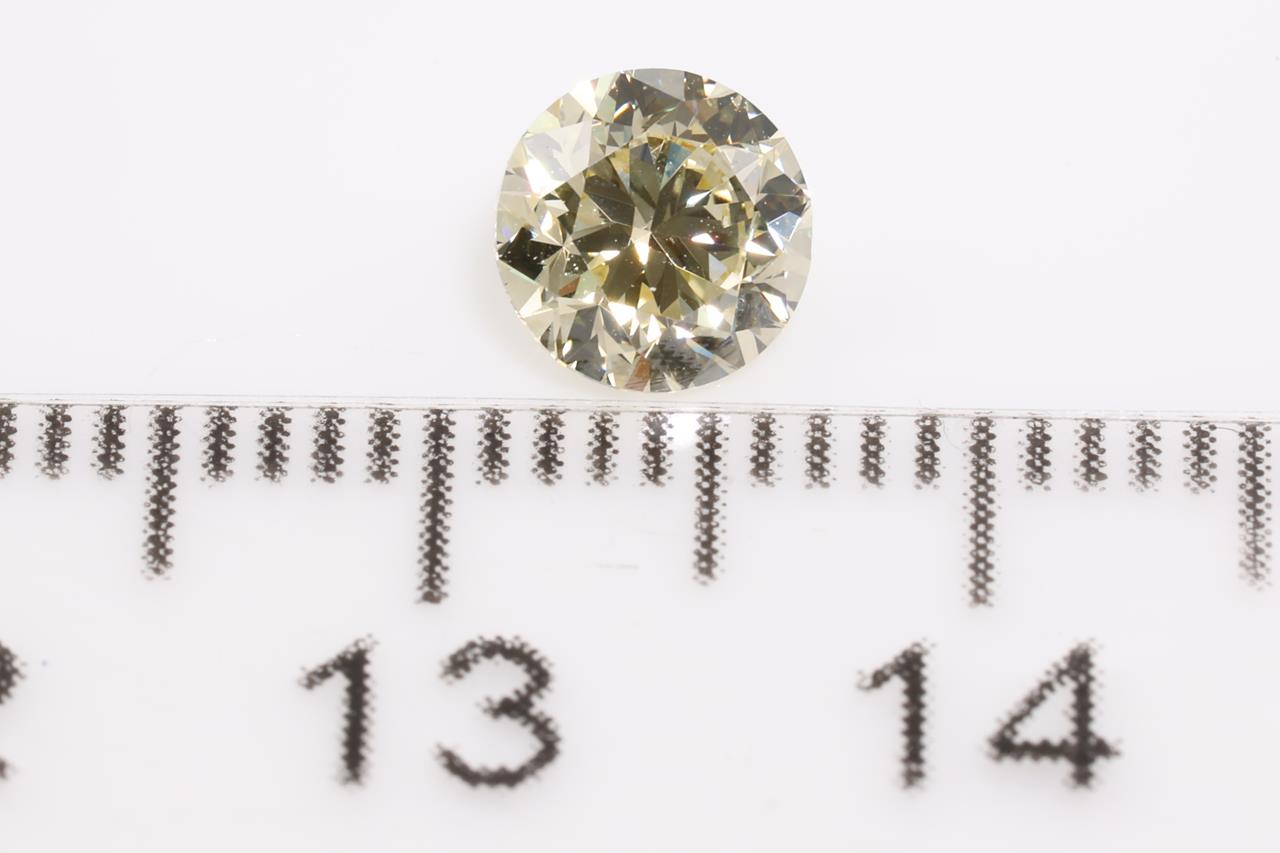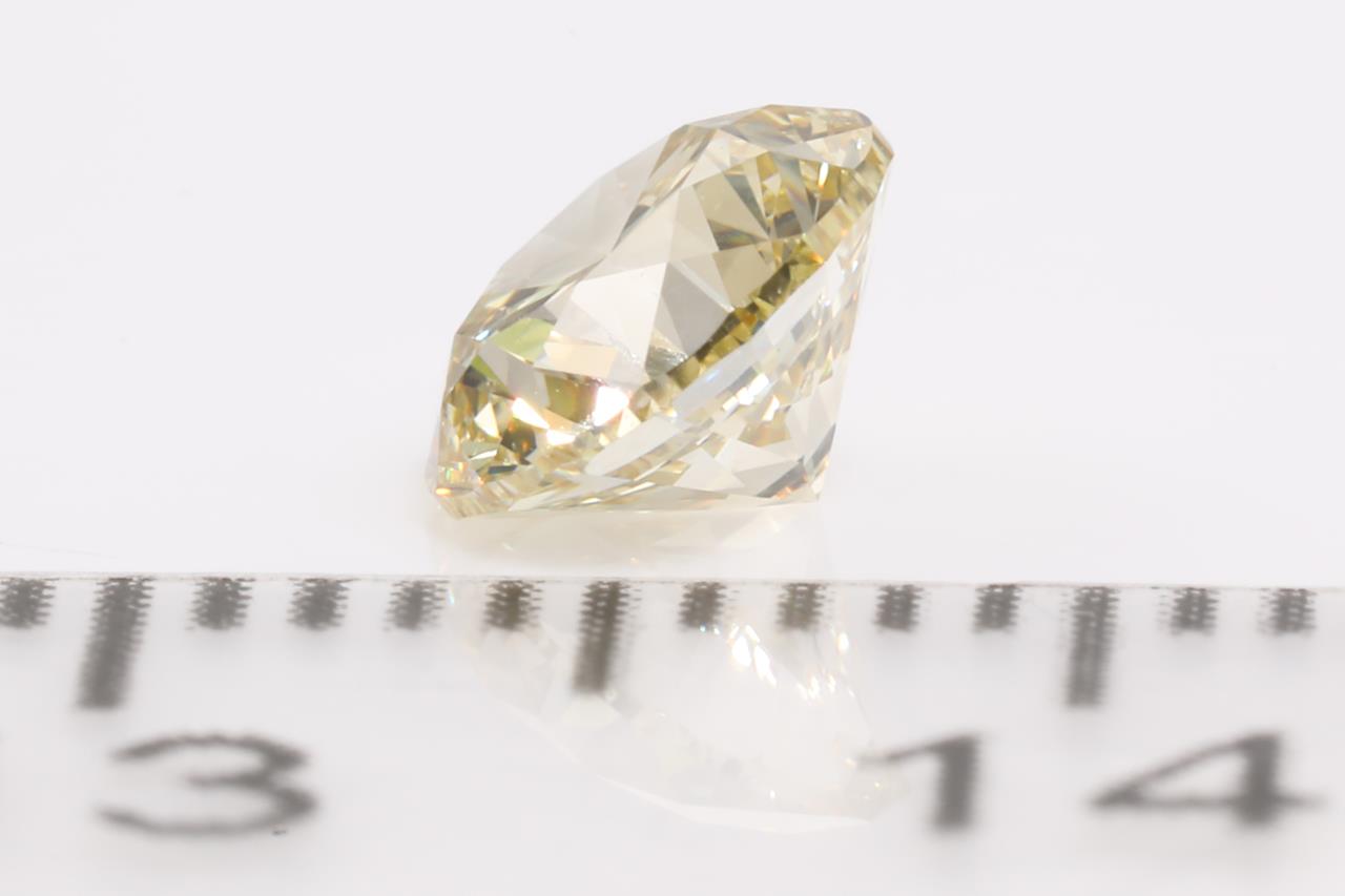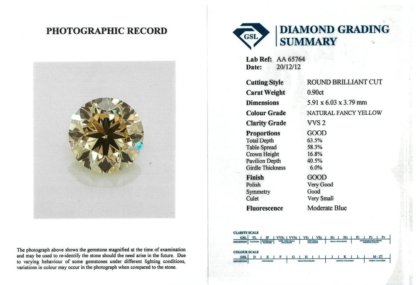 A loose round brilliant cut Fancy Yellow Diamond of 0.90ct. With GSL Summary Report graded as Natural Fancy Yellow VVS2 #AA65764). (As New)