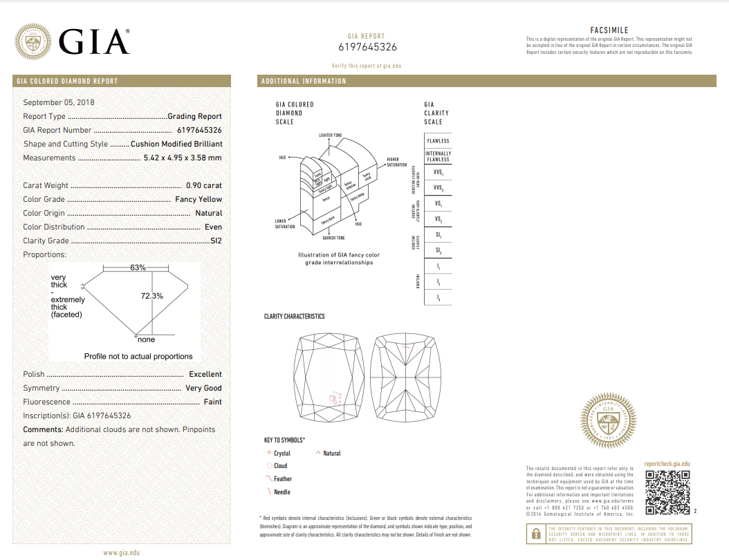 A loose Cushion Cut Diamond of 0.90ct (with GIA report graded as Natural Fancy Yellow Even SI2 #6791645326). (New)
