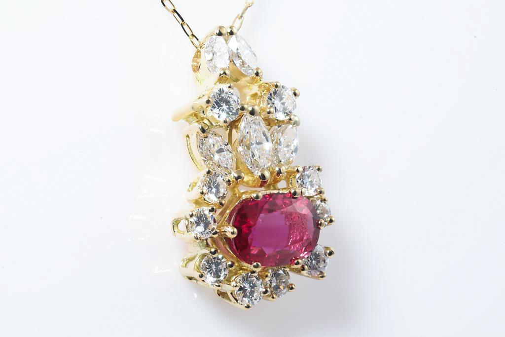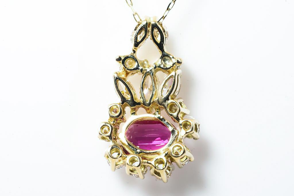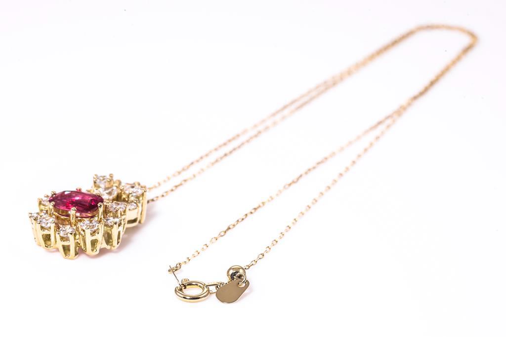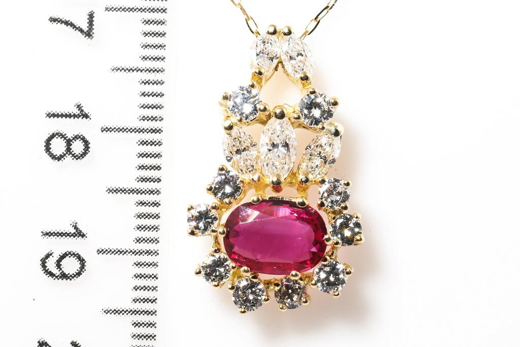 Ruby and Diamond pendant with an oval Ruby of approximately 1.00ct and round & marquise cut Diamonds totalling approximately 1.20cts (Estimated grading: G VS, H-J VS). 18ct yellow gold with adjustable 45cm chain. Weight: 5.5g. With certificate #415525. (Pre-owned)