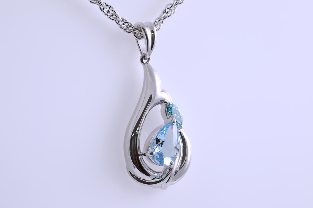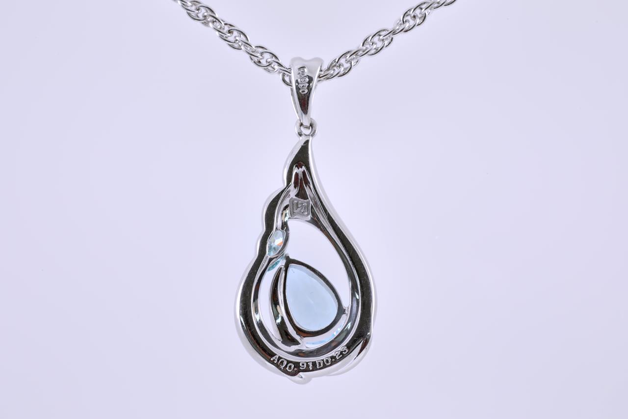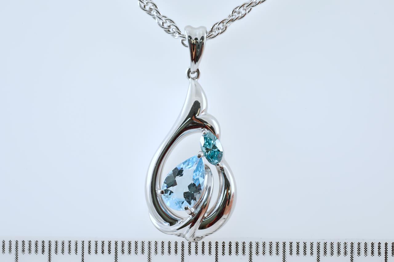 Aquamarine and Diamond pendant with pear shape Aquamarine of 0.91ct and marquise cut irradiated Blue Diamond of 0.23ct. Platinum with 45cm platinum adjustable chain. Weight: 14.9g (Pre-owned)
